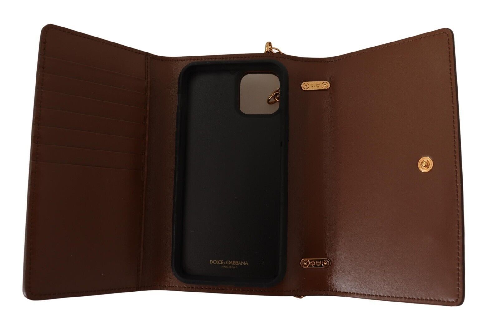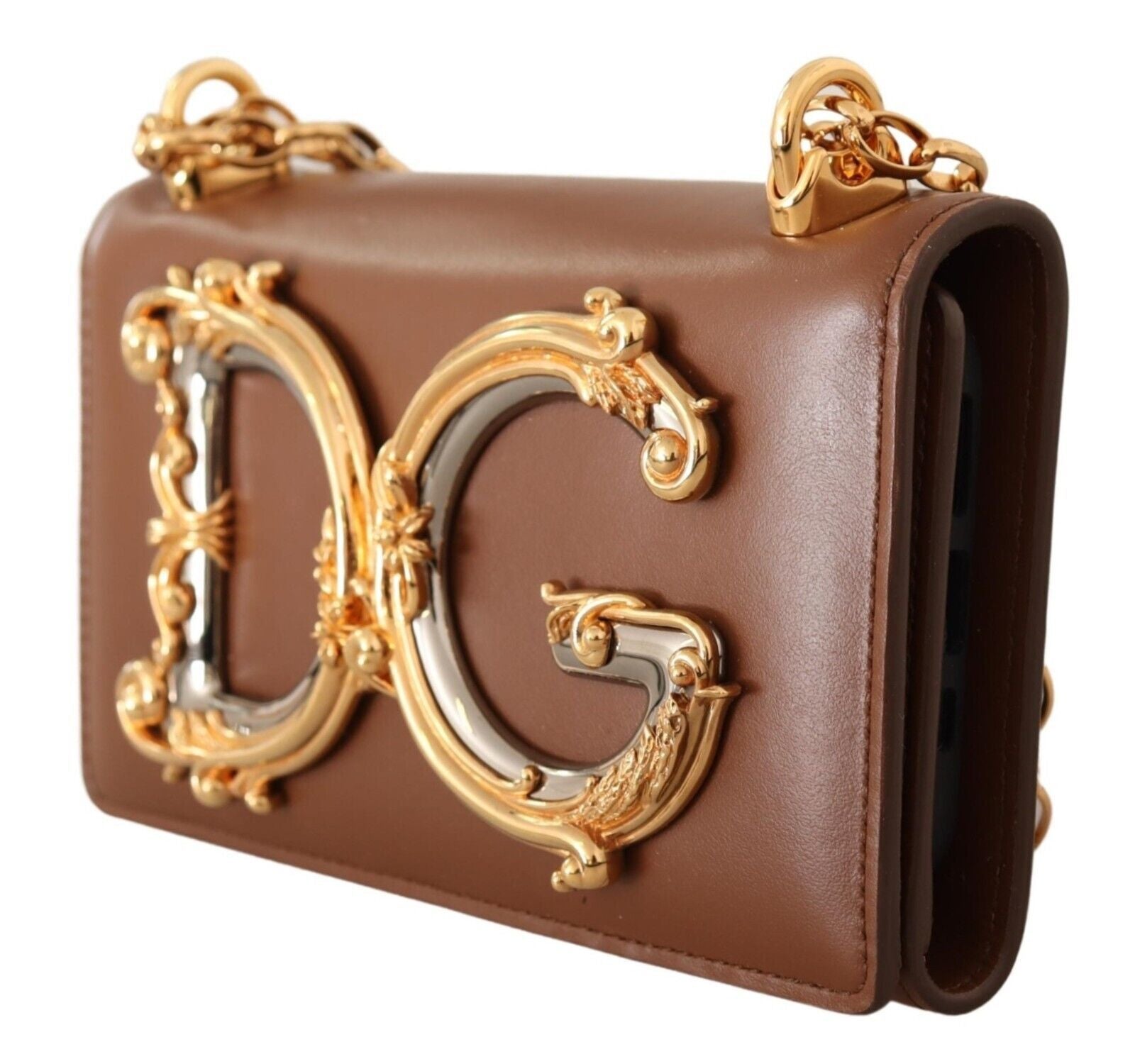 Indulge in the fusion of luxury and technology with Dolce & Gabbana’s exquisite leather clutch purse designed specifically for the iPhone11 Pro. This accessory is not just a cover case but also doubles as an elegant shoulder purse bag, making it a perfect companion for any fashion-forward individual. Meticulously crafted in Italy, it features a sleek brown hue enhanced by gold metal detailing and a versatile chain strap.