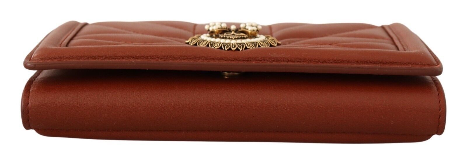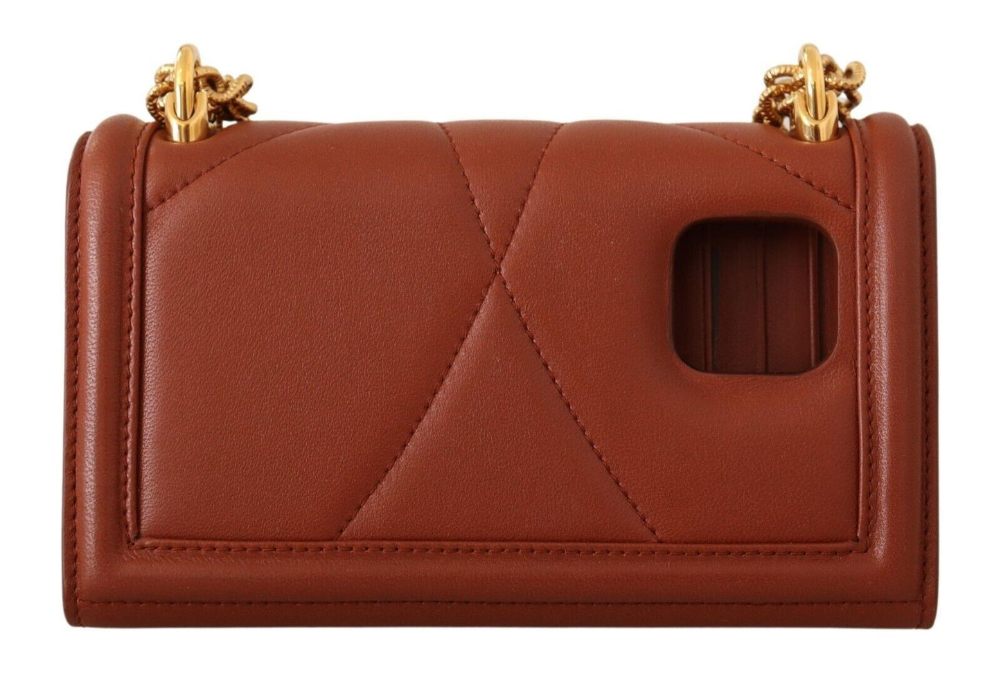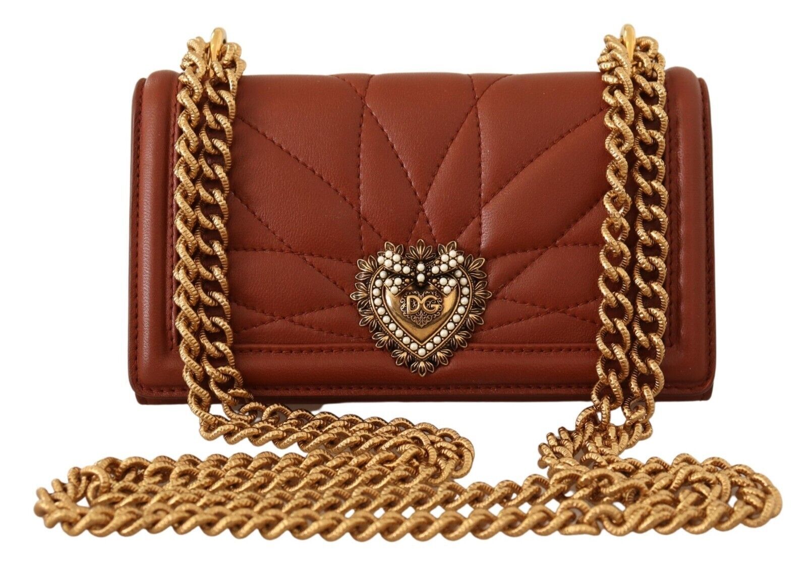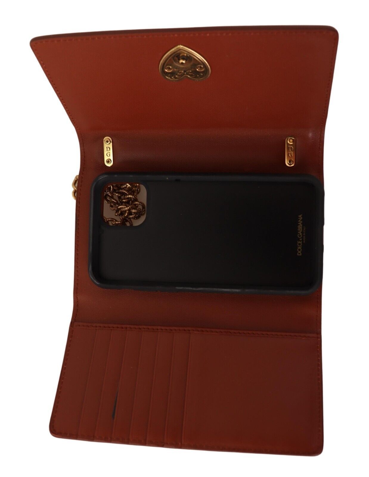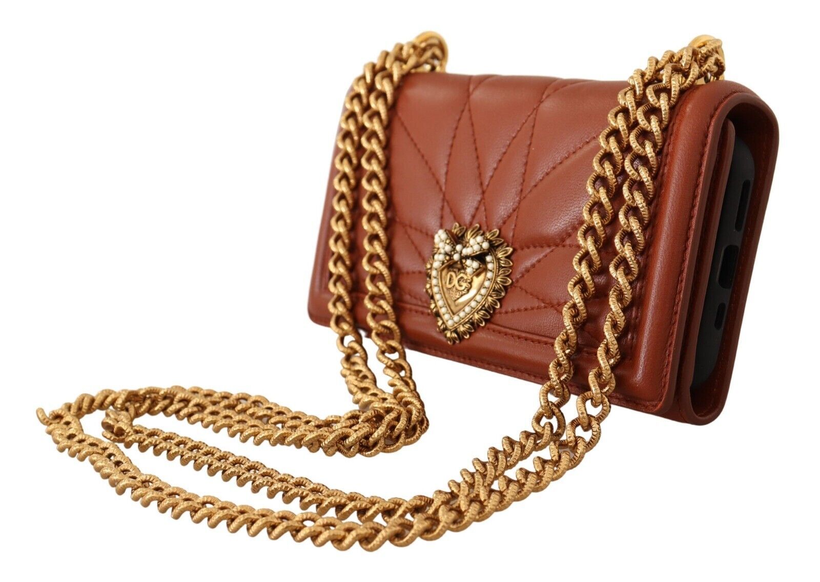 Discover the epitome of style and functionality with the Dolce & Gabbana iPhone11 Pro Clutch Purse Cover. Indulge in the stunning craftsmanship and luxurious material of this Devotion model accessory. Designed to enhance your look while safeguarding your device, it features a rich brown hue complemented by opulent gold metal detailing. Inside, you’ll find convenient card slots and a brown leather lining. Secure your essentials with the elegant magnet flap closure and carry it effortlessly with the chic chain strap.
