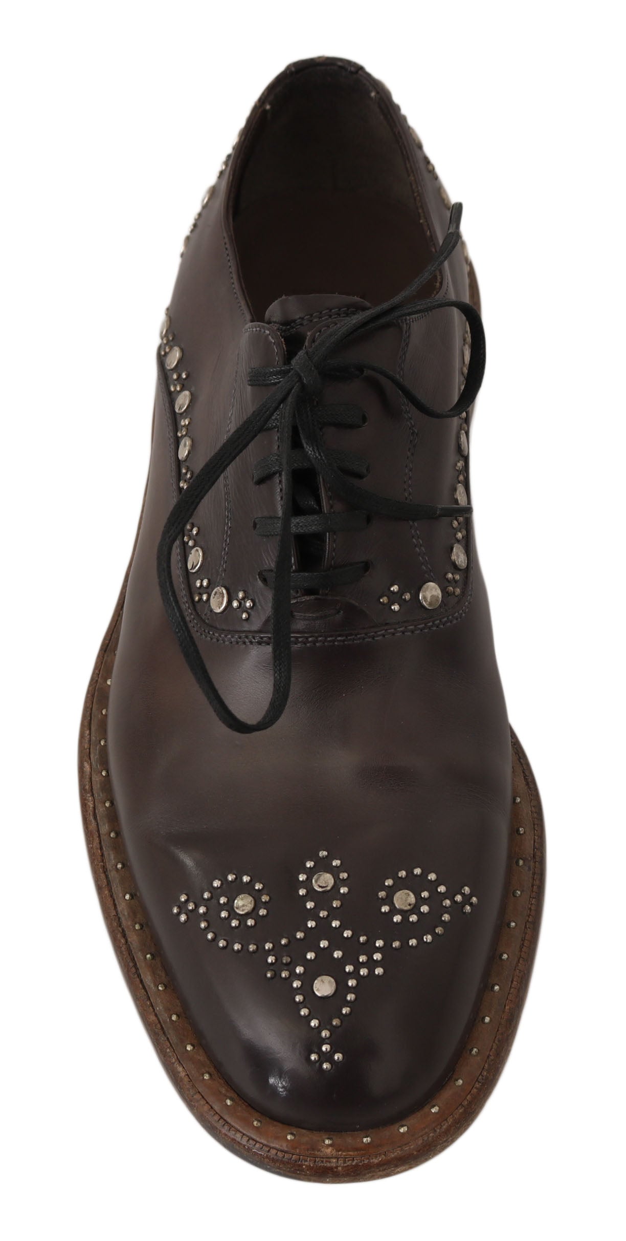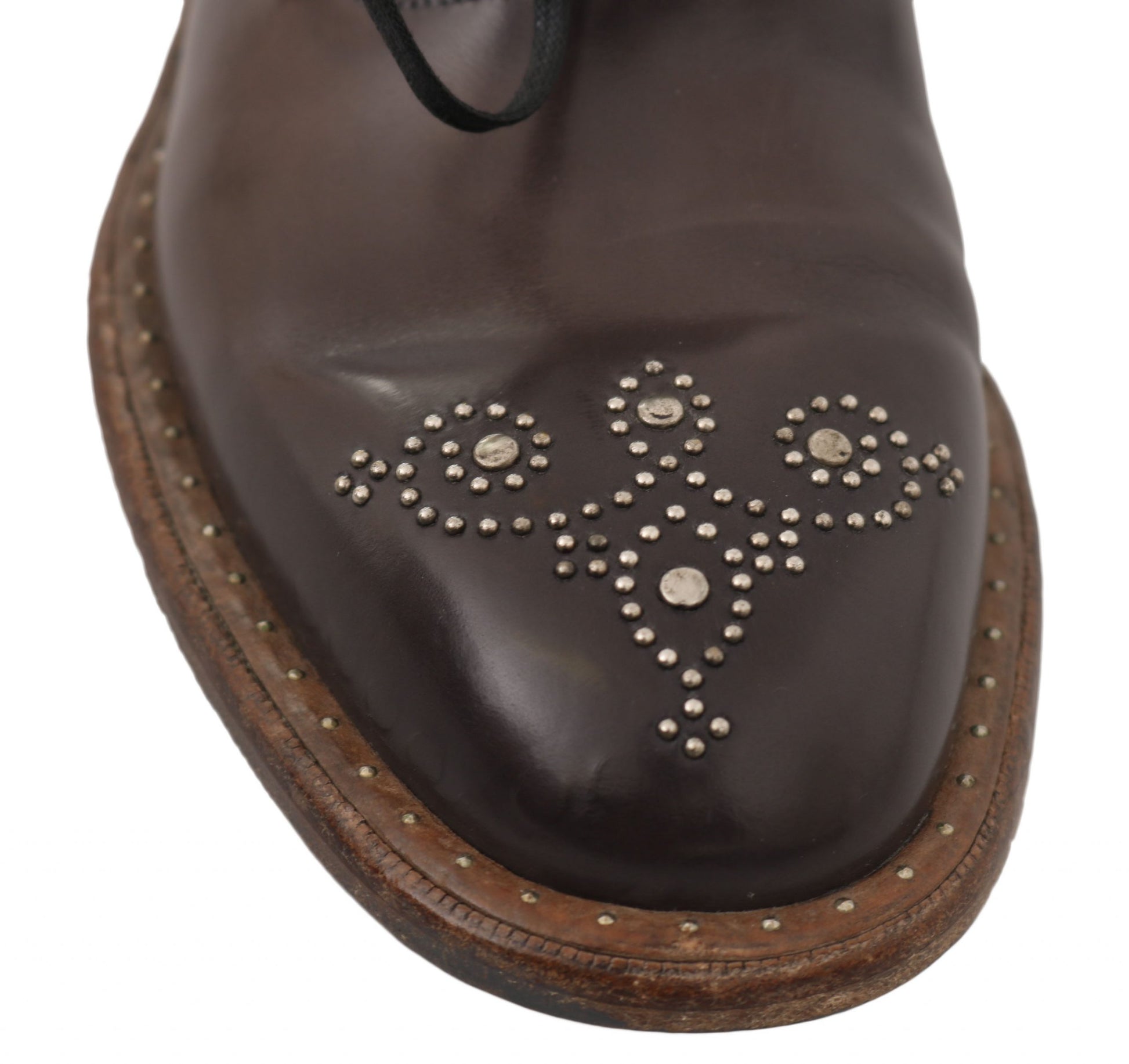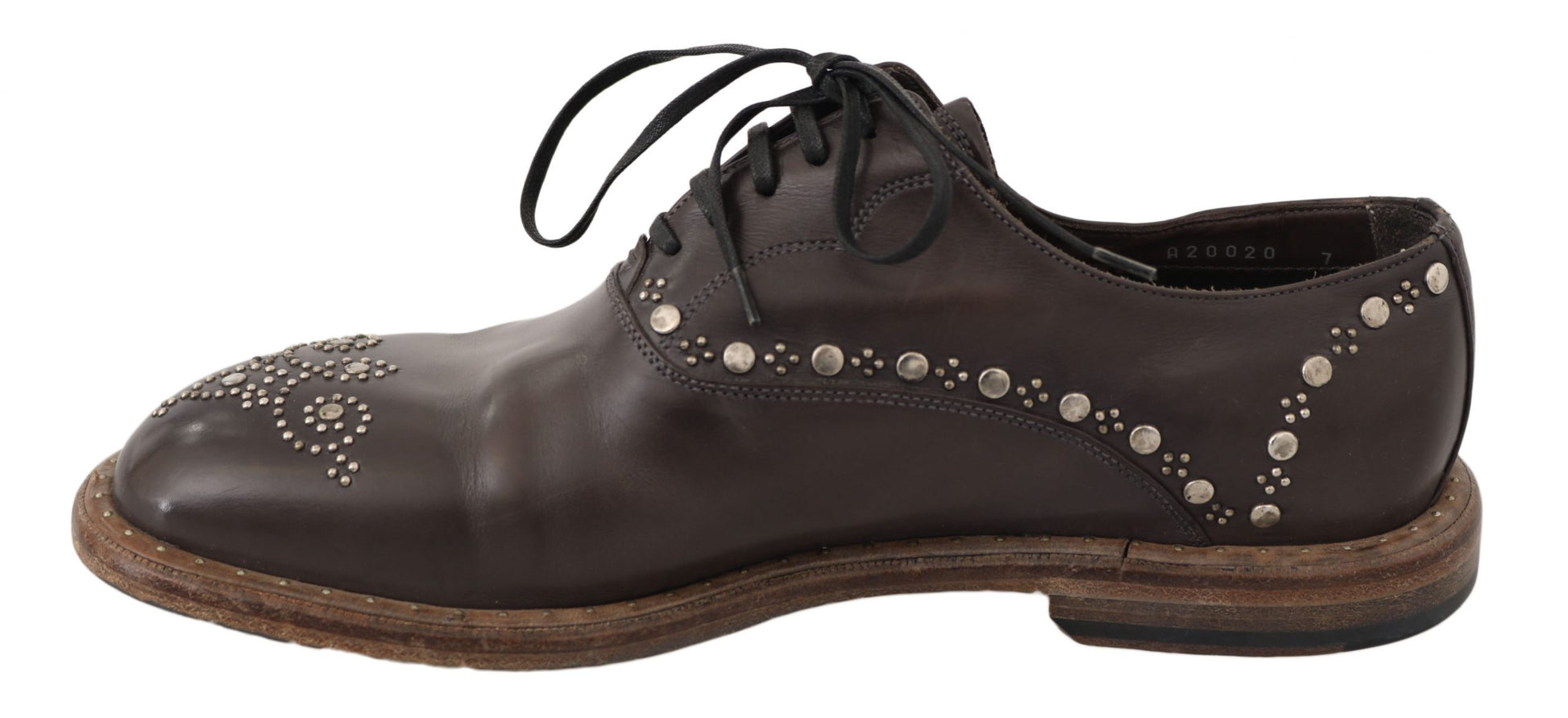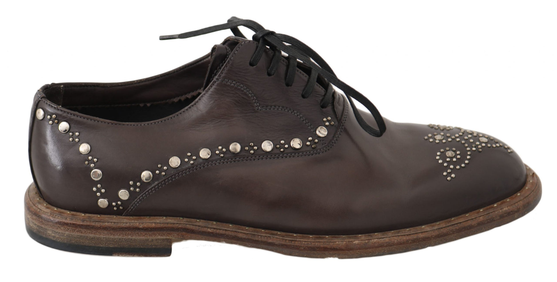 Step into luxury with these exquisite Dolce & Gabbana Derby dress shoes. Crafted from premium leather, these brown formal shoes feature silver stud embellishments for an opulent touch. Perfectly balancing style and craftsmanship, they’re an essential for any discerning gentleman’s wardrobe. Made in Italy with a commitment to quality and attention to detail, these shoes are adorned with the iconic logo and are set on a sturdy leather sole, ensuring both durability and elegance.