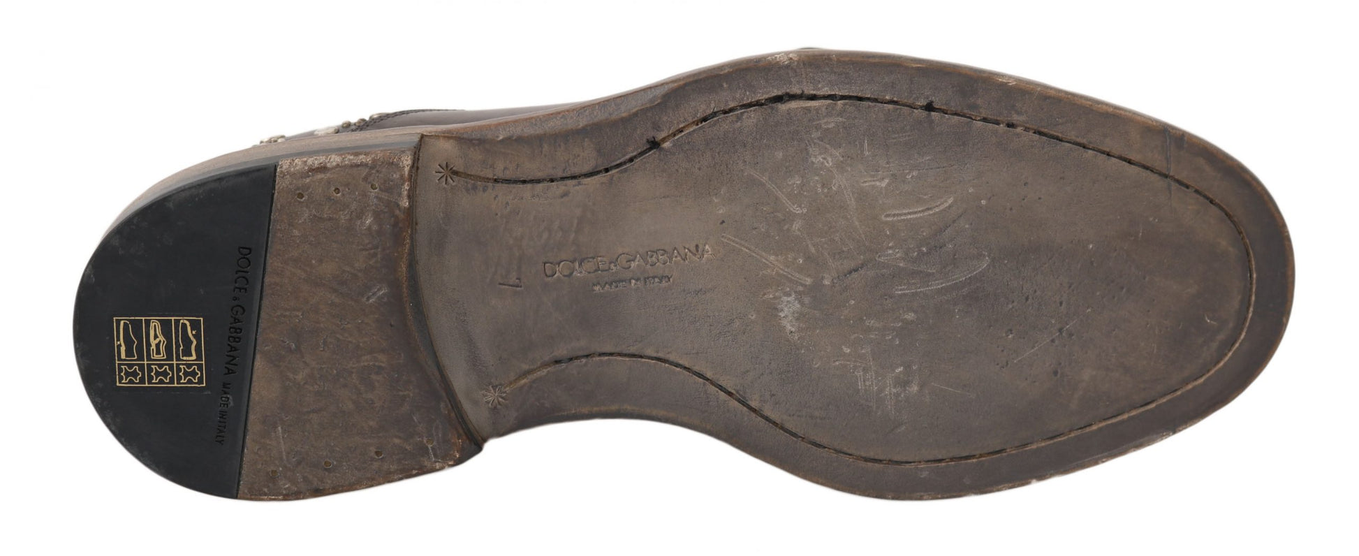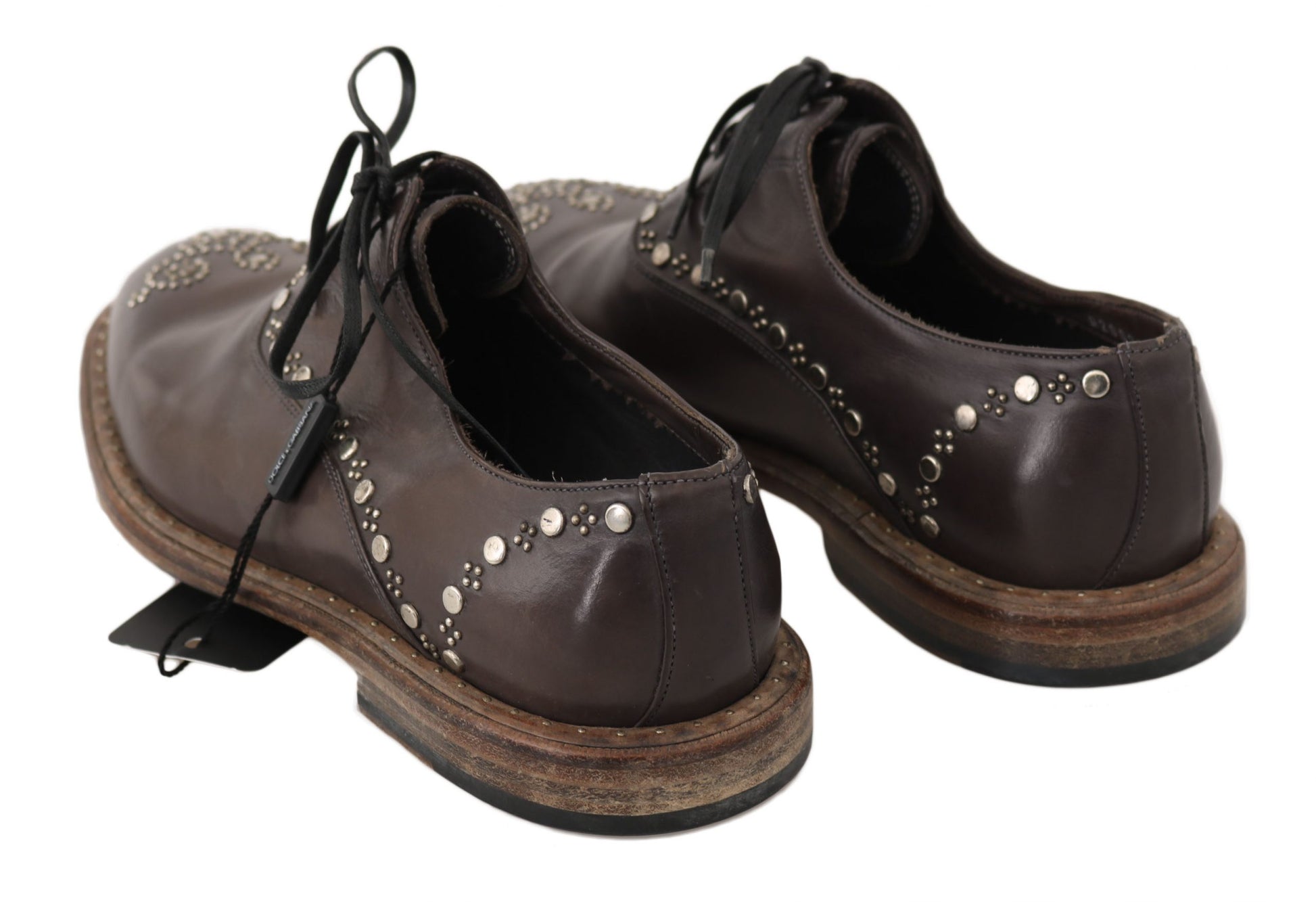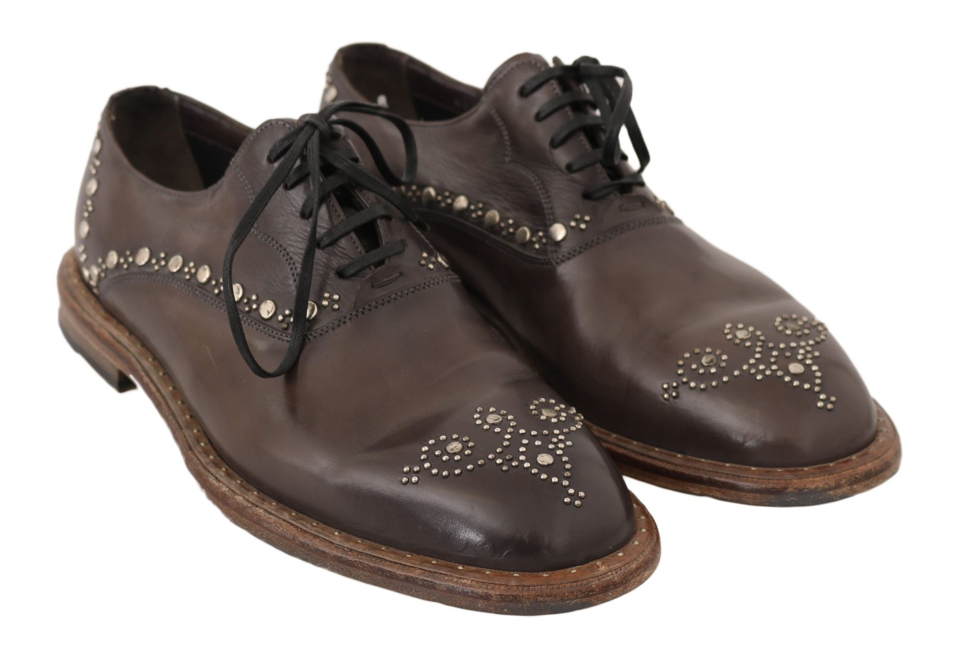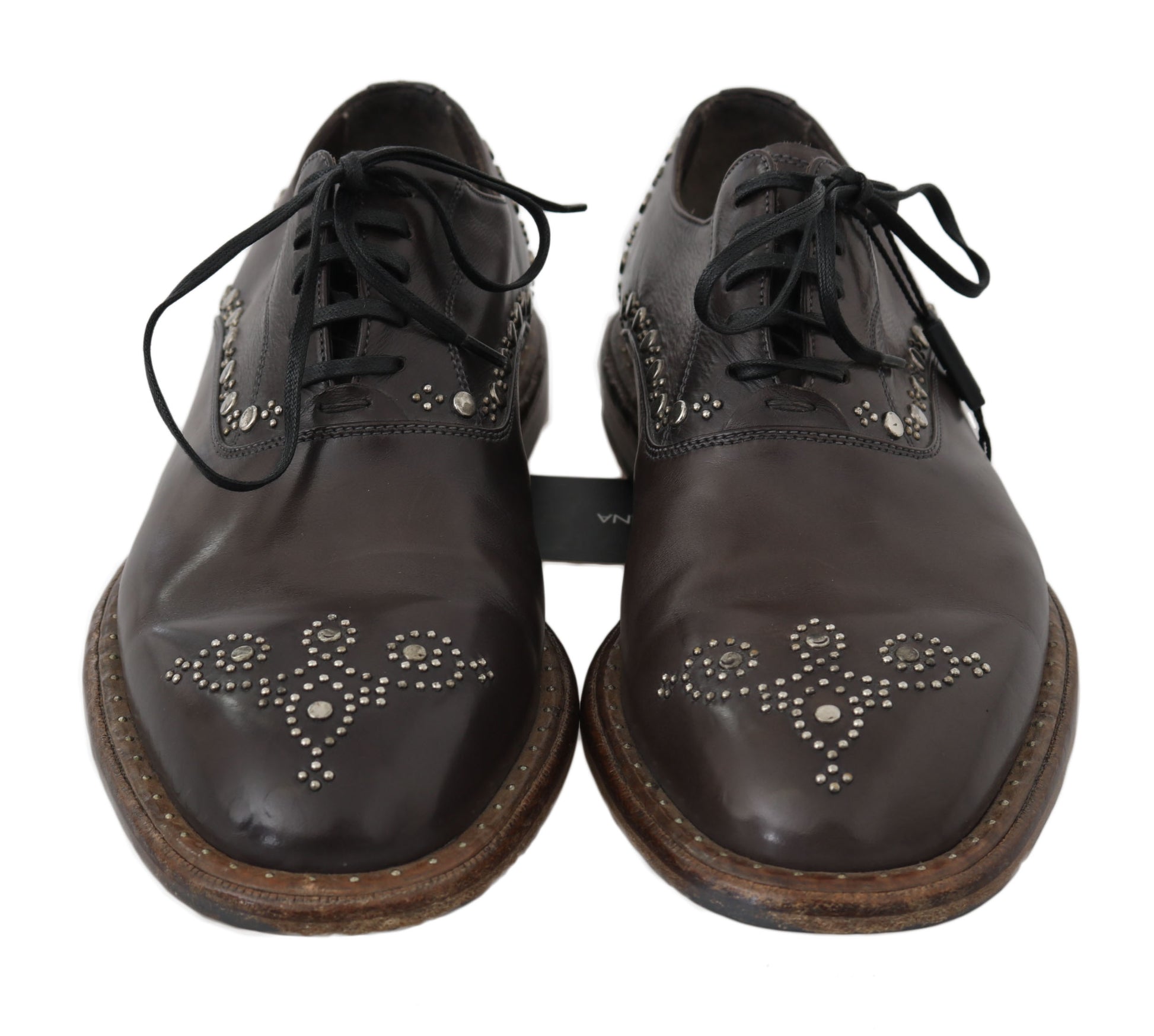 Step into luxury with these exquisite Dolce & Gabbana Derby dress shoes. Crafted from premium leather, these brown formal shoes feature silver stud embellishments for an opulent touch. Perfectly balancing style and craftsmanship, they’re an essential for any discerning gentleman’s wardrobe. Made in Italy with a commitment to quality and attention to detail, these shoes are adorned with the iconic logo and are set on a sturdy leather sole, ensuring both durability and elegance.