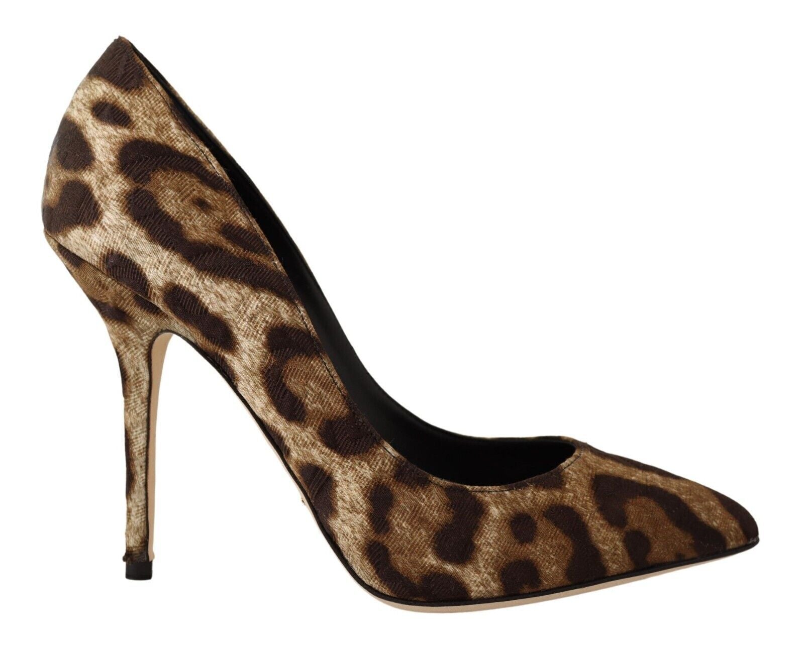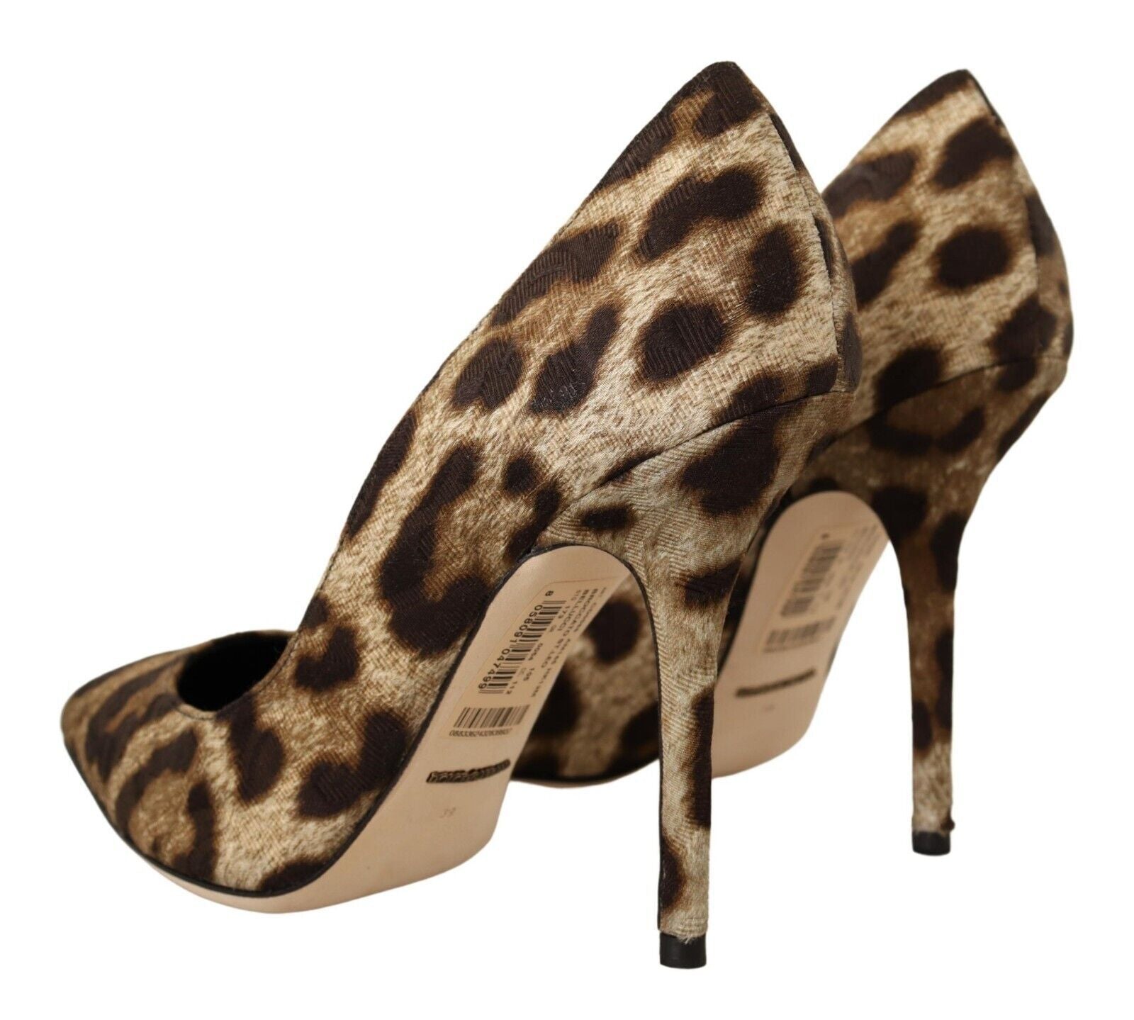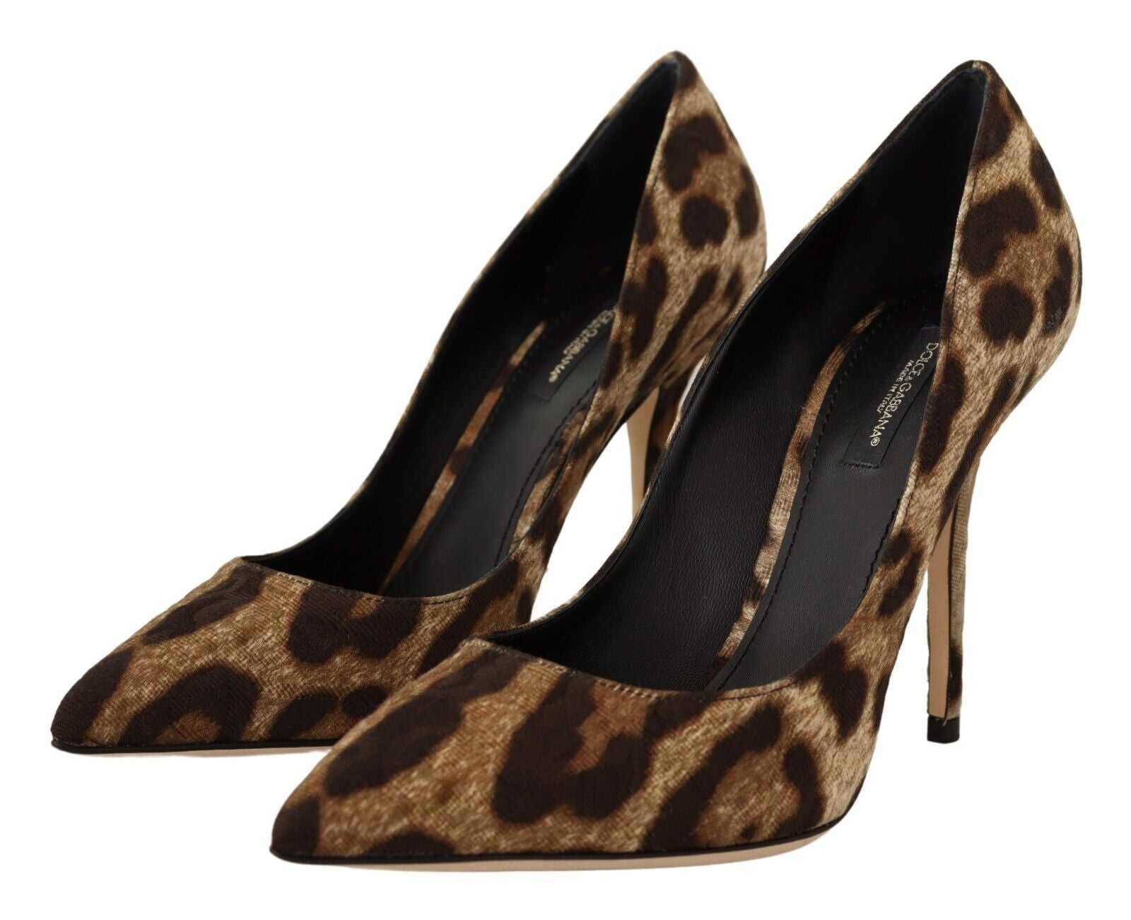 Step into high-end style with these Gorgeous, brand new stiletto pumps from Dolce & Gabbana. These heels feature a stunning brown leopard pattern on luxurious brocade material, complete with a leather bottom sole and the iconic logo details. Experience Italian craftsmanship and elevate your shoe collection with this exquisite pair, perfect for making a statement at any event.
