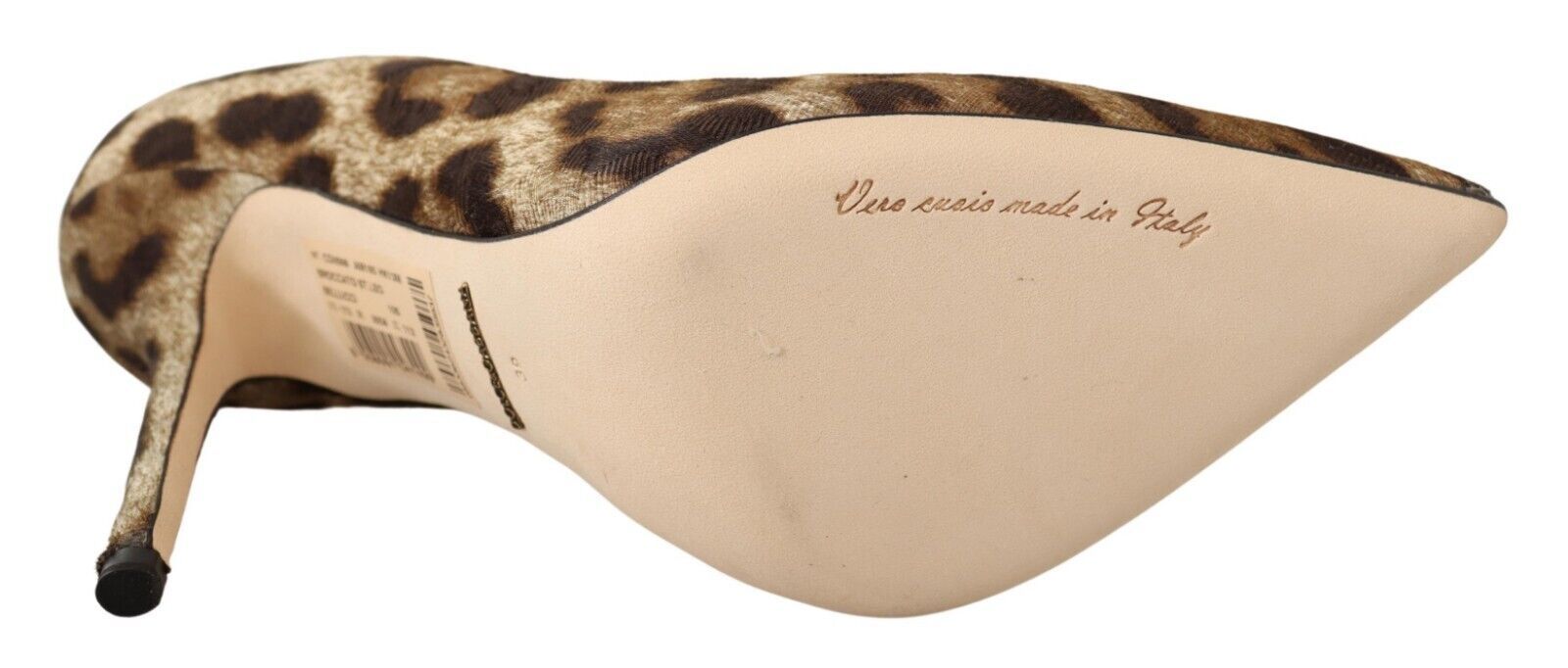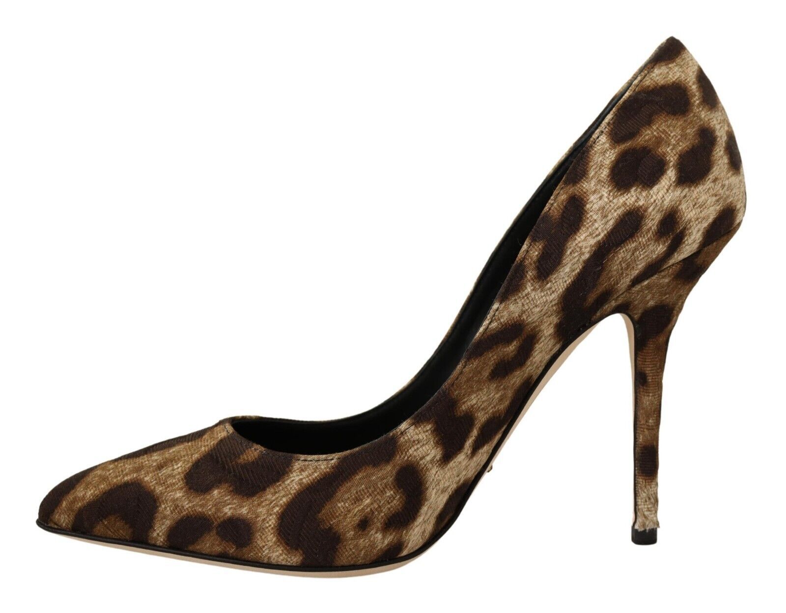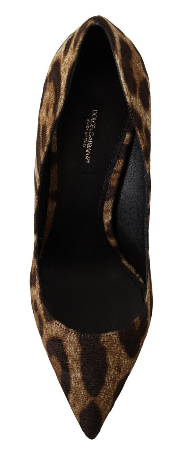 Step into high-end style with these Gorgeous, brand new stiletto pumps from Dolce & Gabbana. These heels feature a stunning brown leopard pattern on luxurious brocade material, complete with a leather bottom sole and the iconic logo details. Experience Italian craftsmanship and elevate your shoe collection with this exquisite pair, perfect for making a statement at any event.