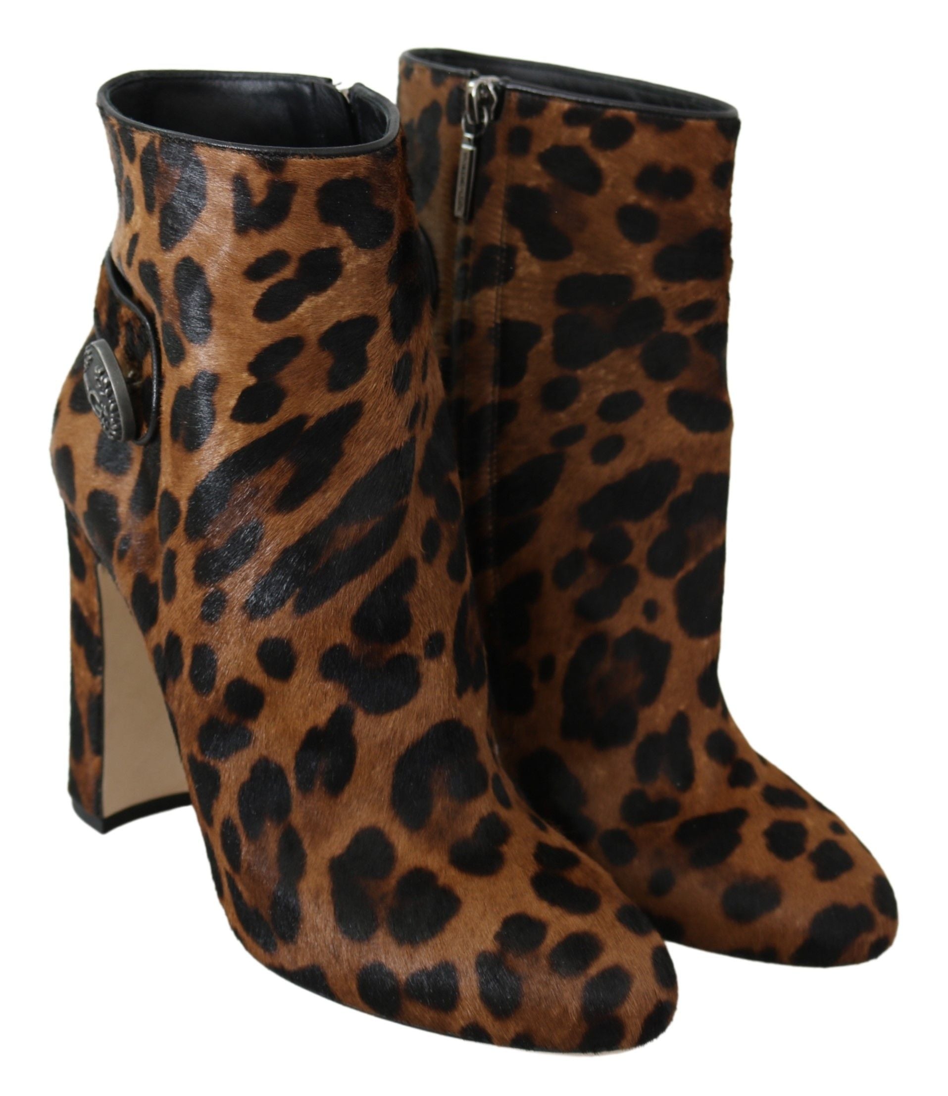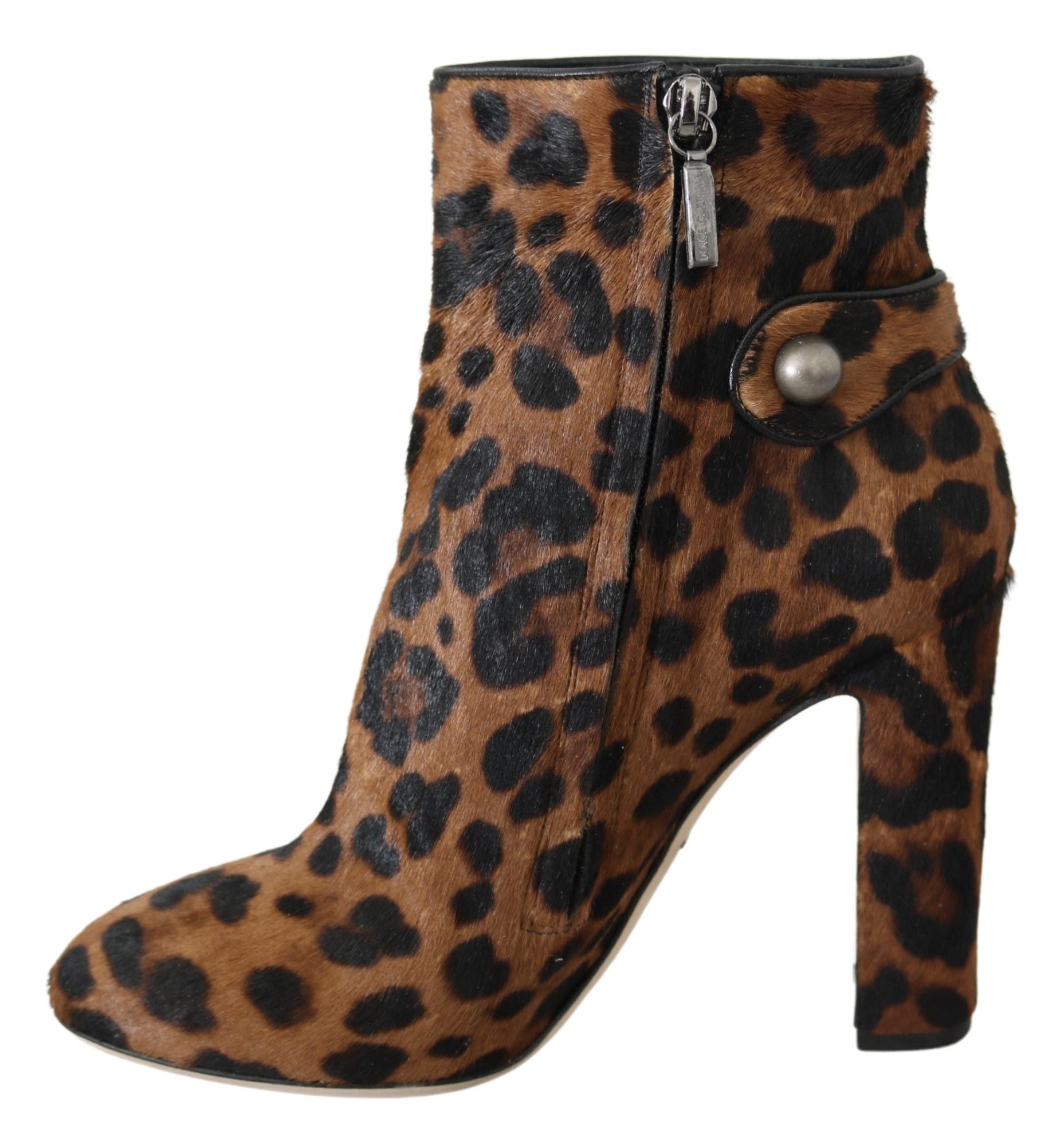 Embrace your wild side with these stunning leopard-print calf hair ankle boots from Dolce & Gabbana. Adorned with branded button details and crafted from 100% leather, these boots ensure both high-quality and comfort. Made in Italy, they feature a durable rubber and leather sole with convenient zipper opening on the side. Step out in style and luxury with these exquisite boots that effortlessly elevate any outfit.