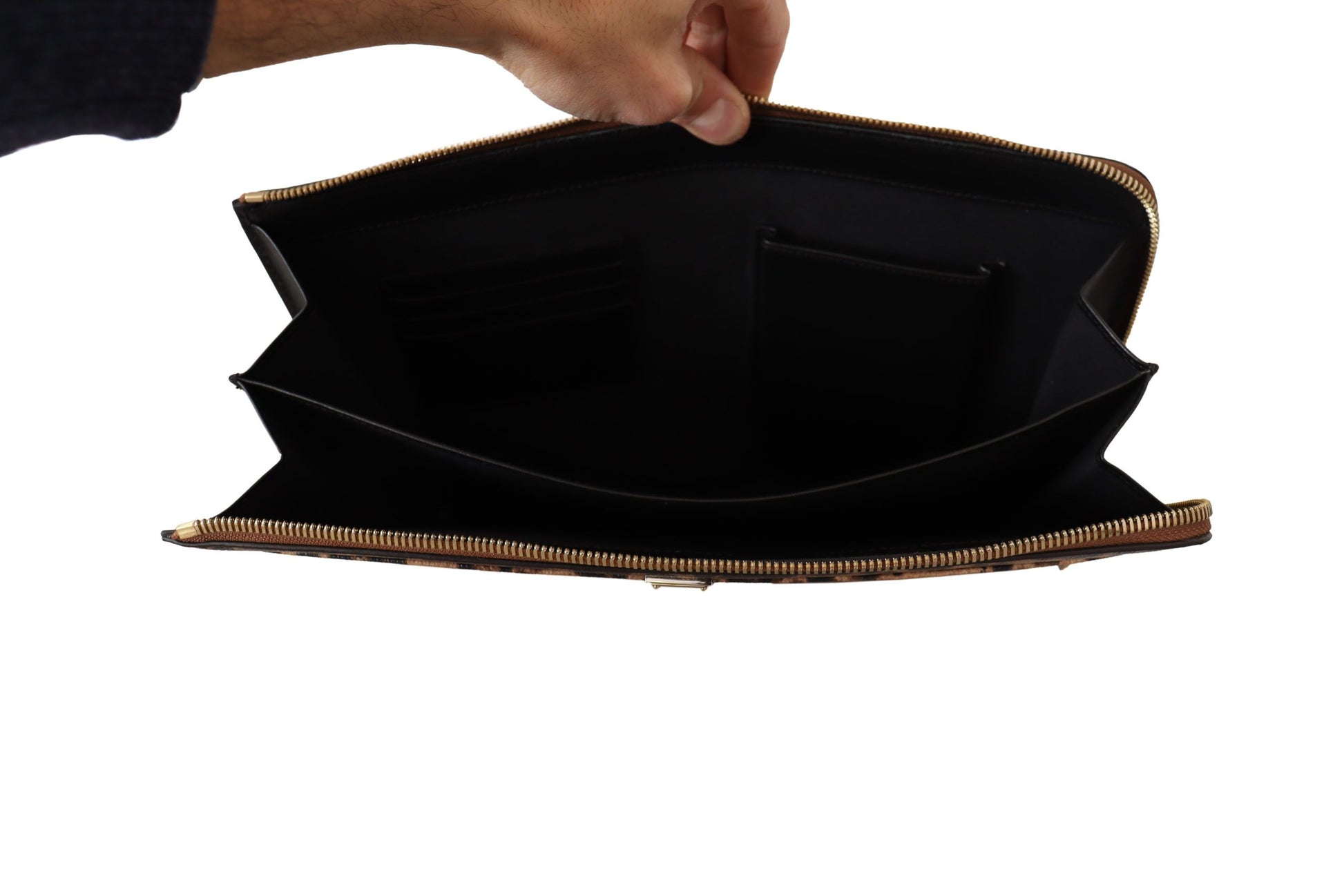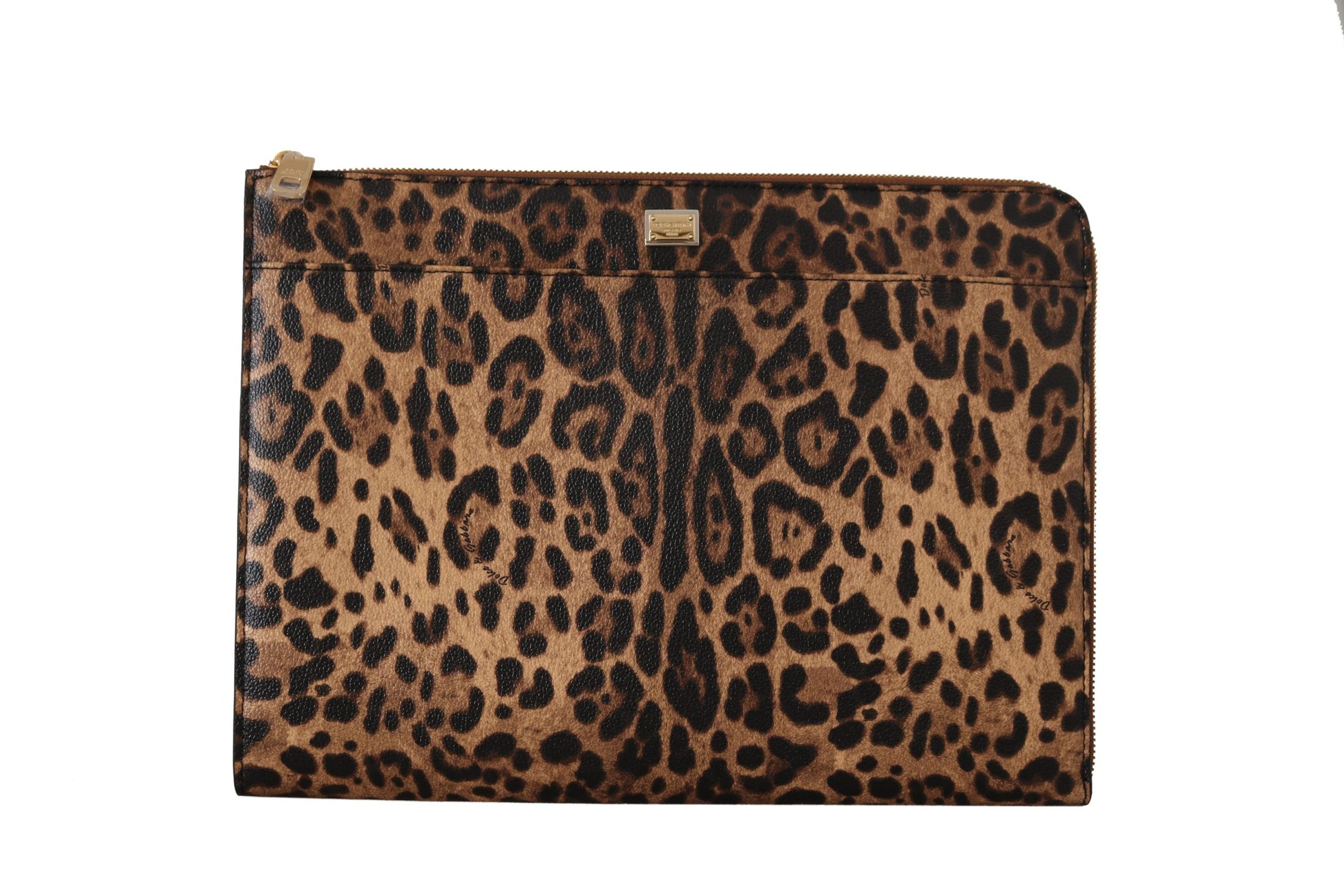 Indulge in the epitome of sophistication with this stunning, brand new clutch from Dolce & Gabbana . Featuring a captivating brown leopard print paired with gold metal detailing, this accessory is a bold statement piece. Crafted from the finest leather, the clutch includes convenient features like a zipper closure, inside card holder, and phone slot, all finished with iconic logo details. This exquisite piece is a testament to Italian craftsmanship and is sure to elevate any evening ensemble.