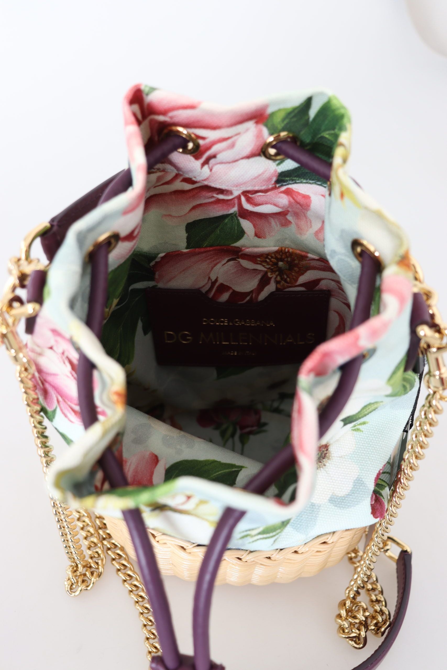 Embrace elegance with this stunning piece from Dolce & Gabbana, a gorgeous addition to any wardrobe that’s sure to turn heads. This exquisite MILLENNIALS purse bag combines a vivid multicolor floral motif with the luxurious quality Dolce & Gabbana is renowned for. Its comfortable chain and leather strap make it perfect for shoulder wear, while the spacious interior with a pocket slot ensures all your essentials are stylishly secured within a floral-lined compartment. The drawstring flap closure adds a touch of grace, making it perfect for any occasion, casual or formal.