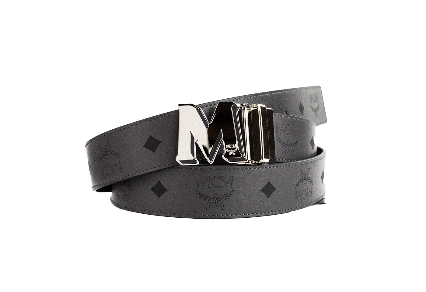 Style: MCM Claus Visetos M Logo Buckle Belt (Gray Pinstripe)