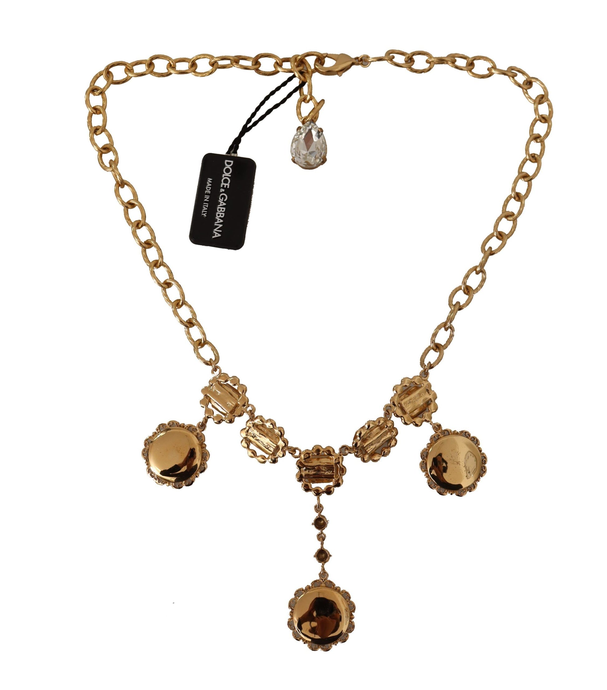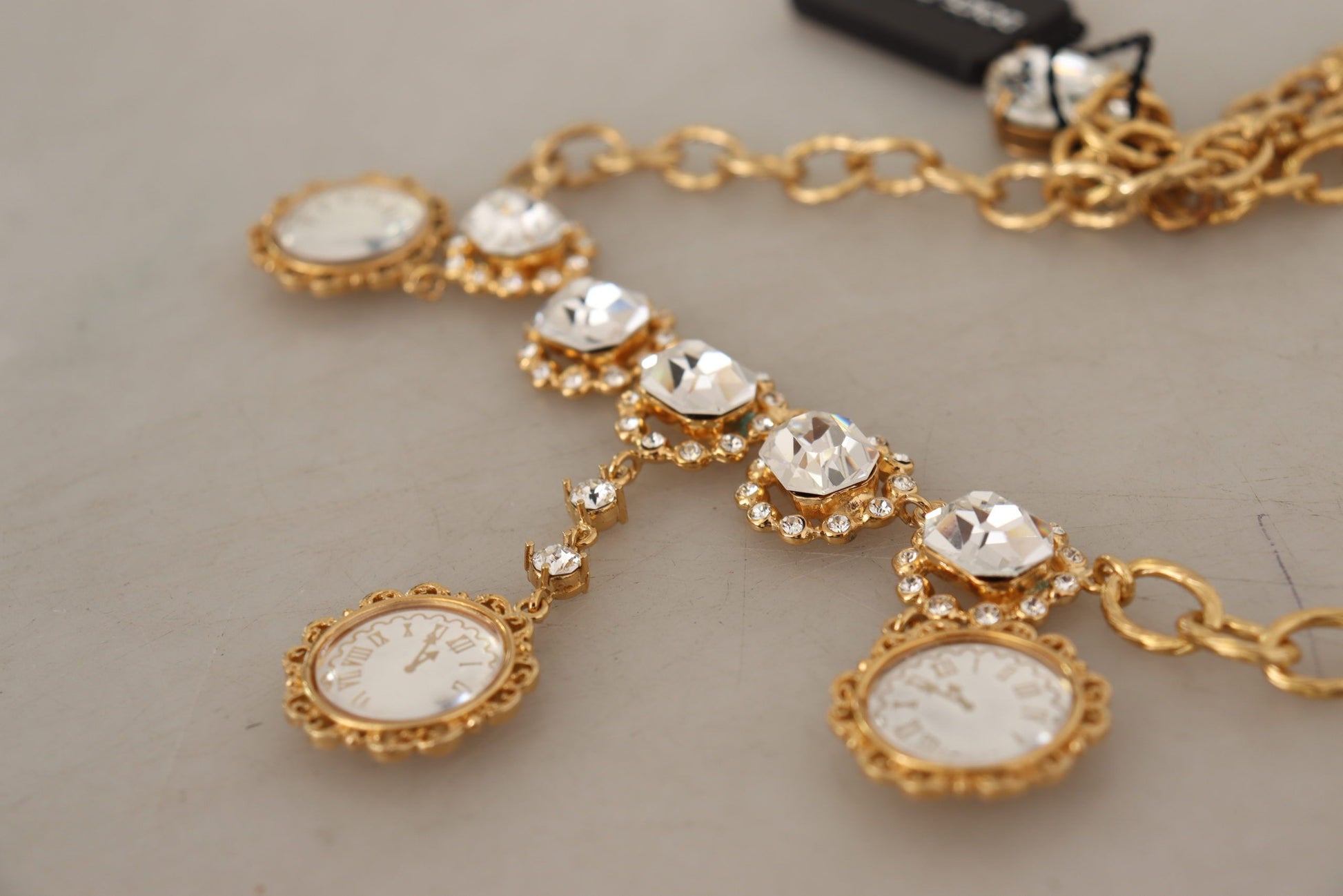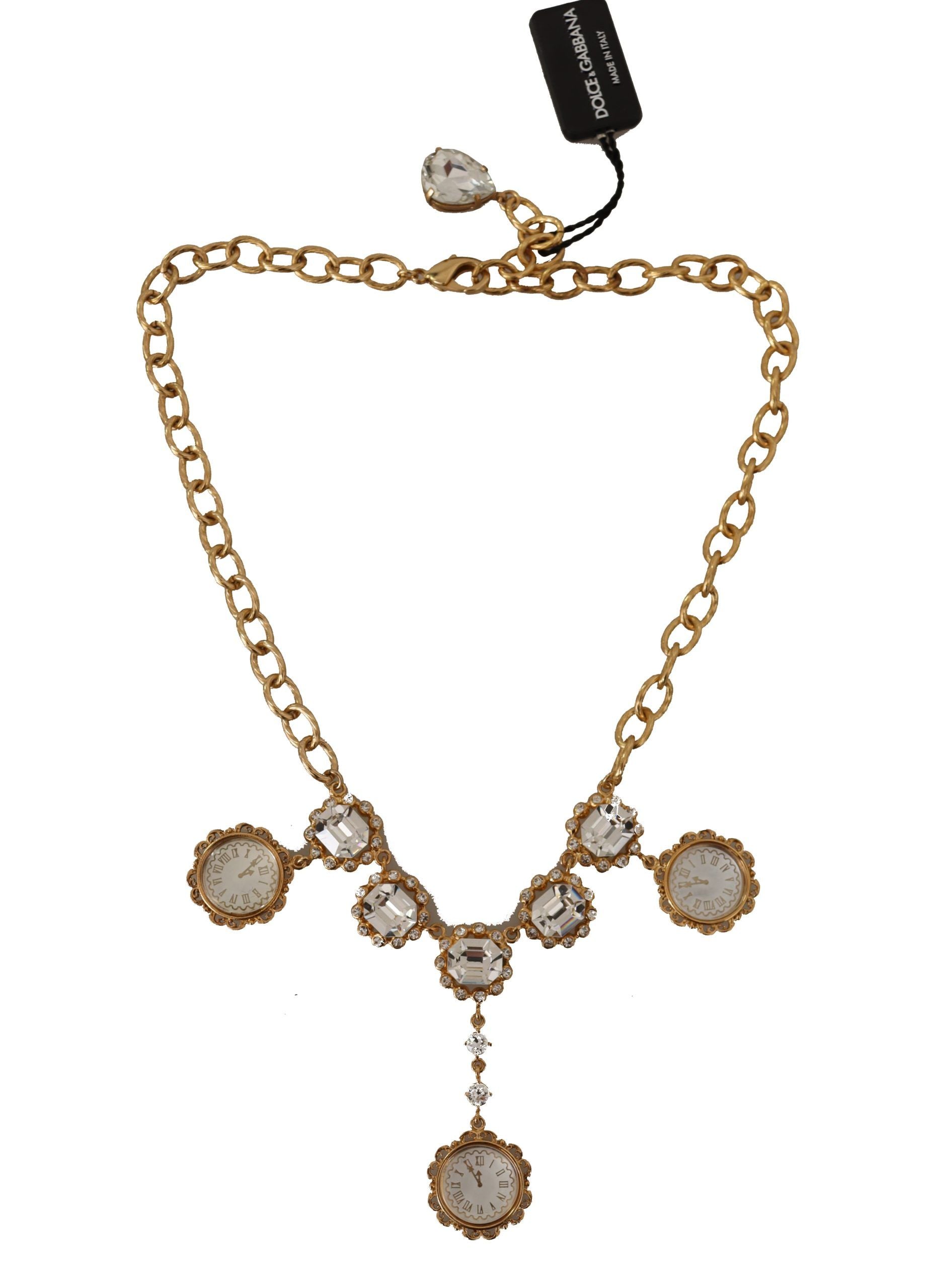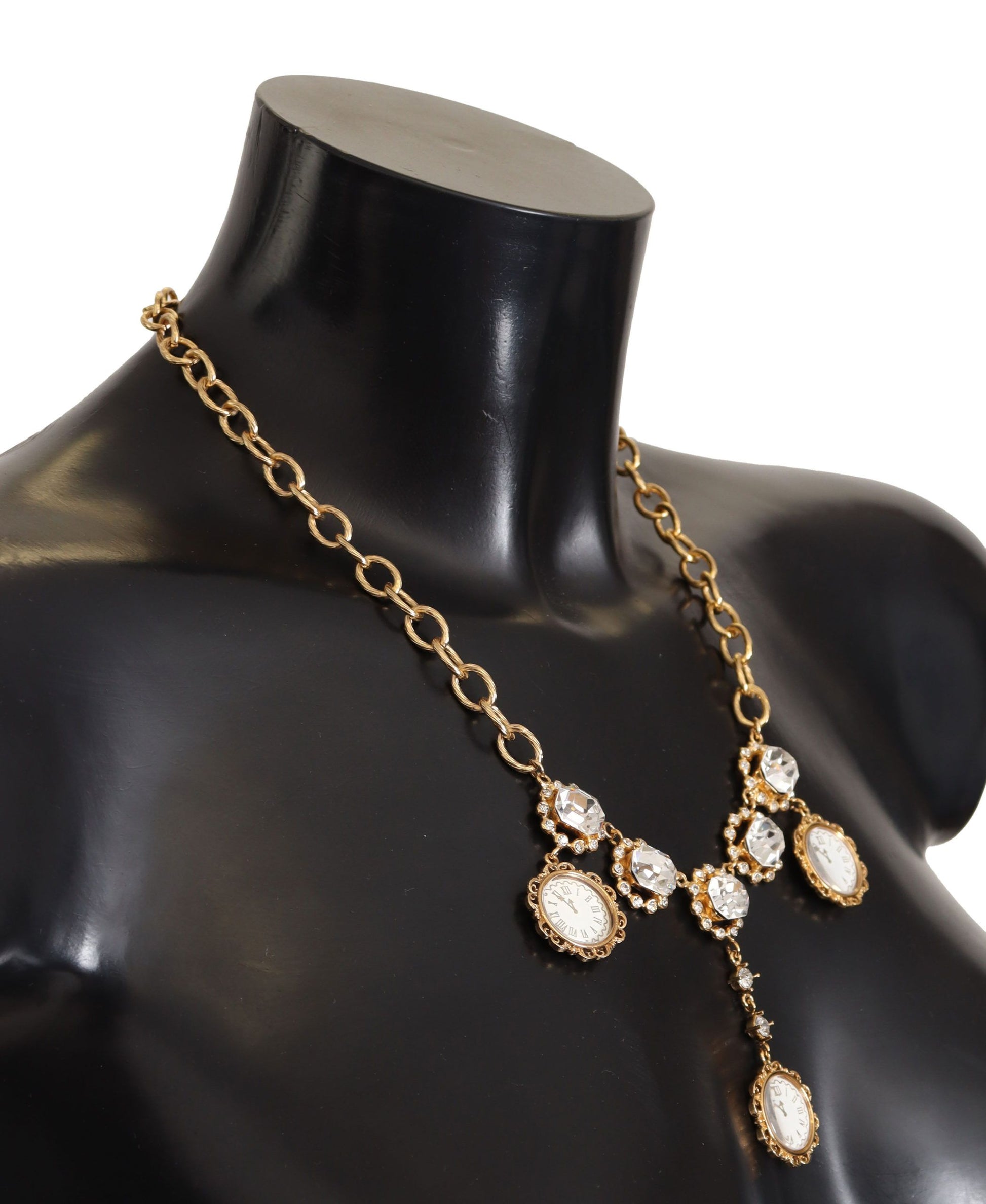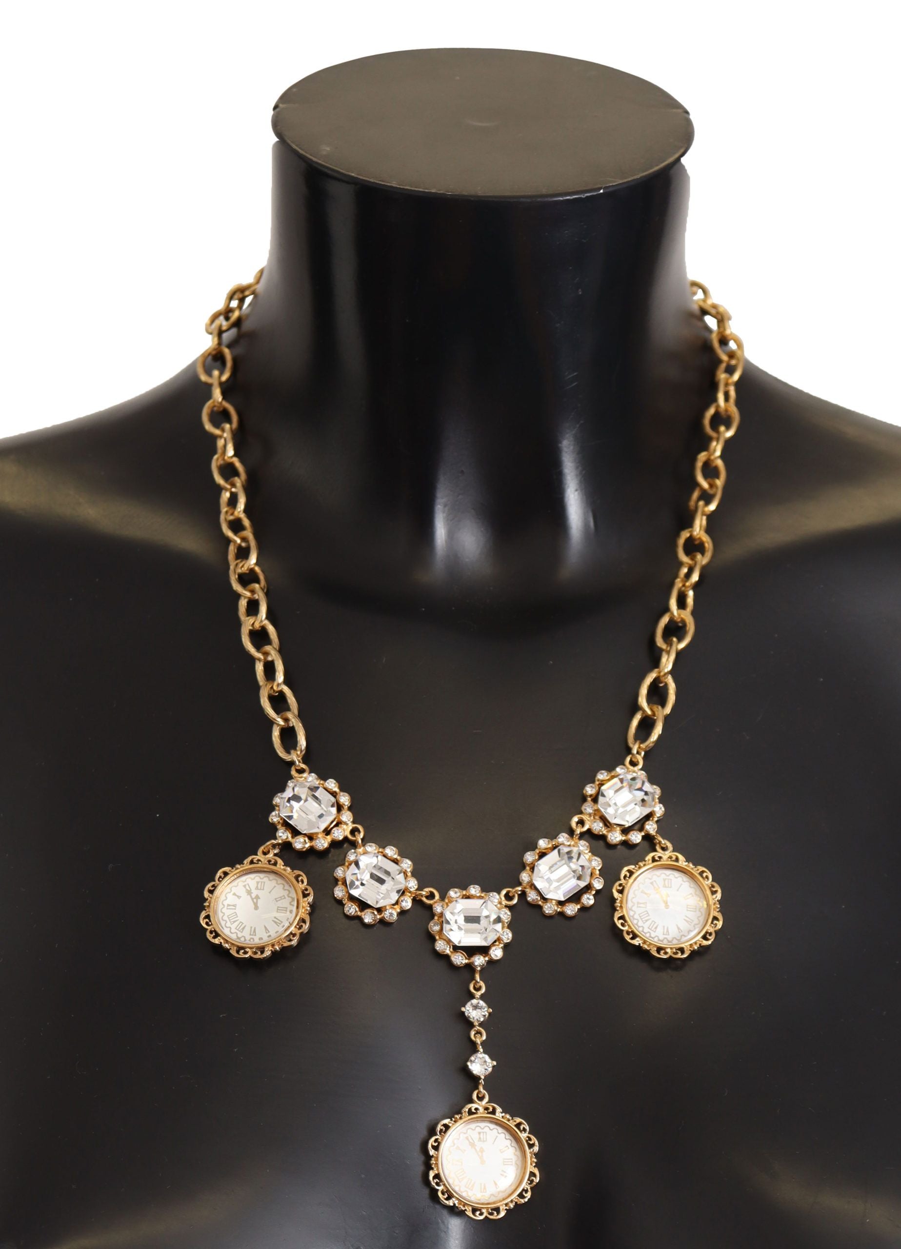 Accentuate your ensemble with this breathtaking Timekeeper Statement Necklace from the house of Dolce & Gabbana. Gorgeous and brand new with tags, this piece adds an air of elegance and grandeur to any outfit. Made with a blend of high-quality brass, crystal, and plastic, it features a beautiful gold tone complemented by clear crystals for a touch of sparkle. A lobster clasp ensures secure closure, allowing you to adjust its length for a perfect fit. This Italian-made accessory is a testament to craftsmanship and luxury.