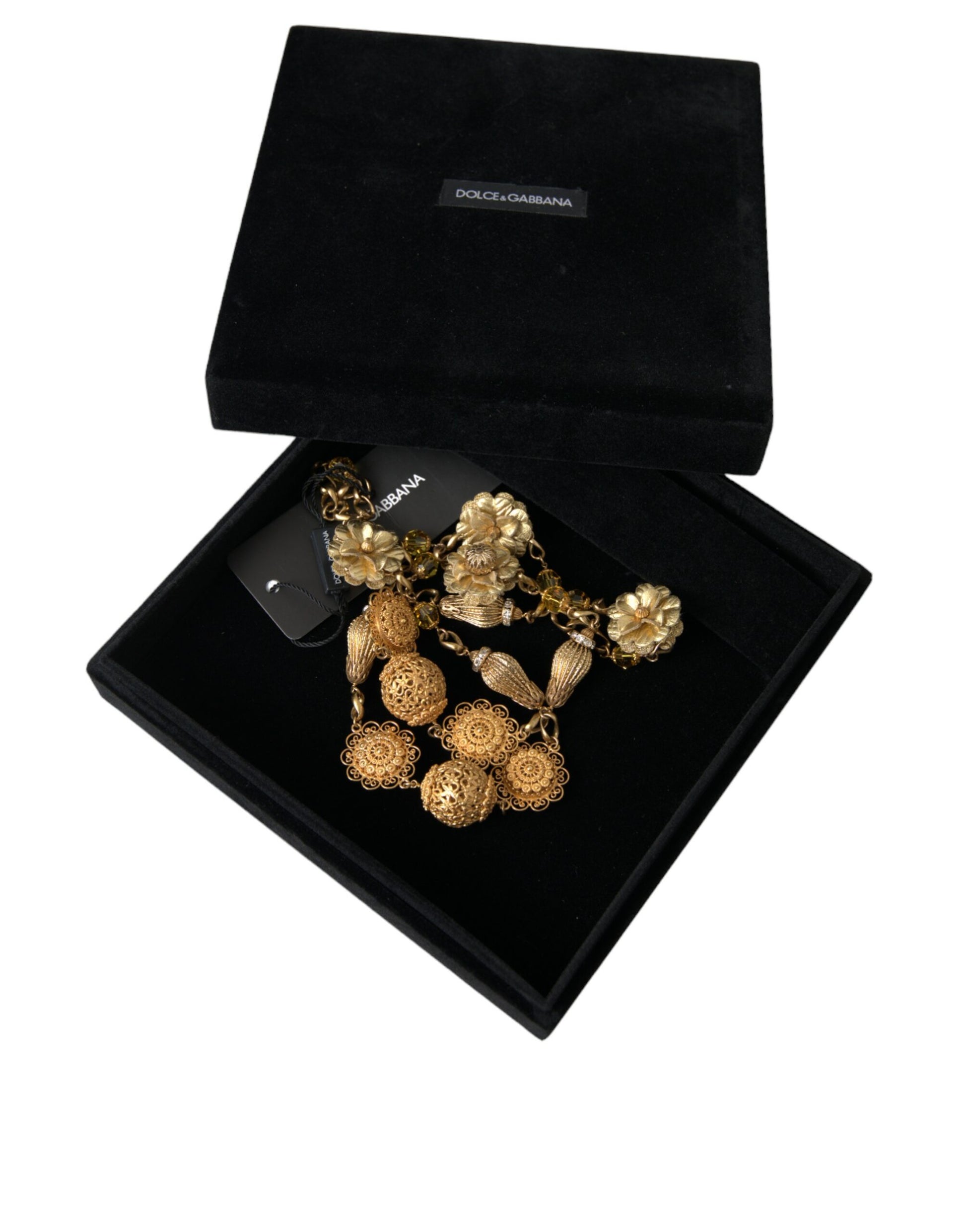 Gorgeous brand new with tags, 100% Authentic Dolce & Gabbana necklace. Made from gold-tone metal, the neckpiece has an assembly of beads, crystal and leather flowers. These charming details are all held by a chain.