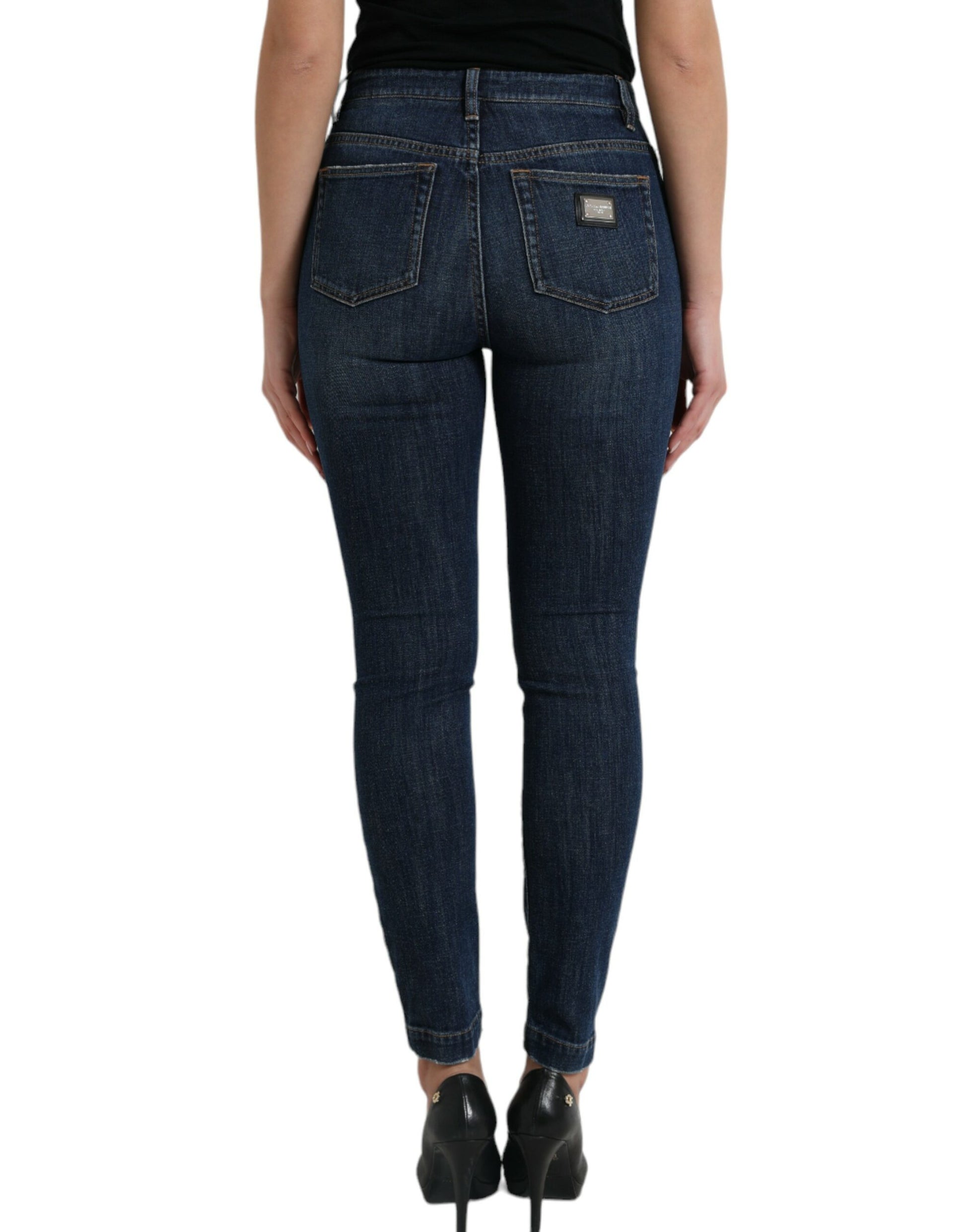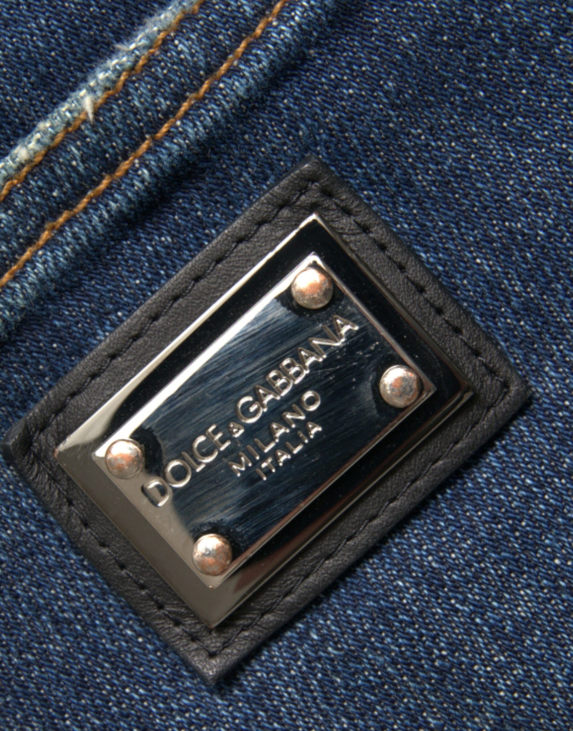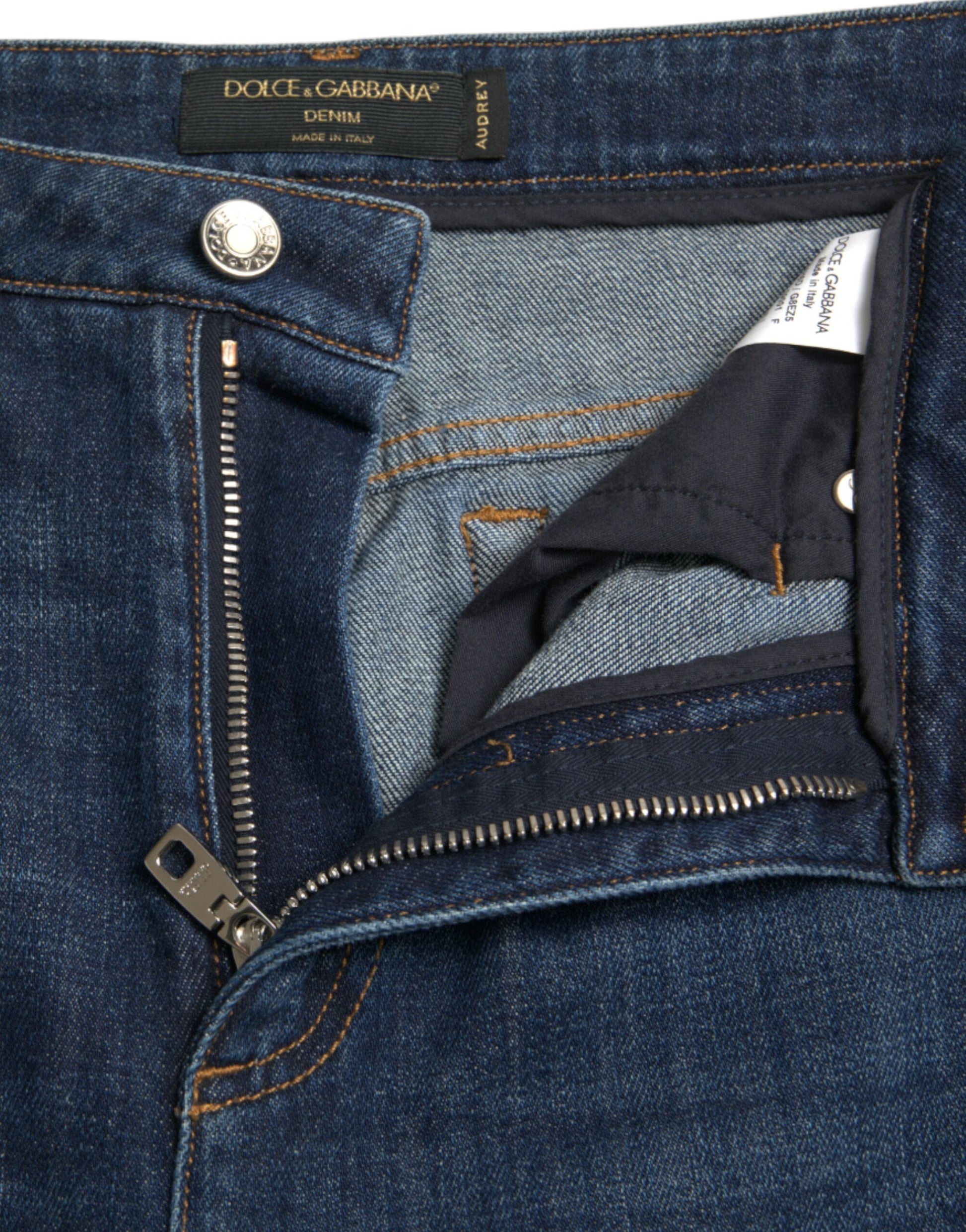 Indulge in the luxury of Italian craftsmanship with these stunning Dolce & Gabbana high-waist denim jeans. Tailored for a flattering fit, these jeans are crafted from a superior blend of cotton and elastane, ensuring both comfort and style. Their exquisite dark blue hue makes them a versatile addition to your wardrobe, perfect for day-to-night looks. Completed with a sleek zipper closure and subtle logo details, these jeans epitomize understated elegance.