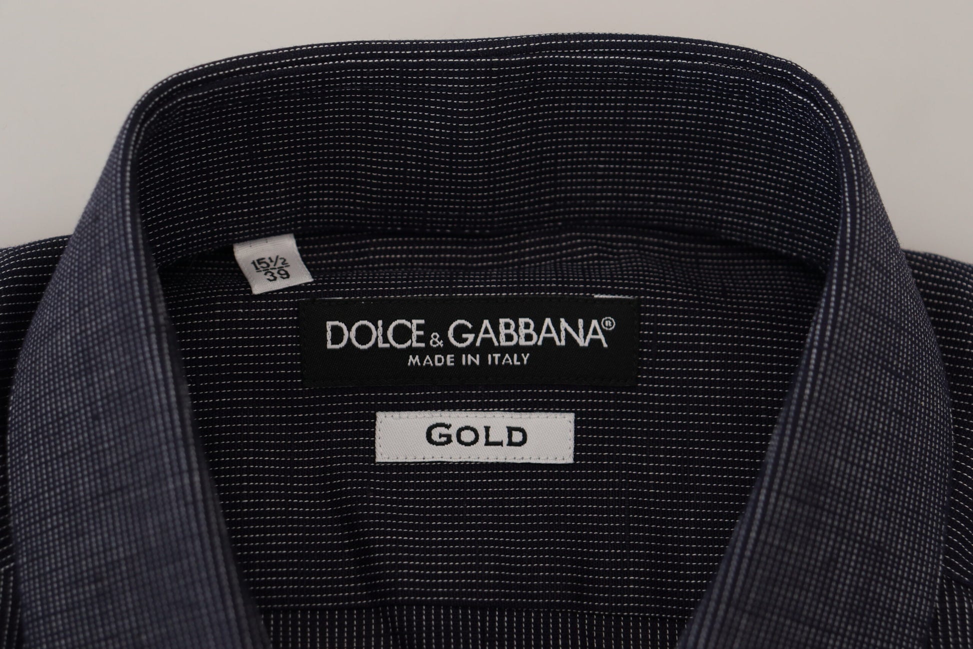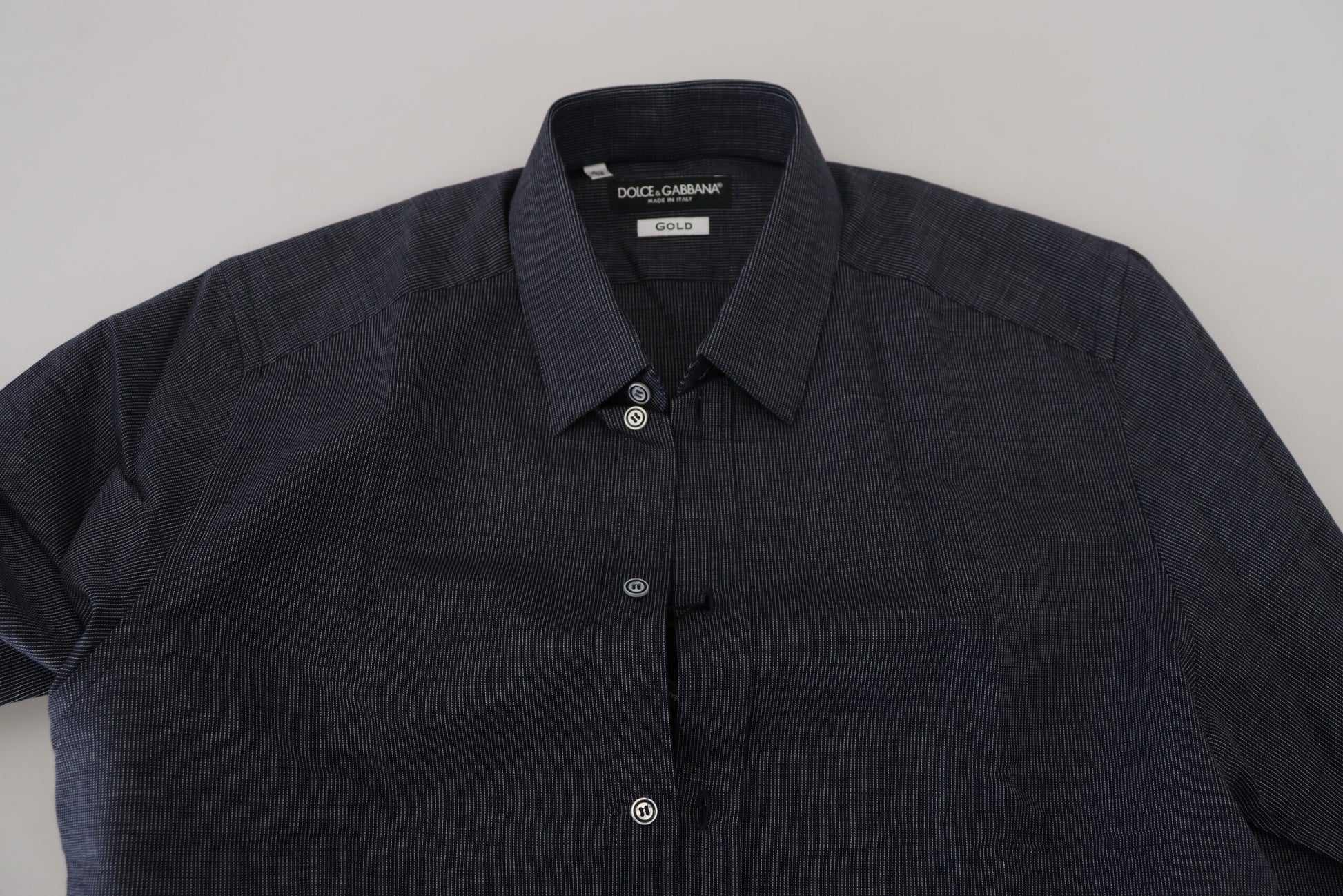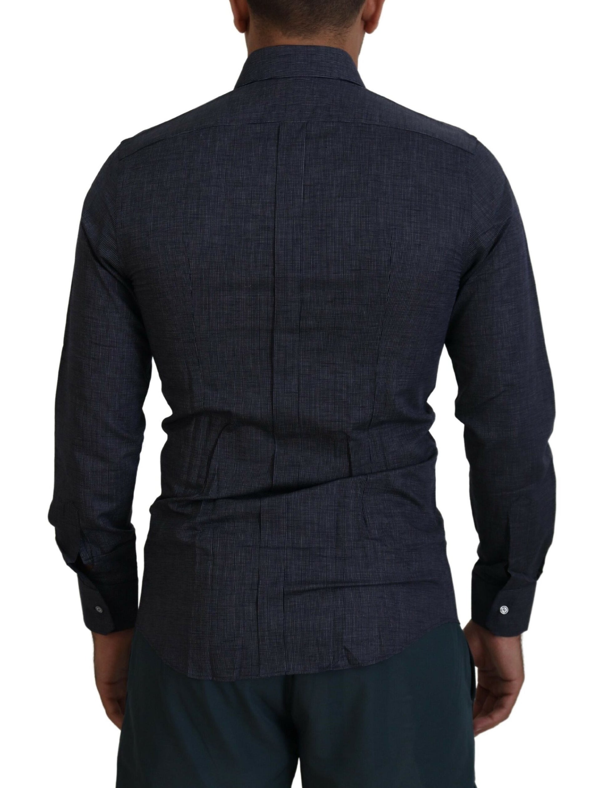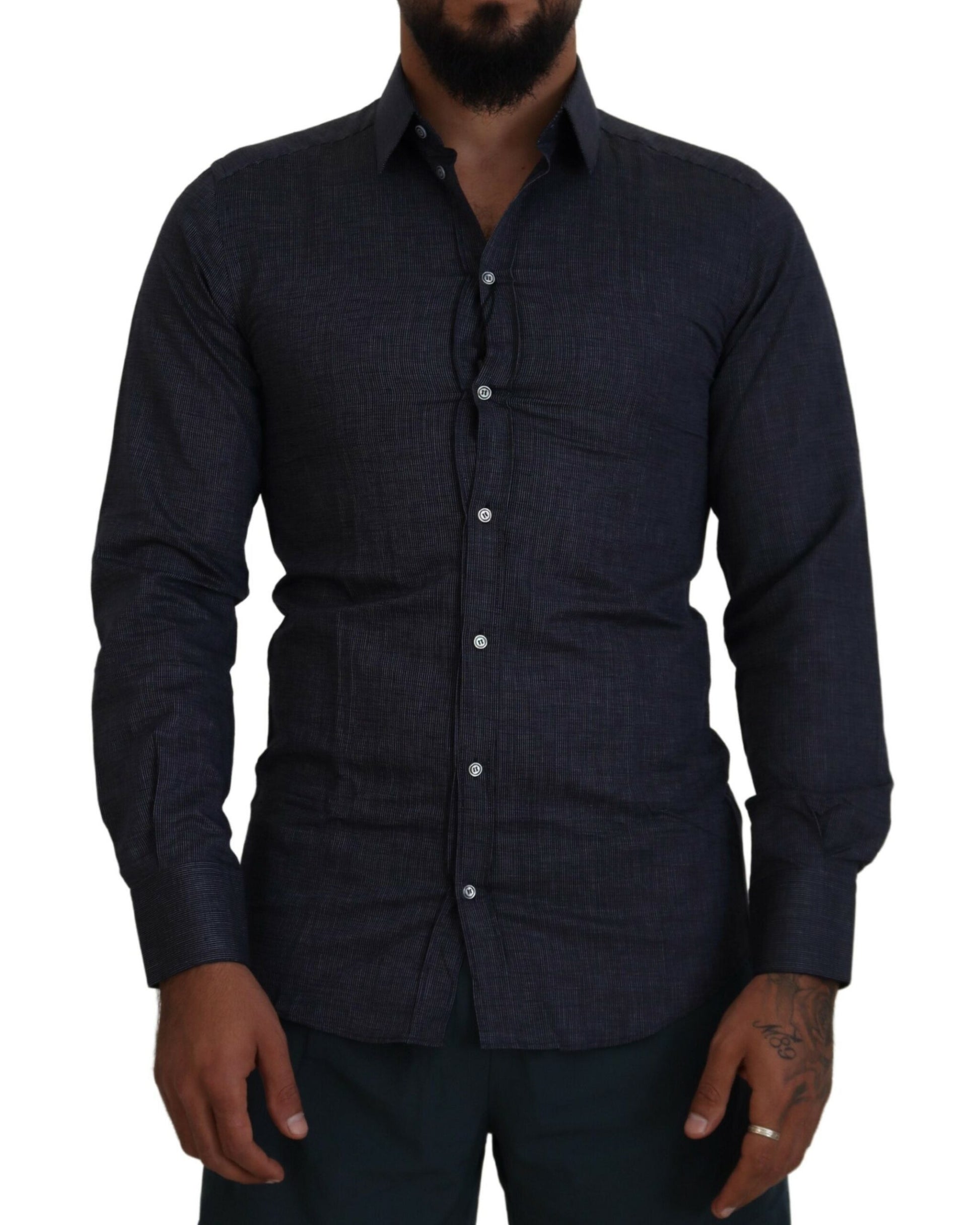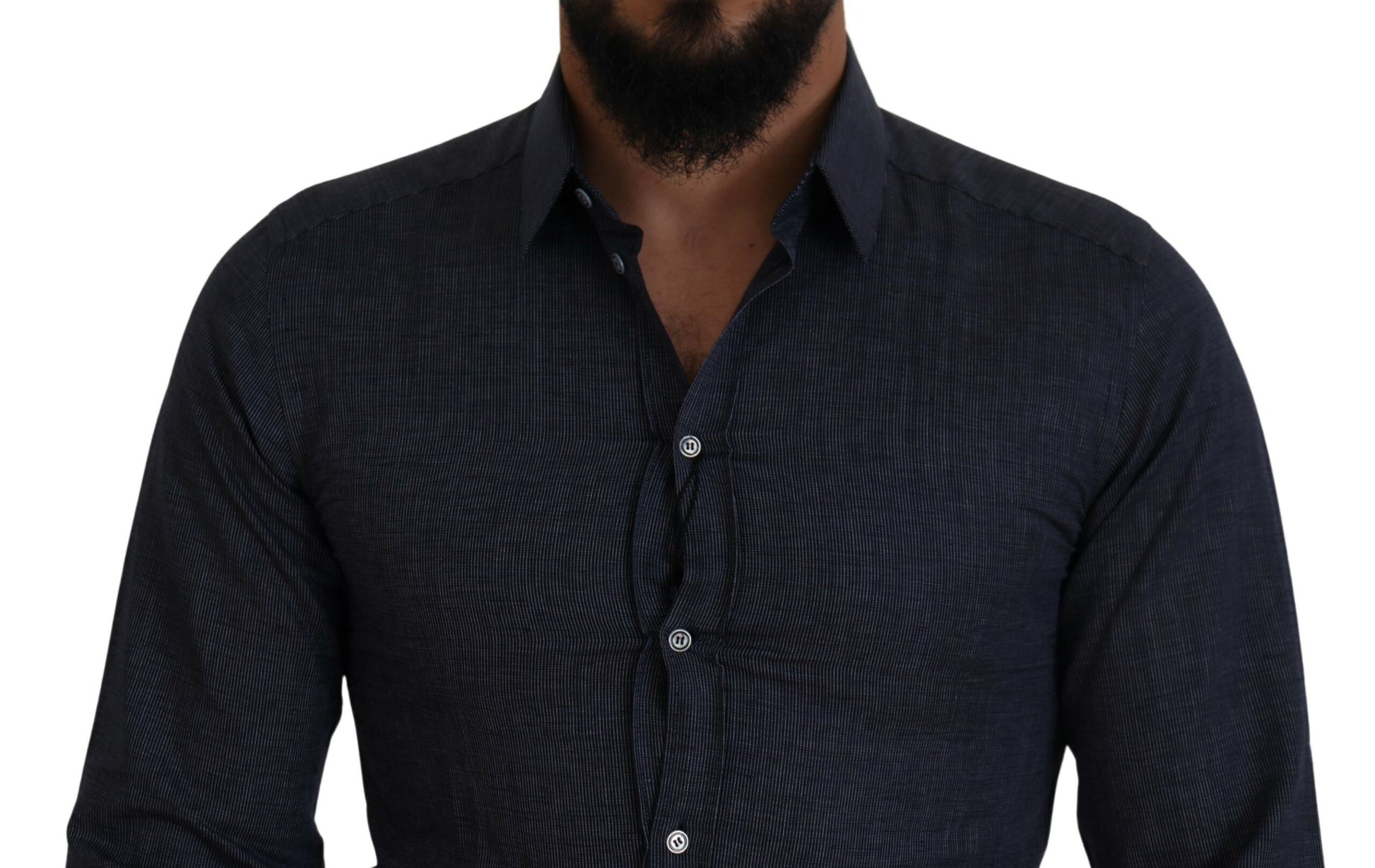 Indulge in the epitome of sophistication with our stunning slim fit dress shirt. Crafted from a luxurious blend of materials, this dark blue shirt from Dolce & Gabbana exudes elegance and refinement. Perfect for formal occasions, the shirt features a sleek front button closure and is emblazoned with the recognizable logo detailing, showcasing your taste for designer flair. Made in Italy, this piece promises not only style but unparalleled quality.