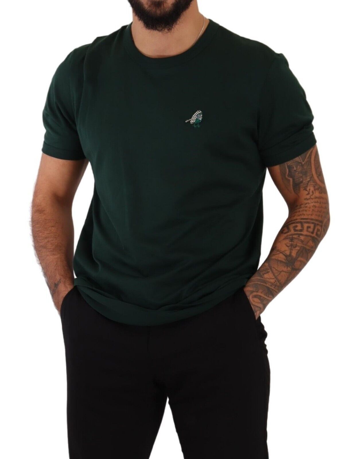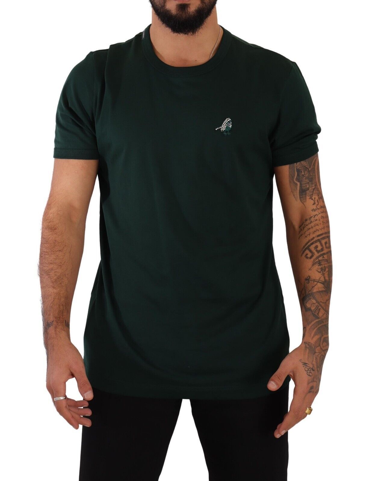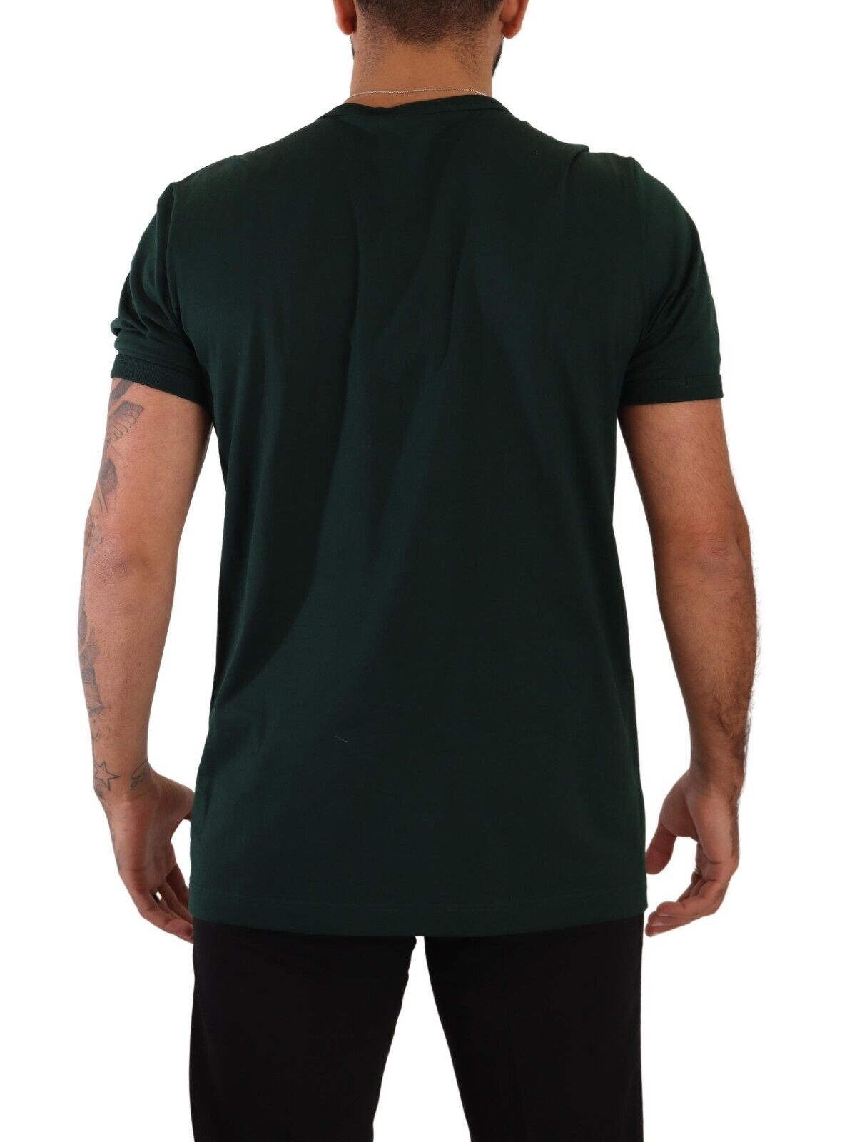 Discover the epitome of Italian luxury with this stunning Dolce & Gabbana crew neck t-shirt. Made from the finest 100% cotton and designed with a suave dark green hue, this shirt is a perfect blend of comfort and high-fashion. Detailed with the brand’s signature logo, it adds an air of exclusivity to your wardrobe. Crafted with care in Italy, the t-shirt’s classic silhouette is enhanced with a touch of embellishment, making it a versatile piece for any sophisticated ensemble.