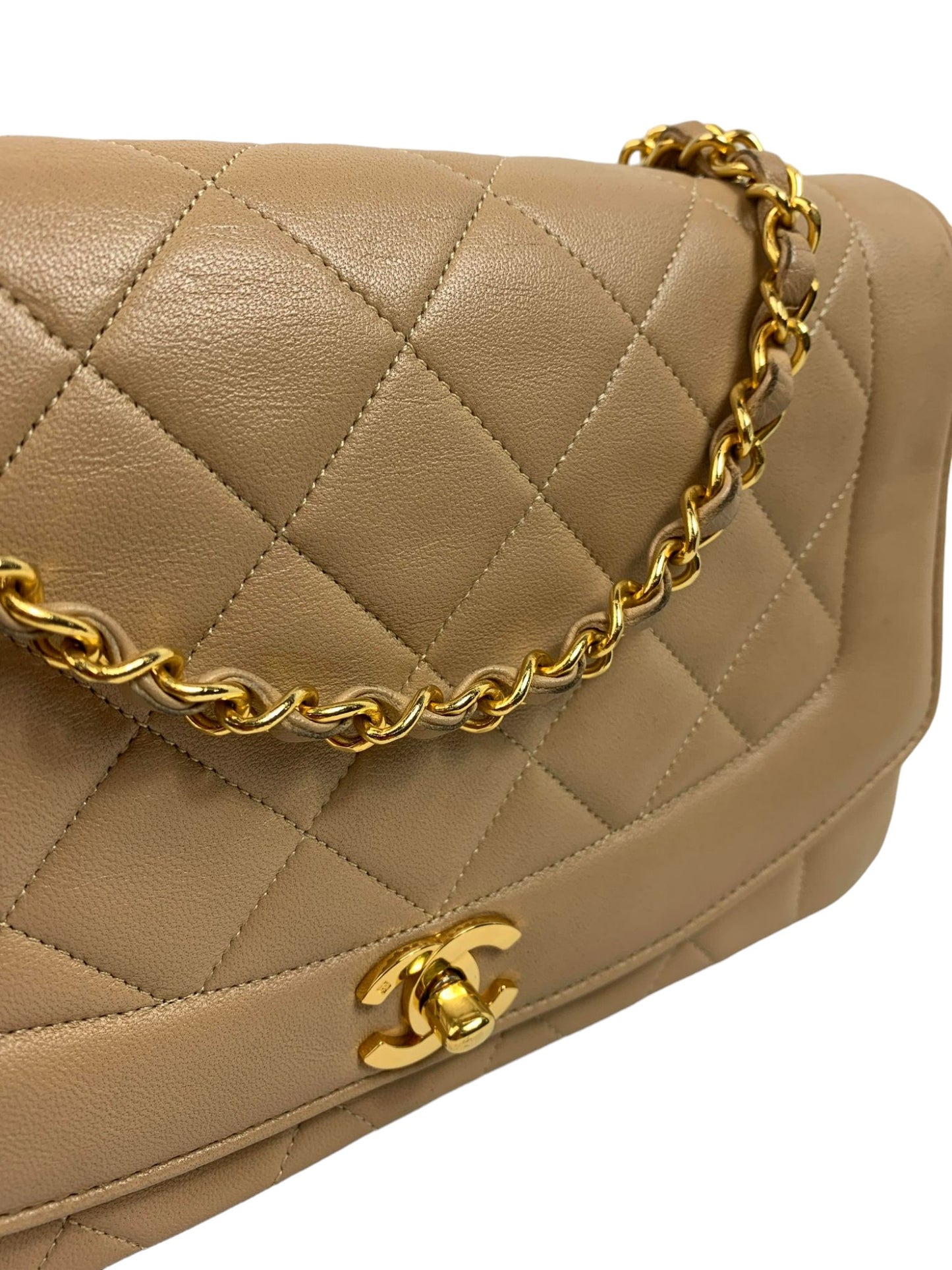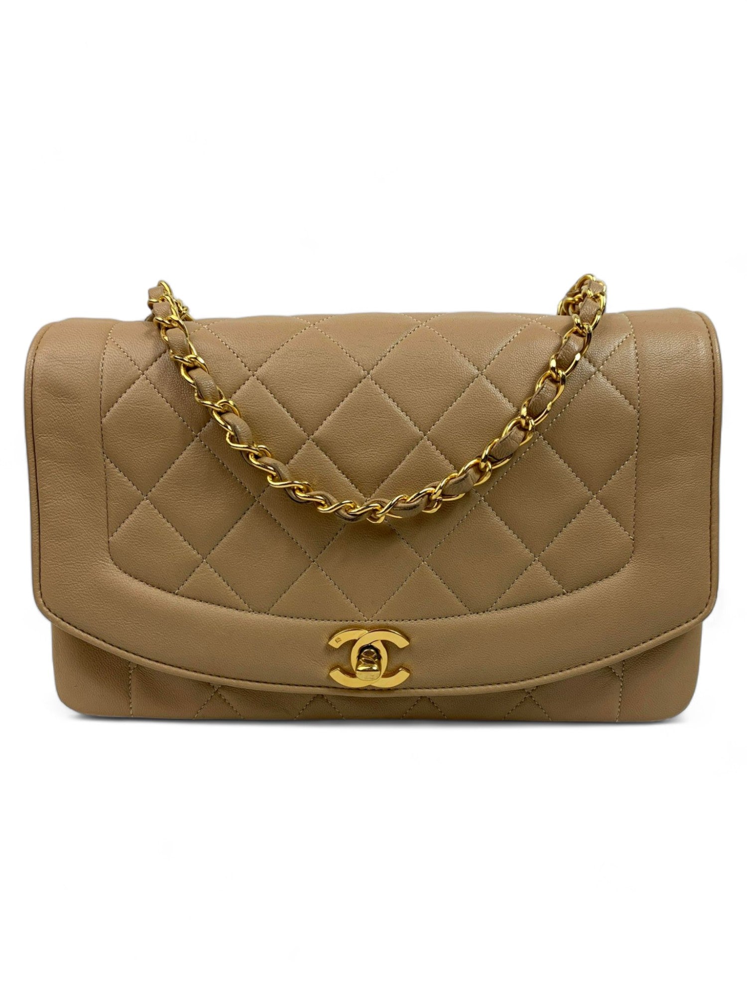 Elevate your style with the Diana Vintage Medium Beige Classic Quilted Lambskin handbag. Secure this exclusive piece today and add a touch of timeless luxury to your collection.