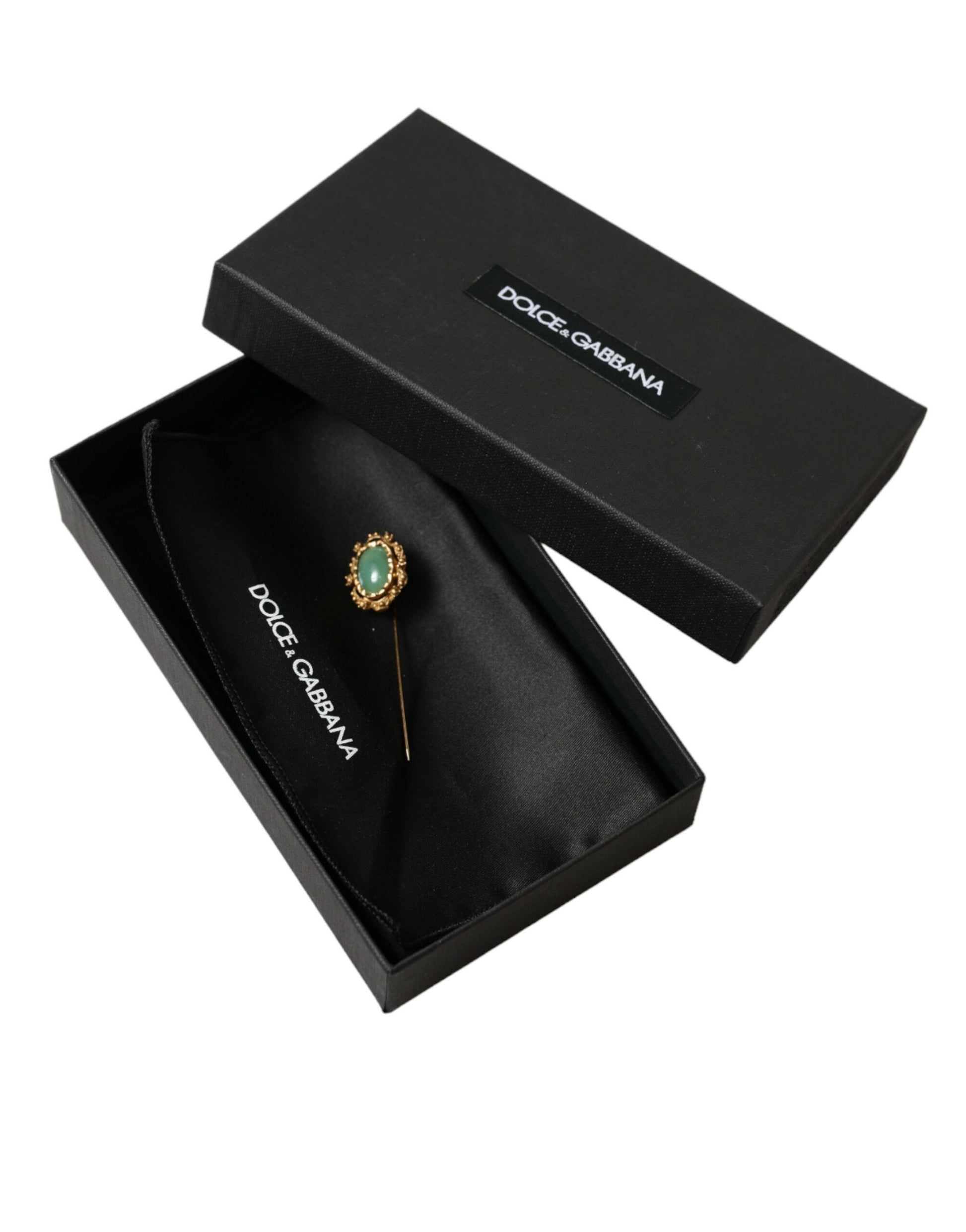 Indulge in the quintessence of elegance with this striking gold-tone pin brooch from Dolce & Gabbana. Every detail speaks of luxury, from the gleaming brass construction to the opulent oval gemstone embellishments. It’s not just a piece of jewelry; it’s a statement of style, perfect for accenting any outfit. Proudly made in Italy, this brooch carries the unmistakable mark of Dolce & Gabbana’s attention to detail and commitment to excellence.