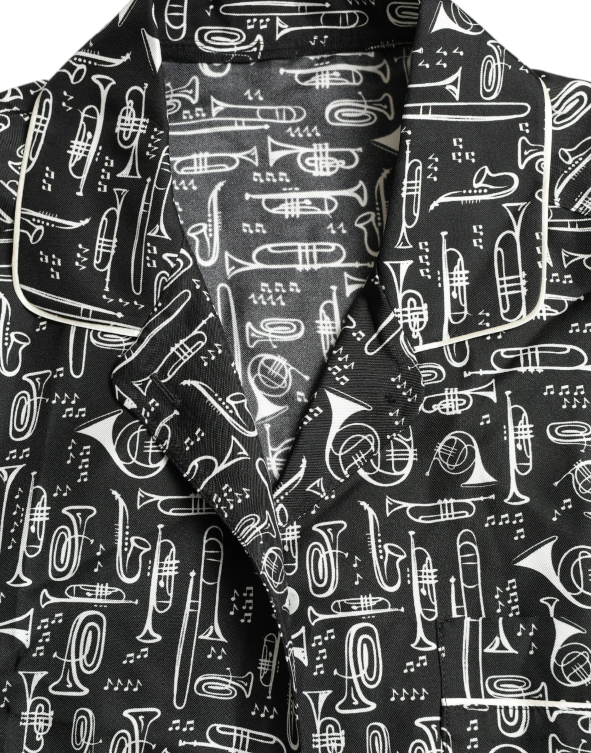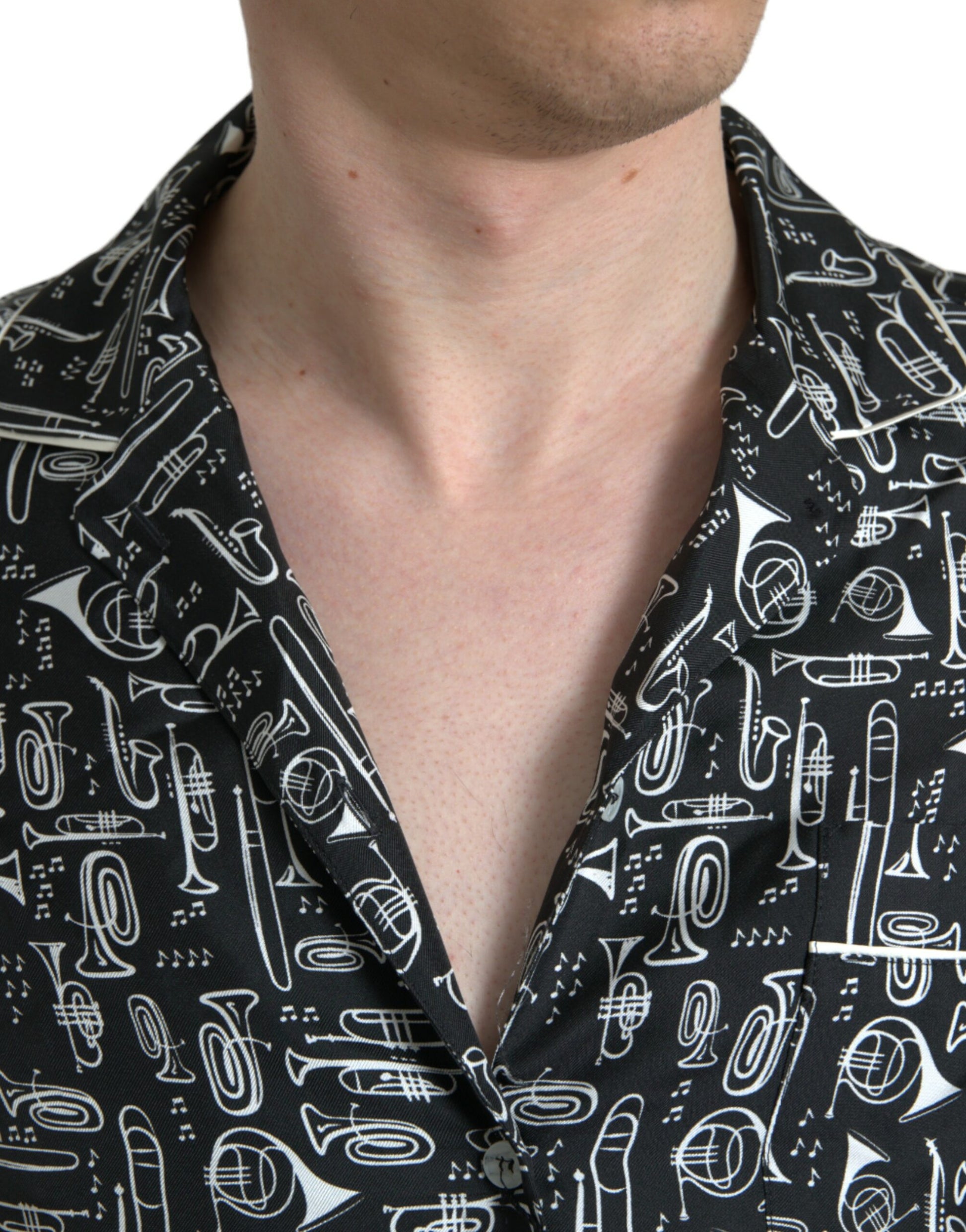 Indulge in the opulence of Dolce & Gabbana with this stunning silk collared polo t-shirt, adorned with an elegant trumpet print. This piece exemplifies luxury casualwear, offering a chic black and white palette that effortlessly complements any sophisticated ensemble. With its Italian craftsmanship and keen attention to detail, this t-shirt is perfect for those who appreciate high fashion and comfort.