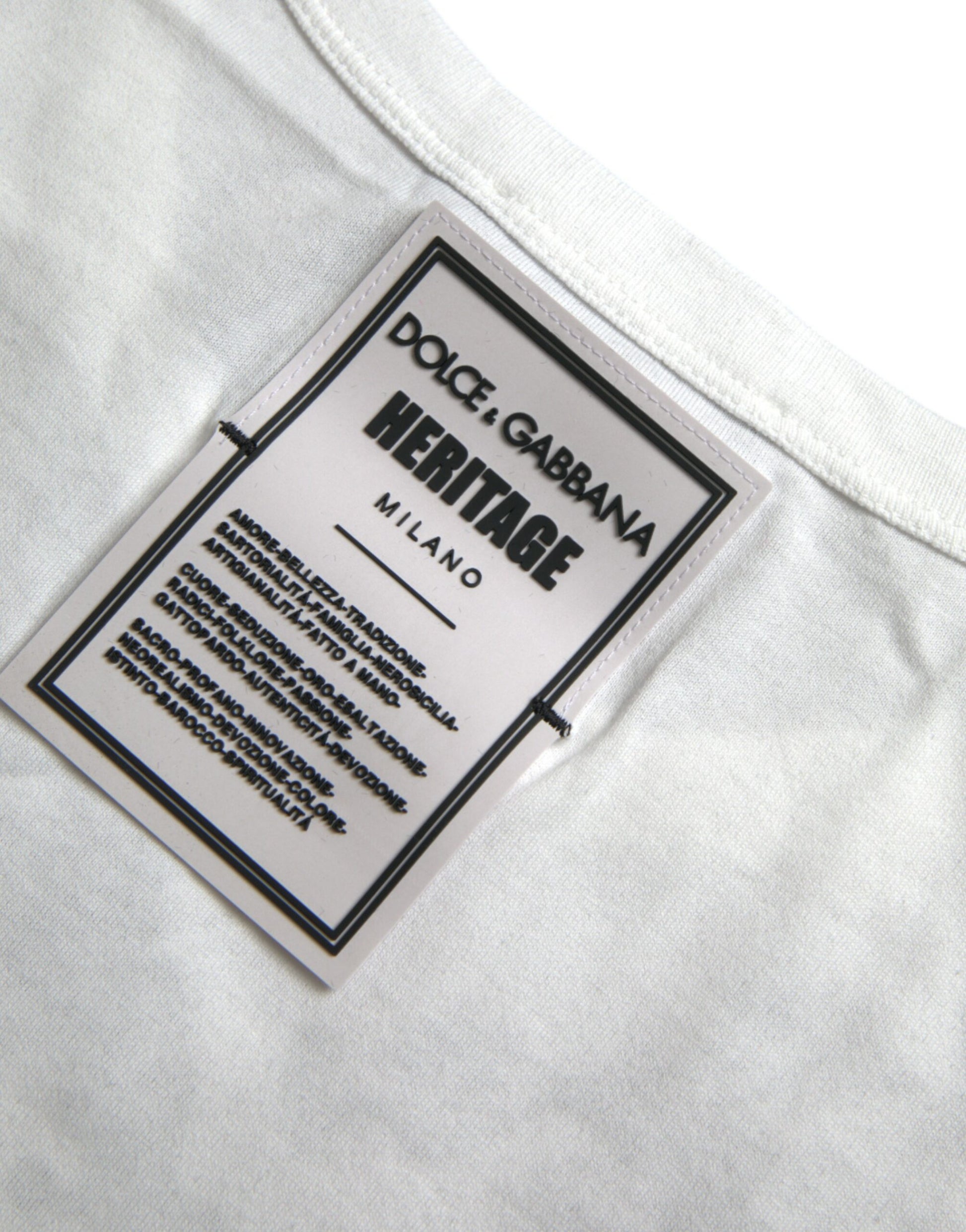 Indulge in the timeless elegance of Dolce & Gabbana with this gorgeous, brand new crew neck t-shirt. Crafted from luxurious 100% cotton, this white tee features a striking black print, merging comfort with high fashion. A perfect addition to your wardrobe, offering a regular fit and exquisite logo details, all meticulously made in Italy.