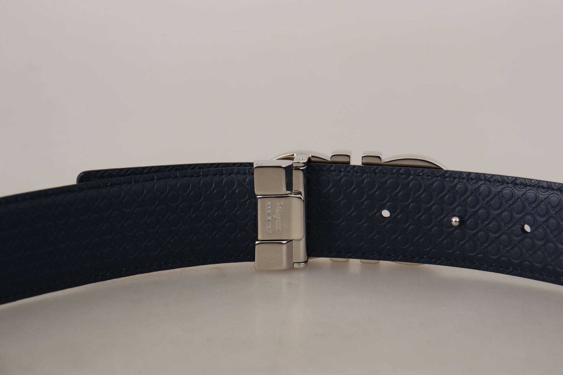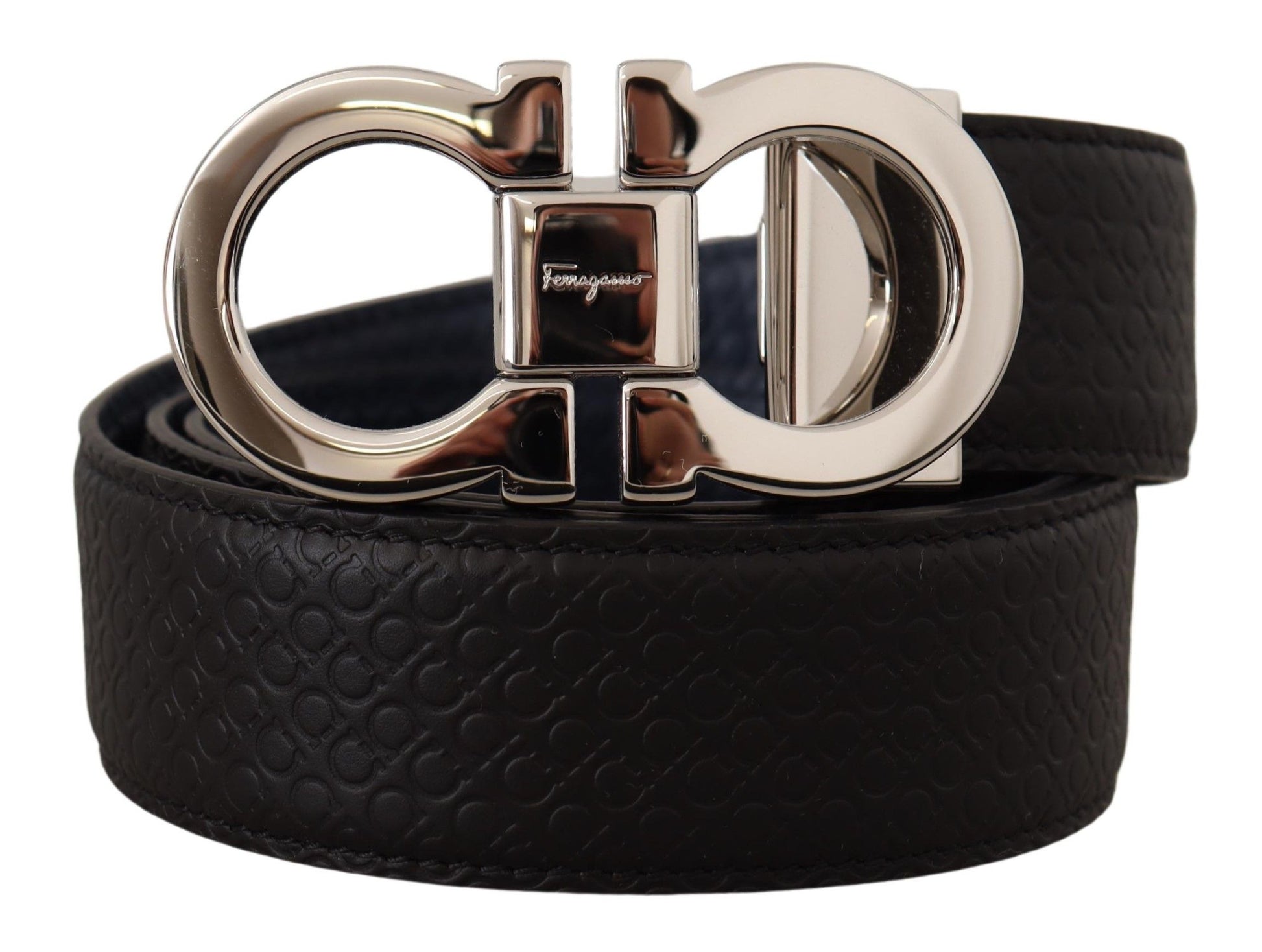 Define your silhouette with the epitome of elegance – a Salvatore Ferragamo Reversible Belt. Perfect for any fashion connoisseur, this 100% authentic accessory is brand new and comes with original tags, dust bag, and box. Sporting a sleek silver buckle, this belt offers versatility with its reversible fjord blue and black sides. Impeccably crafted from the finest calf leather, this Italian-made statement piece is a testament to timeless style and luxury.