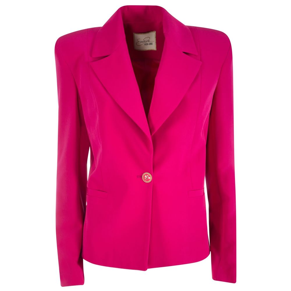 Introducing the exquisite piece from Yes Zee’s latest collection: a women’s summer jacket that seamlessly blends sophistication with comfort. Crafted in Italy, this beautiful fuchsia crepe jacket features a logo-adorned button closure and two front pockets, offering a balance of elegance and practicality. A must-have for your wardrobe to elevate your summer style.