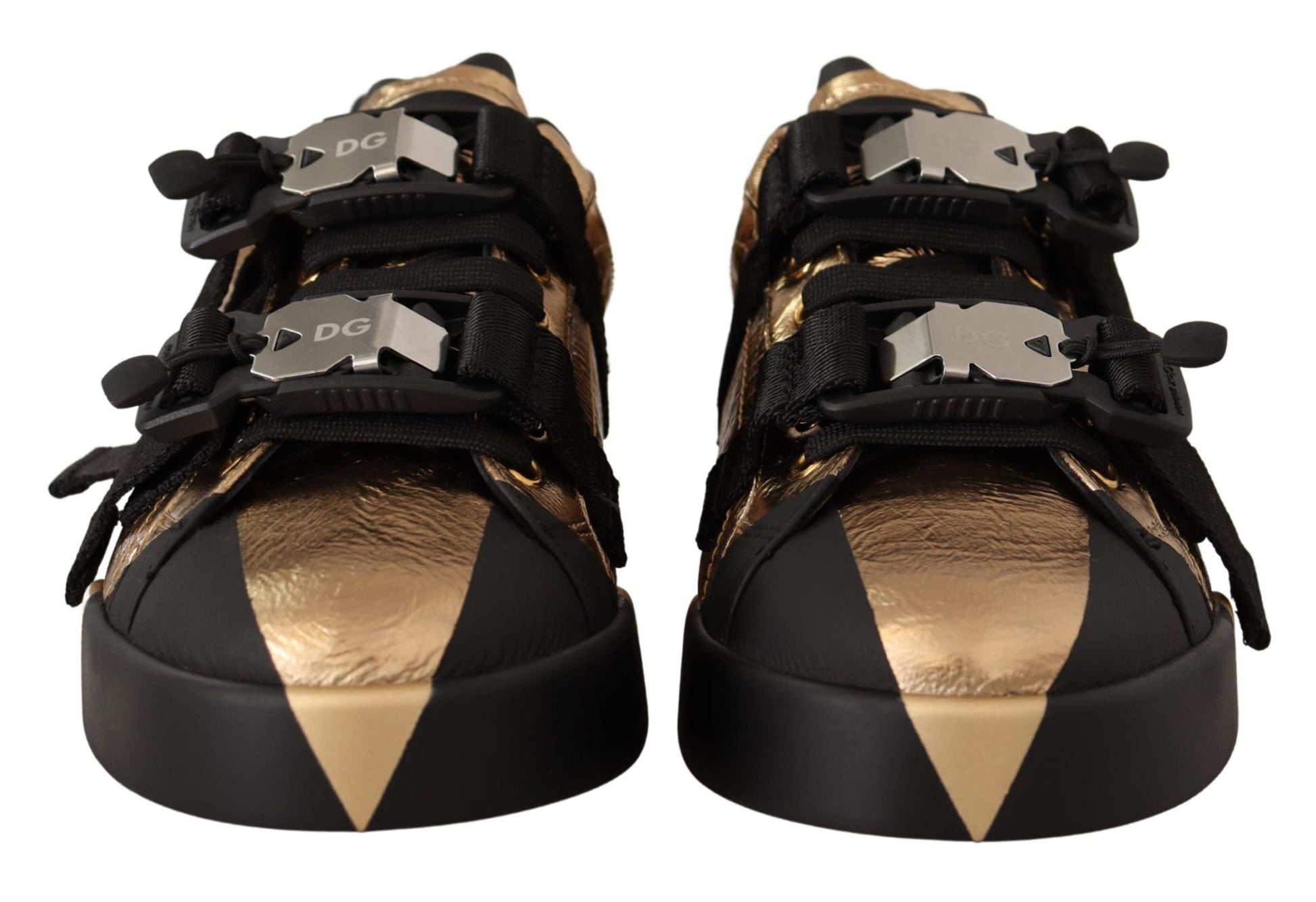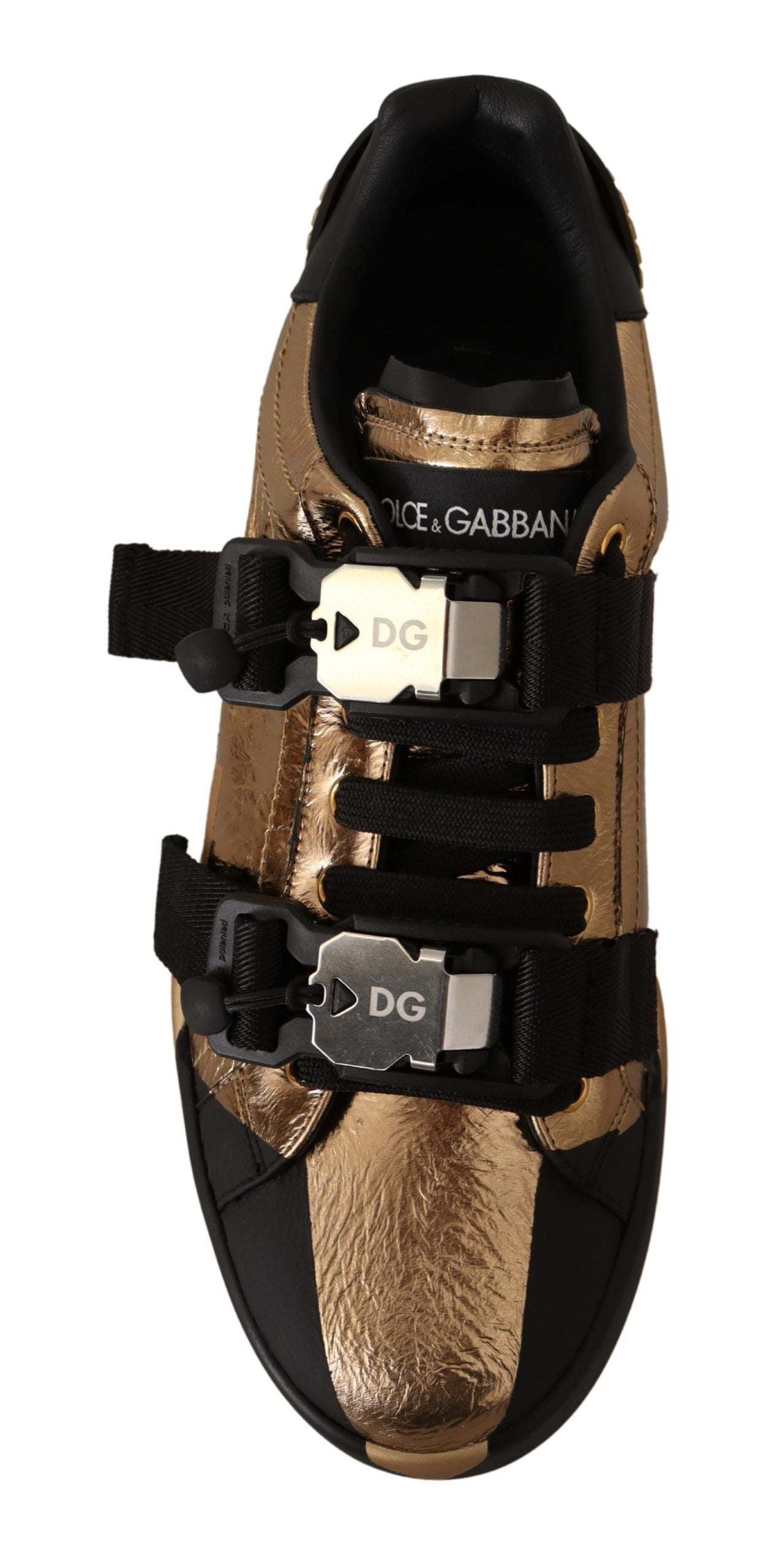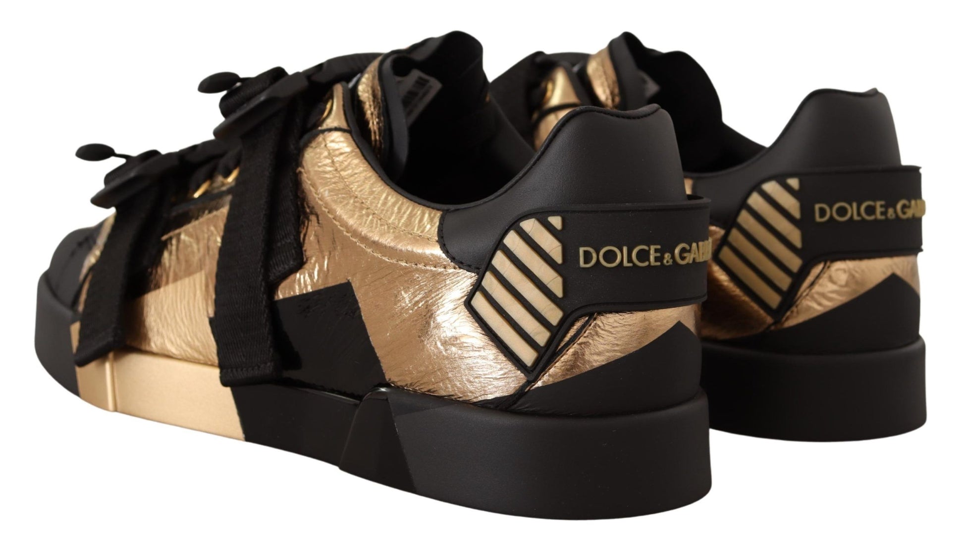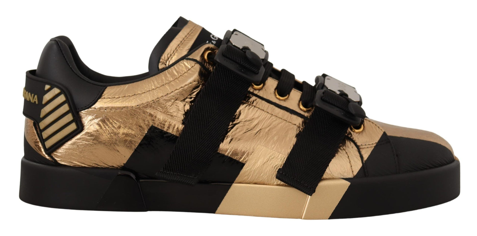Step into luxury with these Dolce & Gabbana low-top casual sneakers, a perfect blend of style and comfort. Crafted from premium leather in a sleek black and gold color scheme, they feature a lace-up front with buckle strap closure, and are set on durable rubber soles for day-long wear. Each shoe showcases the iconic logo, marking the essence of upscale fashion. Made with Italian craftsmanship, they’re designed to elevate any outfit. A must-have addition to your sophisticated footwear collection.