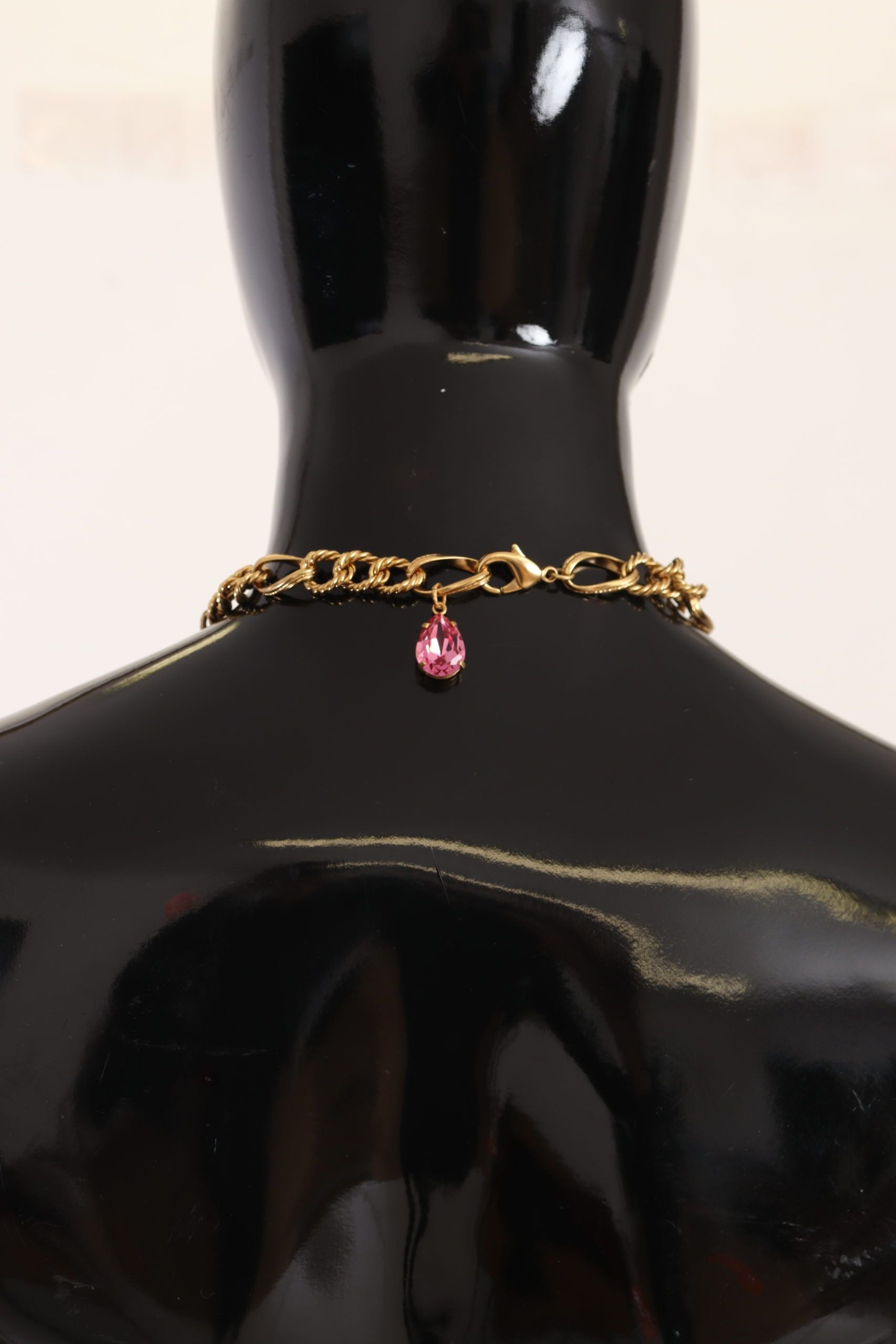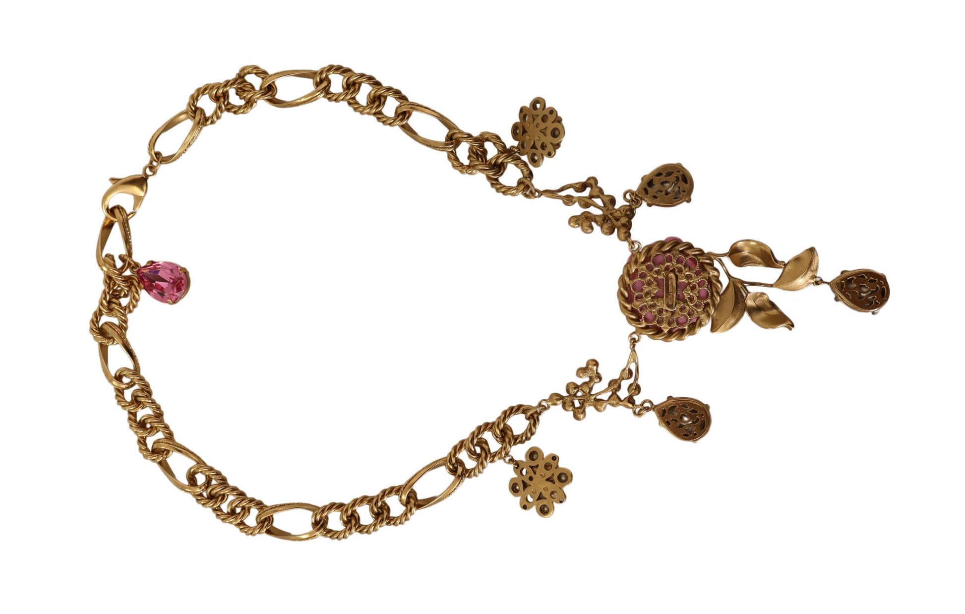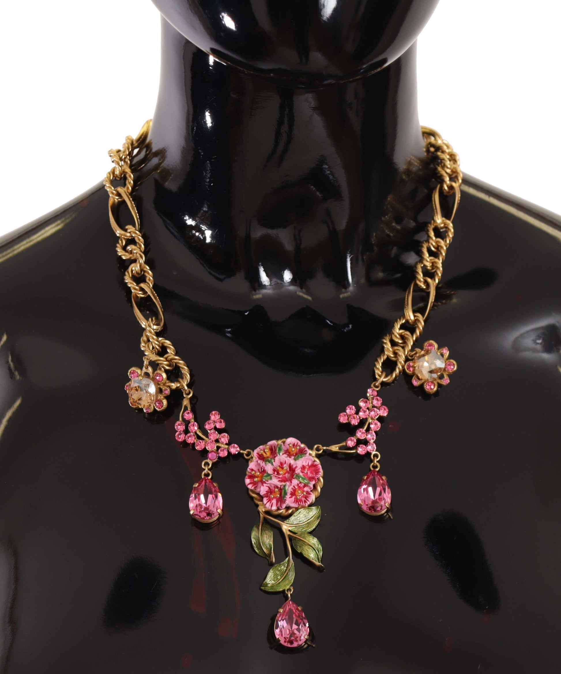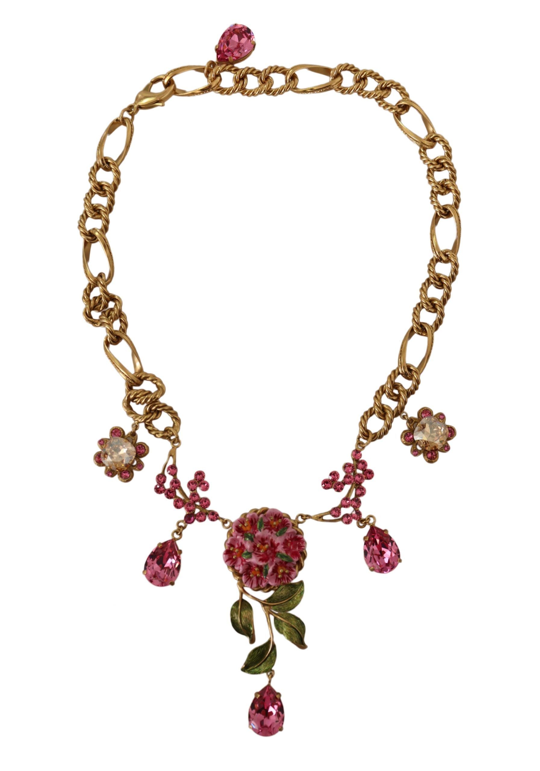 Adorn your neckline with the exquisite craftsmanship of this Dolce & Gabbana necklace. This piece is a symphony of elegance, featuring a stunning hand-painted resin floral centerpiece. Encrusted with a pavé of luminous crystals of varying cuts, it sits gracefully on hypoallergenic gold-plated alloy that gleams with sophistication. Perfect for high-profile events or adding a touch of glamour to your everyday ensemble.