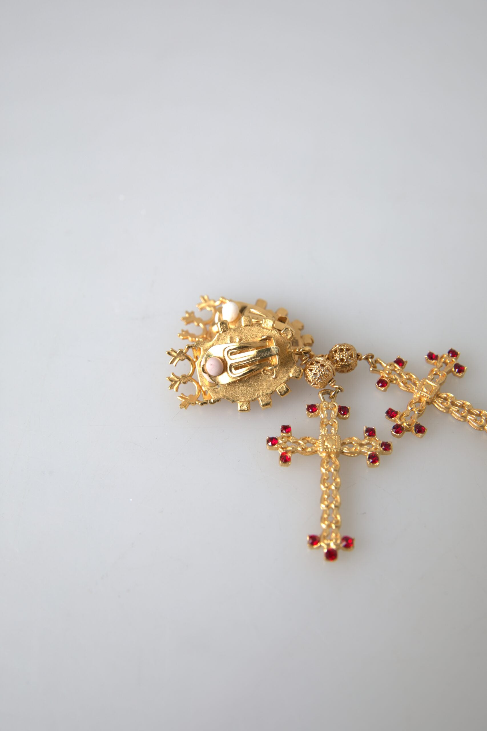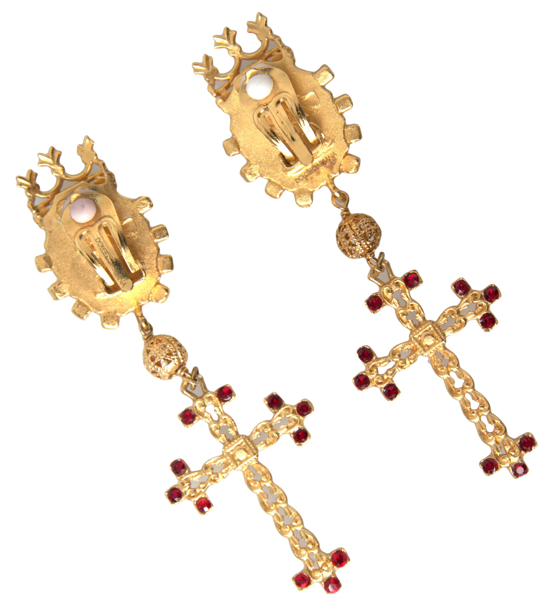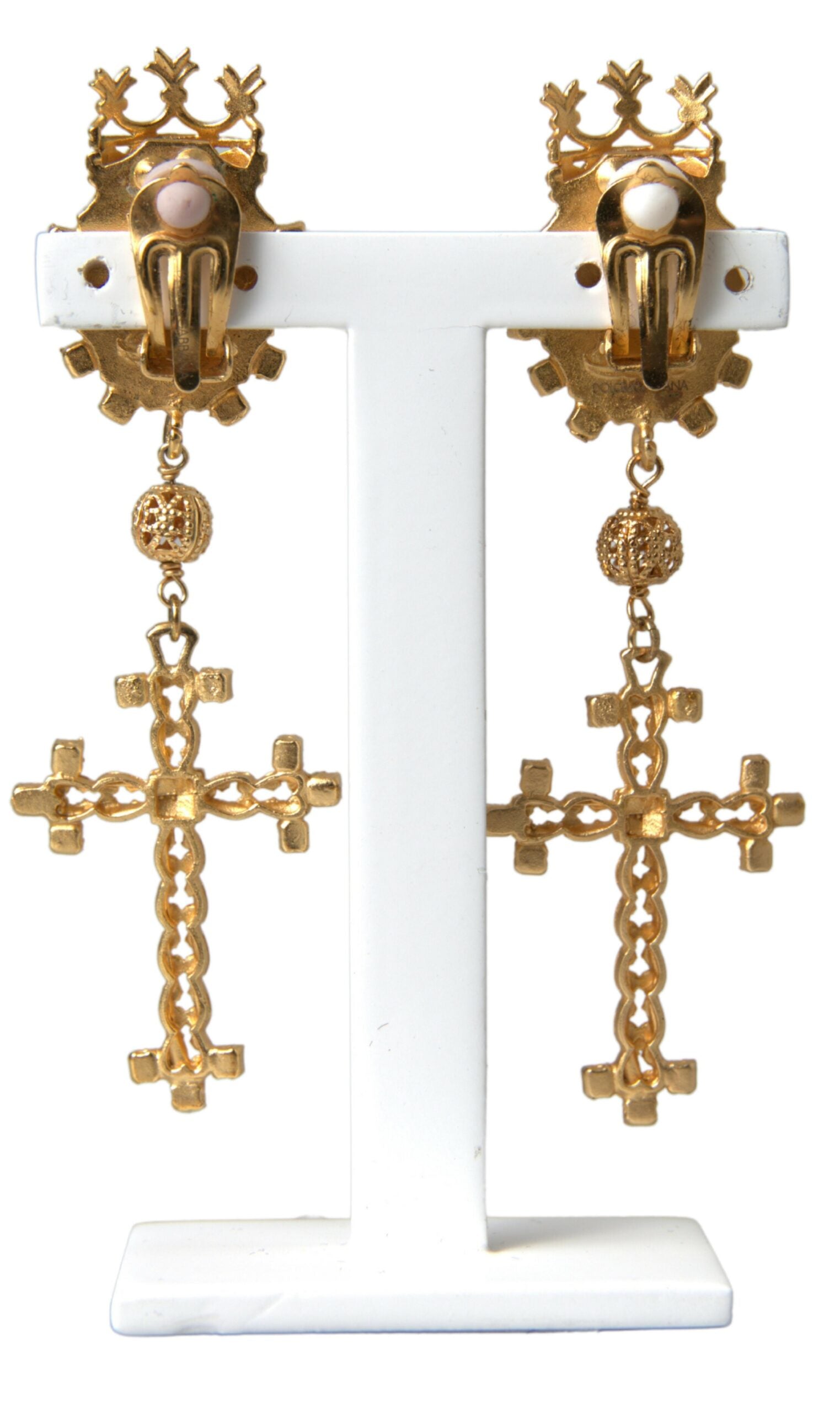 Add a touch of sophistication to your ensemble with these exquisite Dolce & Gabbana clip-on earrings. Boasting an elegant cross and crown motif, these dangling earrings are adorned with radiant crystals that catch the light beautifully, infusing your look with a regal charm. Made in Italy, these earrings from Dolce & Gabbana’s jewelry collection are a testament to the brand’s commitment to luxury craftsmanship.