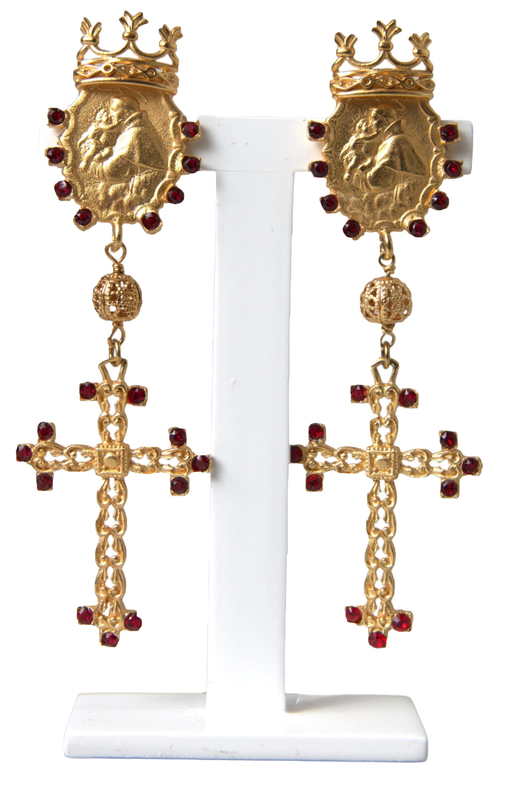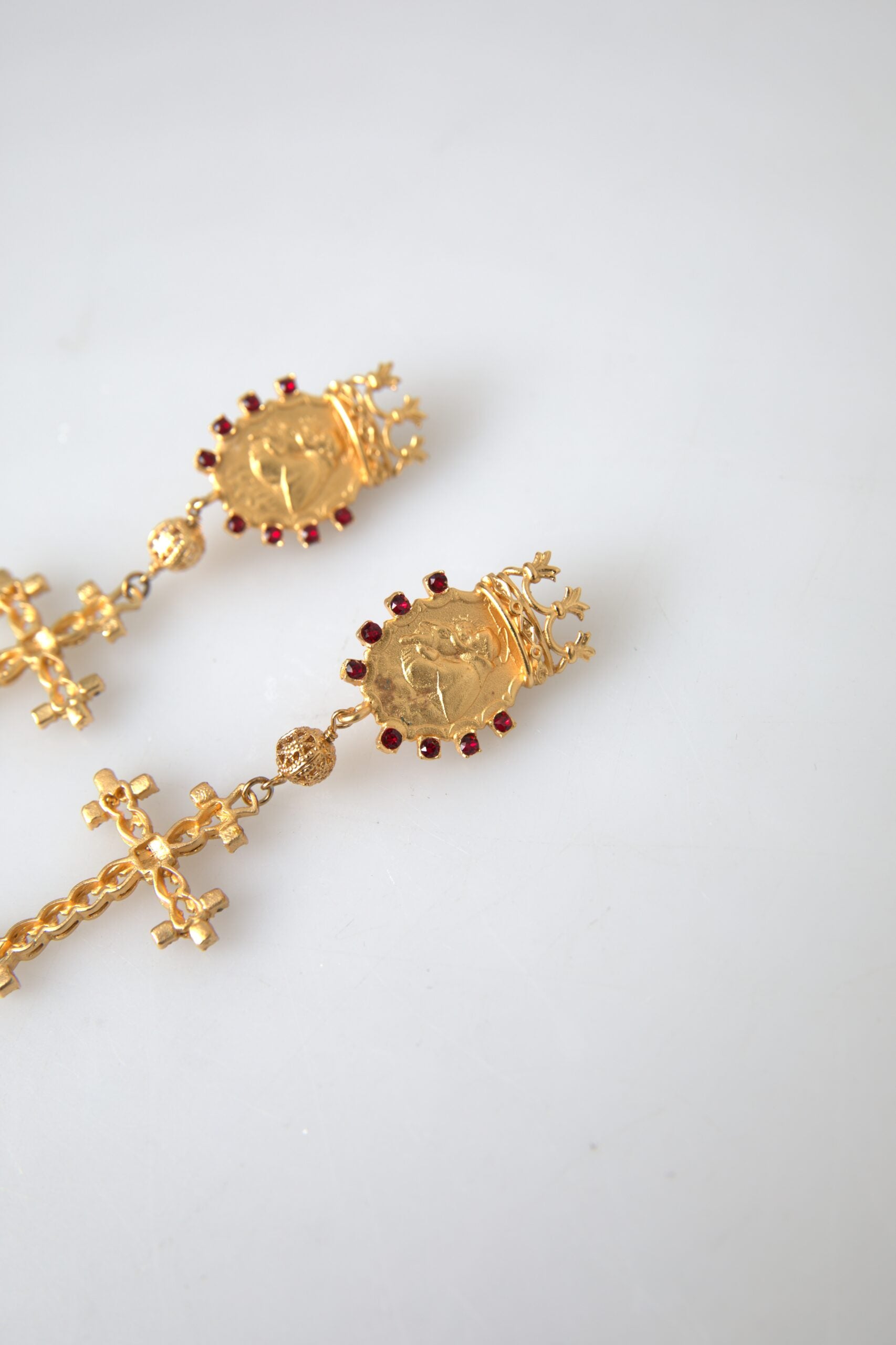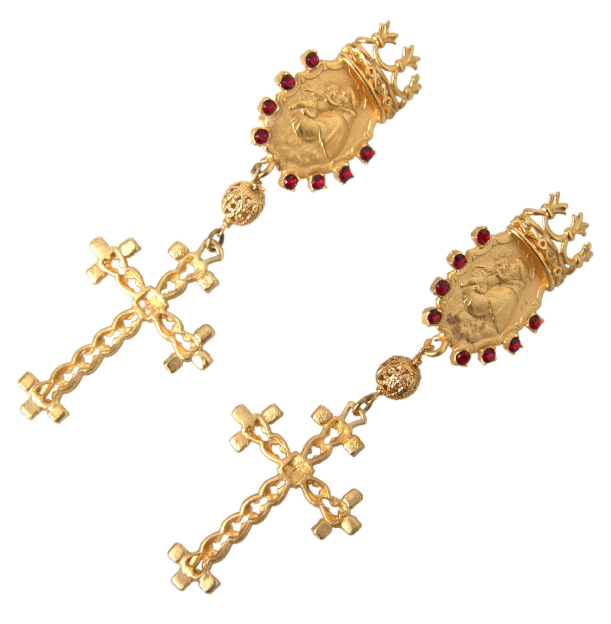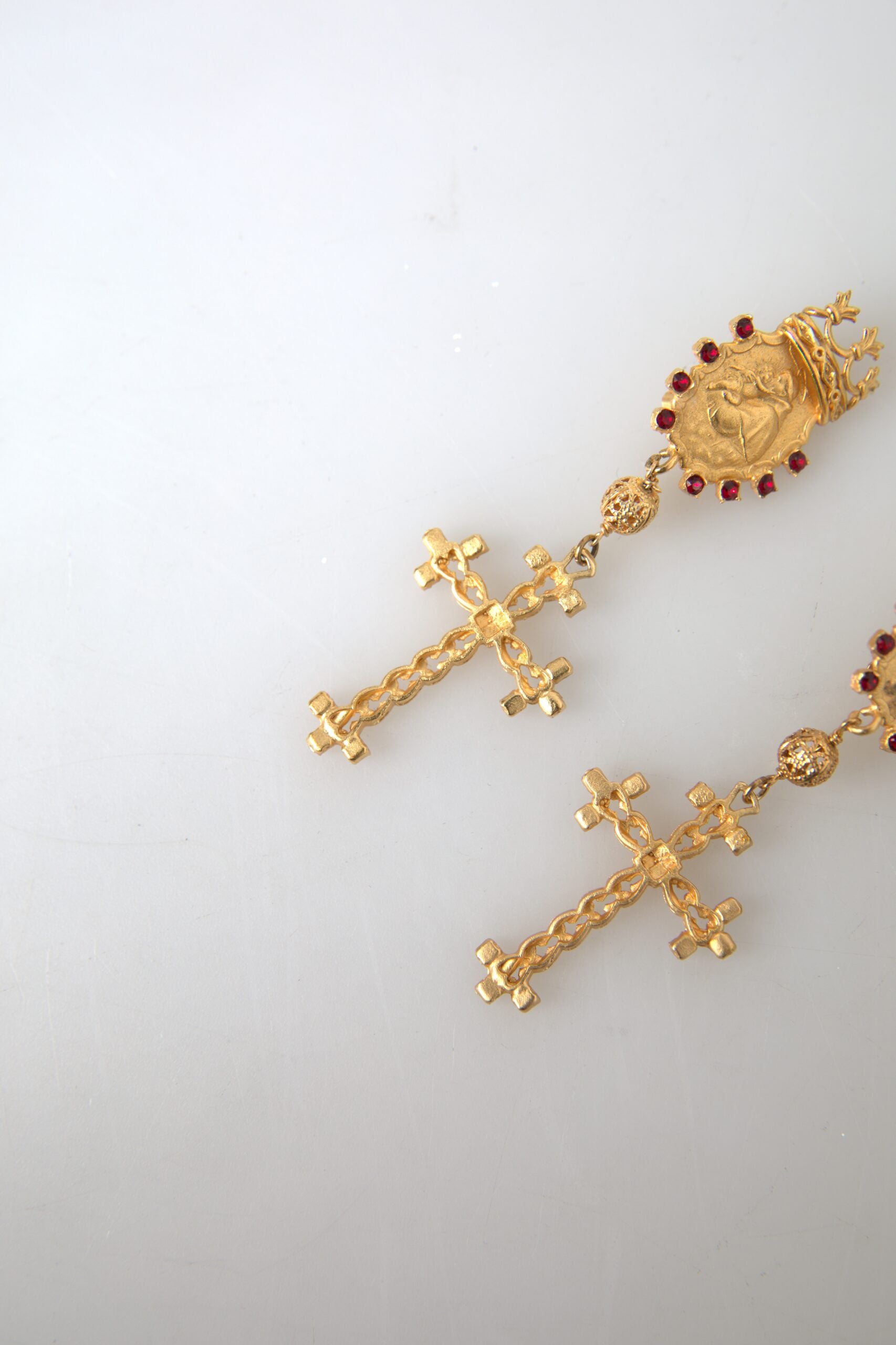 Add a touch of sophistication to your ensemble with these exquisite Dolce & Gabbana clip-on earrings. Boasting an elegant cross and crown motif, these dangling earrings are adorned with radiant crystals that catch the light beautifully, infusing your look with a regal charm. Made in Italy, these earrings from Dolce & Gabbana’s jewelry collection are a testament to the brand’s commitment to luxury craftsmanship.