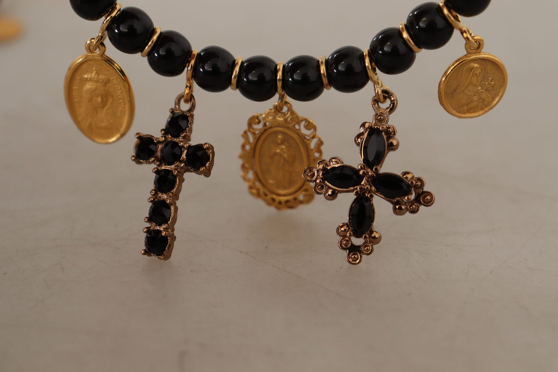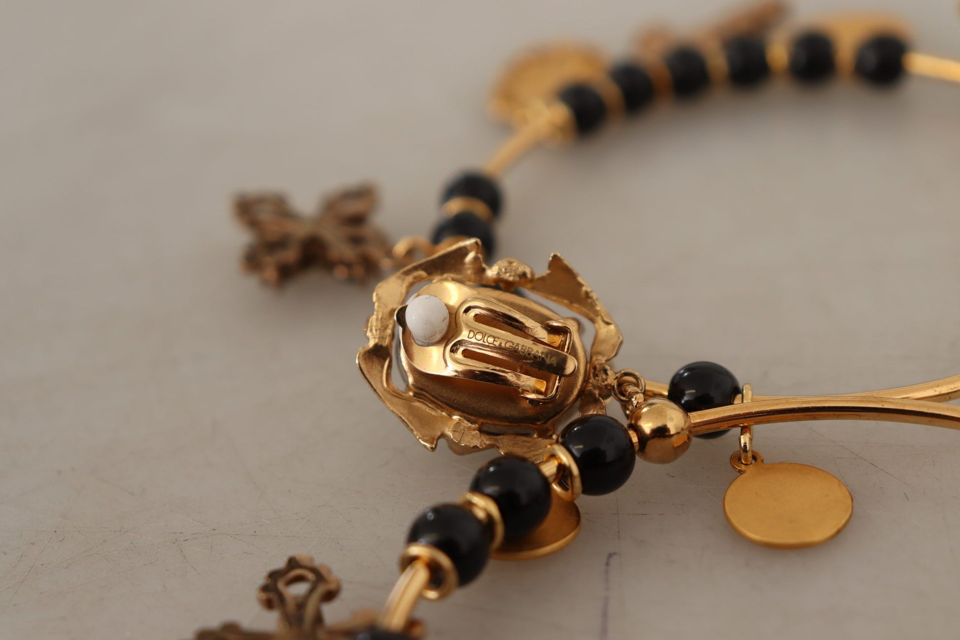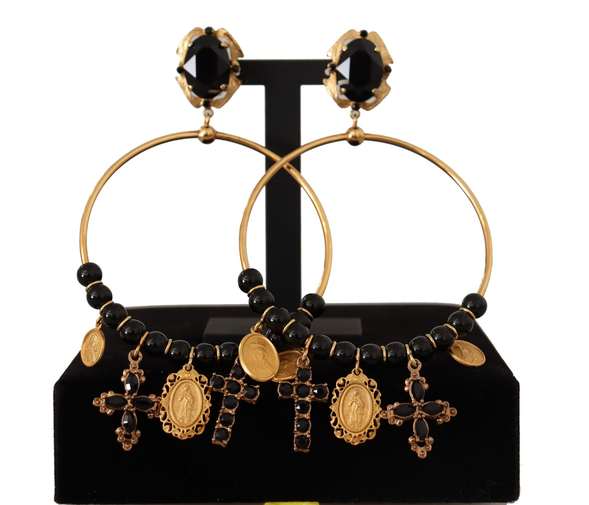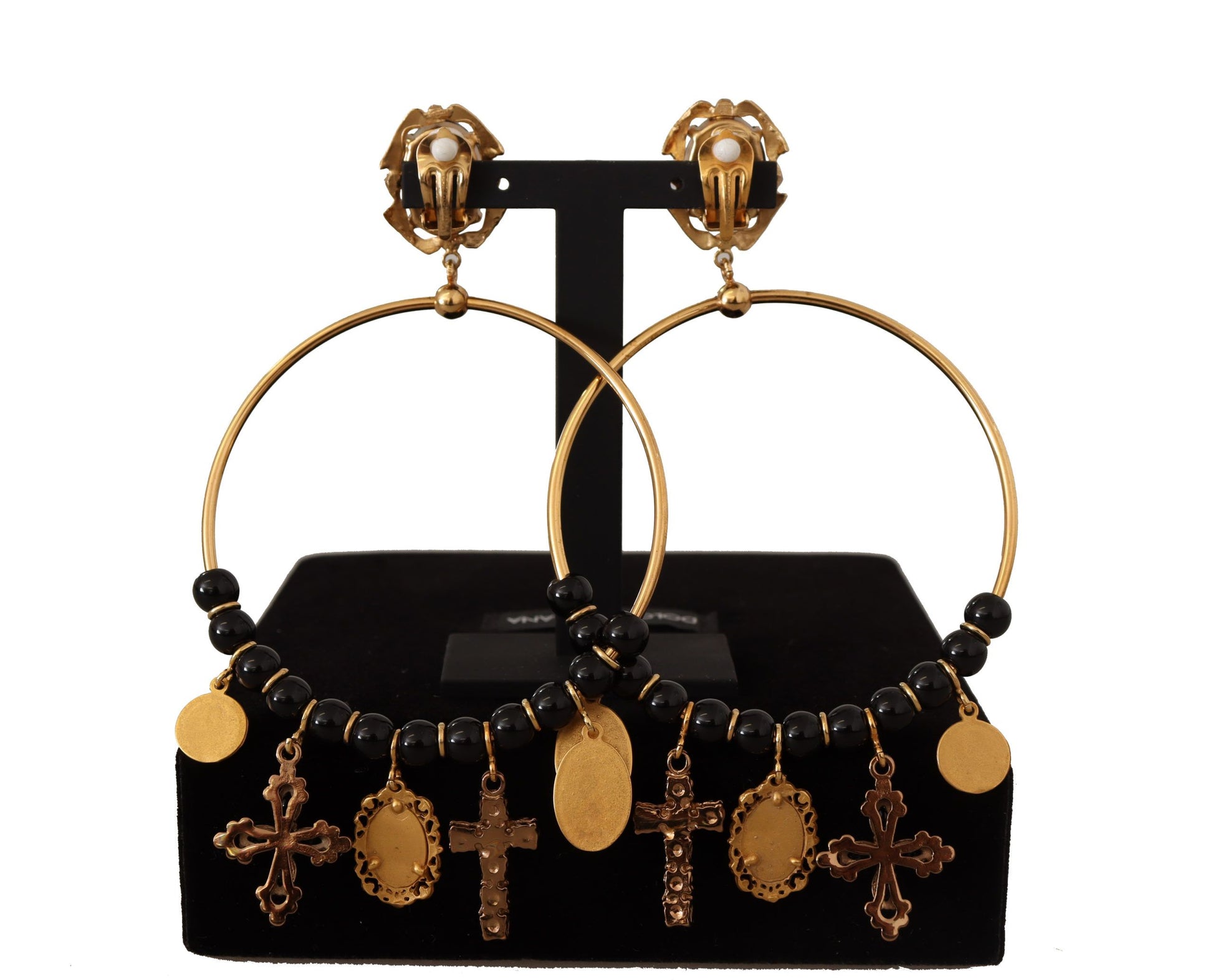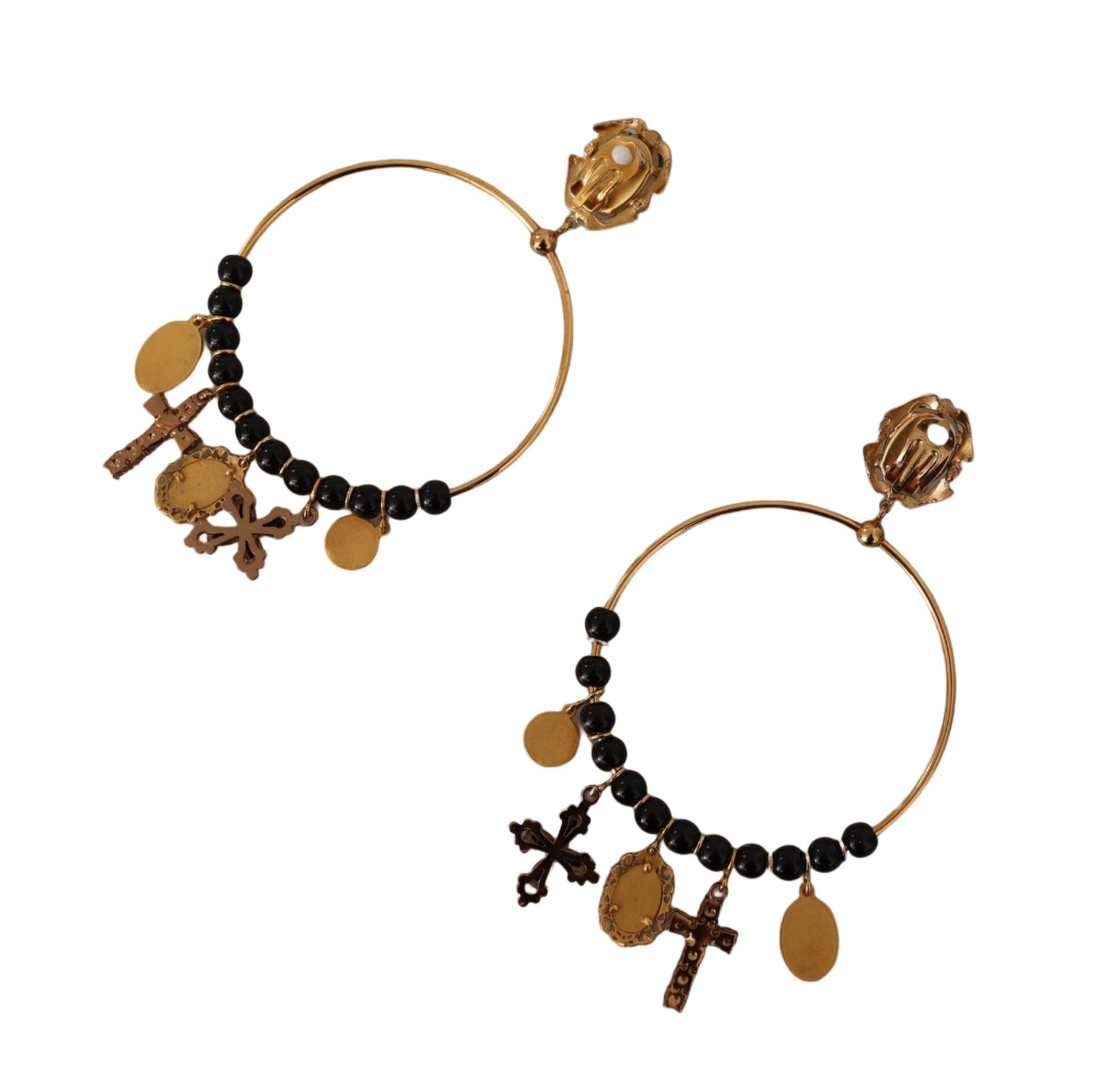 Step into a world of sophistication with these stunning clip-on dangling hoop earrings, a perfect blend of Italian craftsmanship and luxury. These striking pieces from Dolce & Gabbana are more than just accessories; they are a statement of high fashion and elegance, guaranteed to elevate any ensemble with their sparkling black crystals and beads. Ideal for evening events or special occasions, these gorgeous earrings are sure to turn heads and garner admiration.