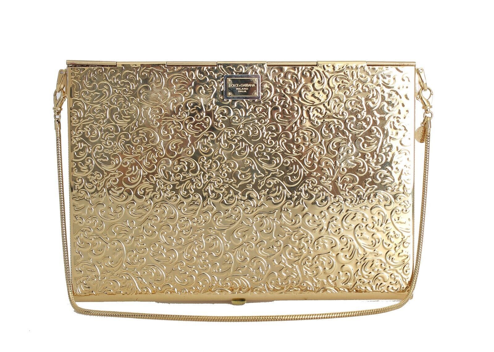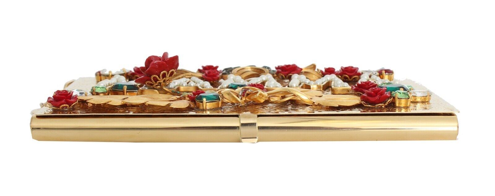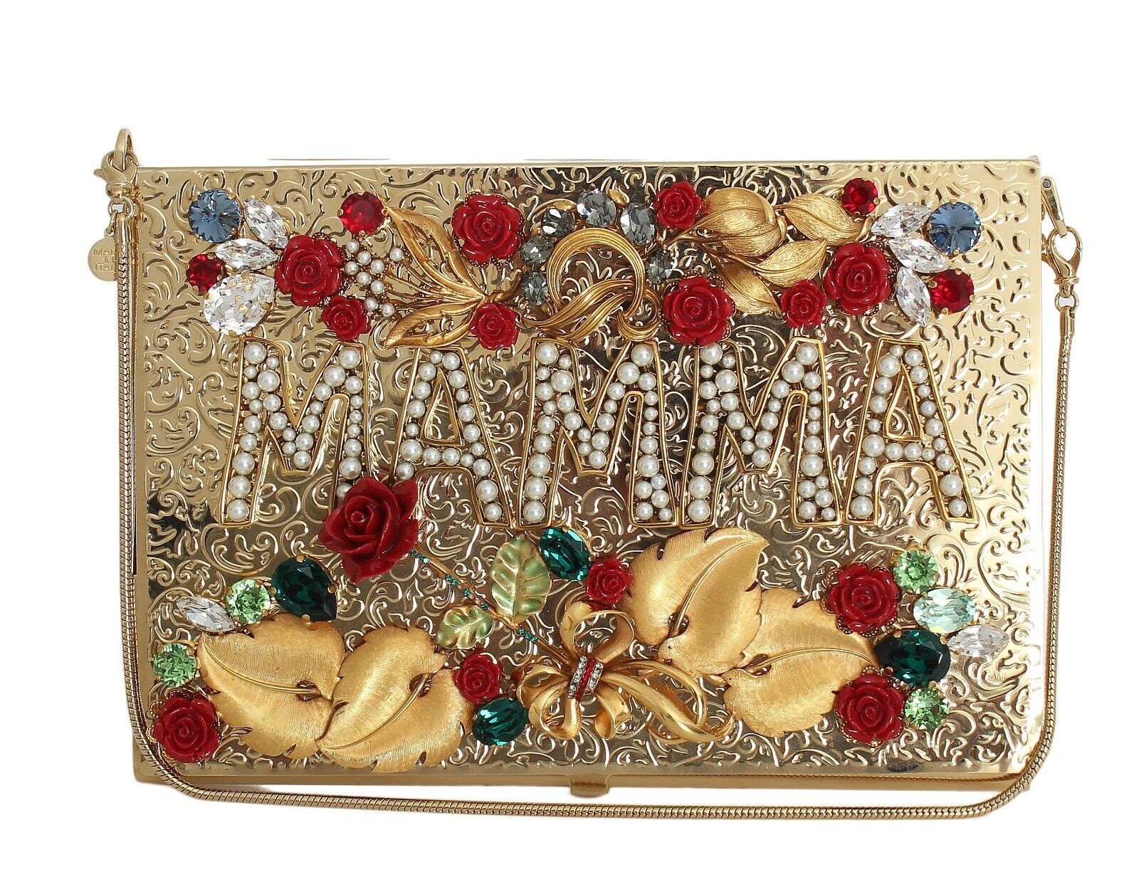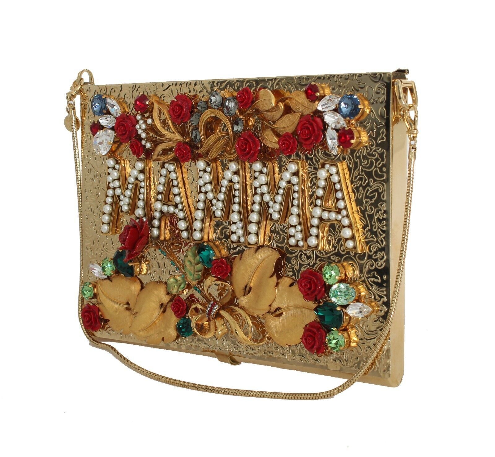 Embrace sophistication with this exquisite Dolce & Gabbana Box Clutch, perfect for elevating your evening attire. The luxurious gold-toned brass is adorned with vibrant red rose embellishments and the charming ‘MAMMA’ motif, while the glint of real crystals adds a dazzling touch of glamour. Its red suede inner lining ensures your belongings are cradled in sumptuousness, and the detachable gold shoulder chain offers versatile carry options. This Italian-crafted piece clasps securely with a flap closure, flaunting the iconic logo as a mark of high fashion.