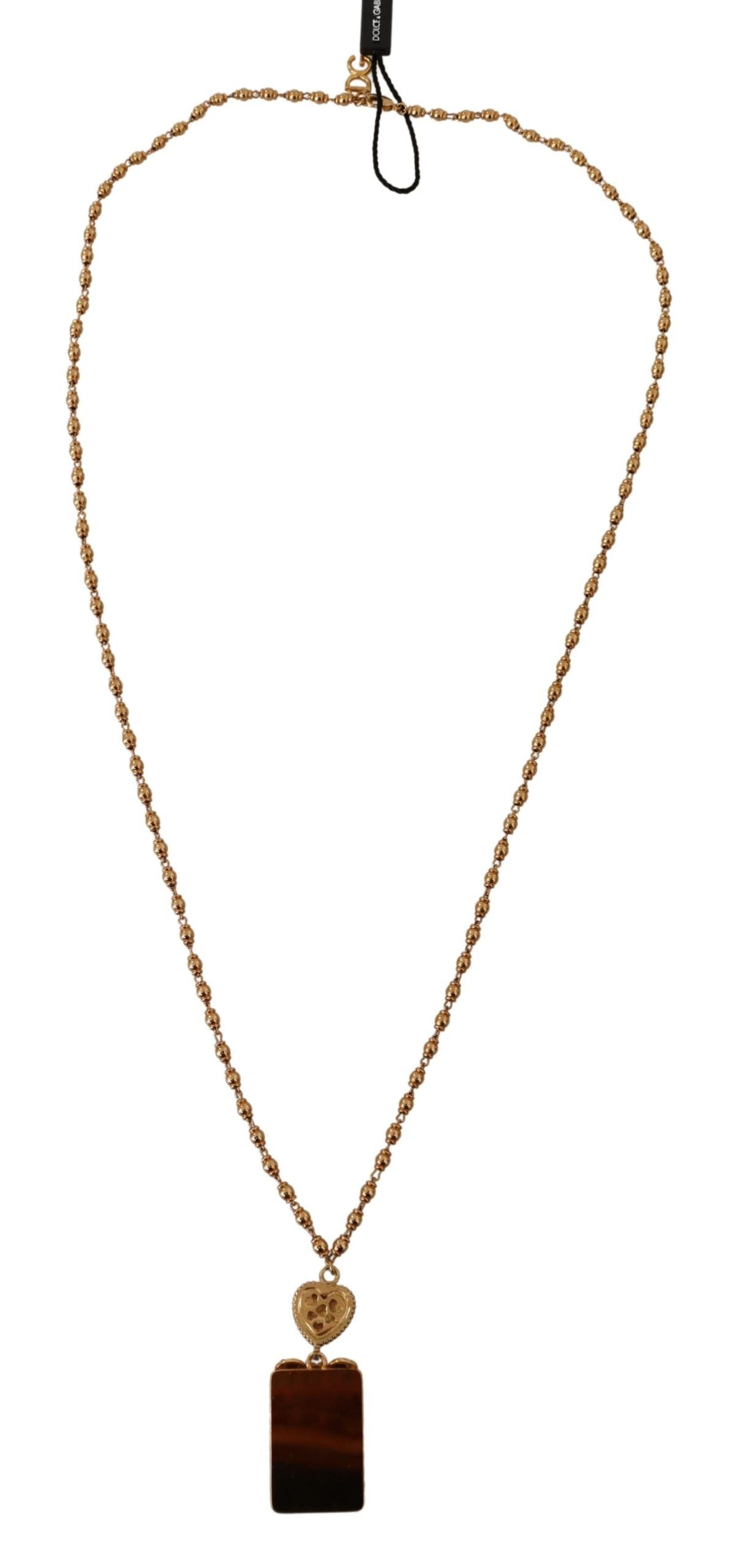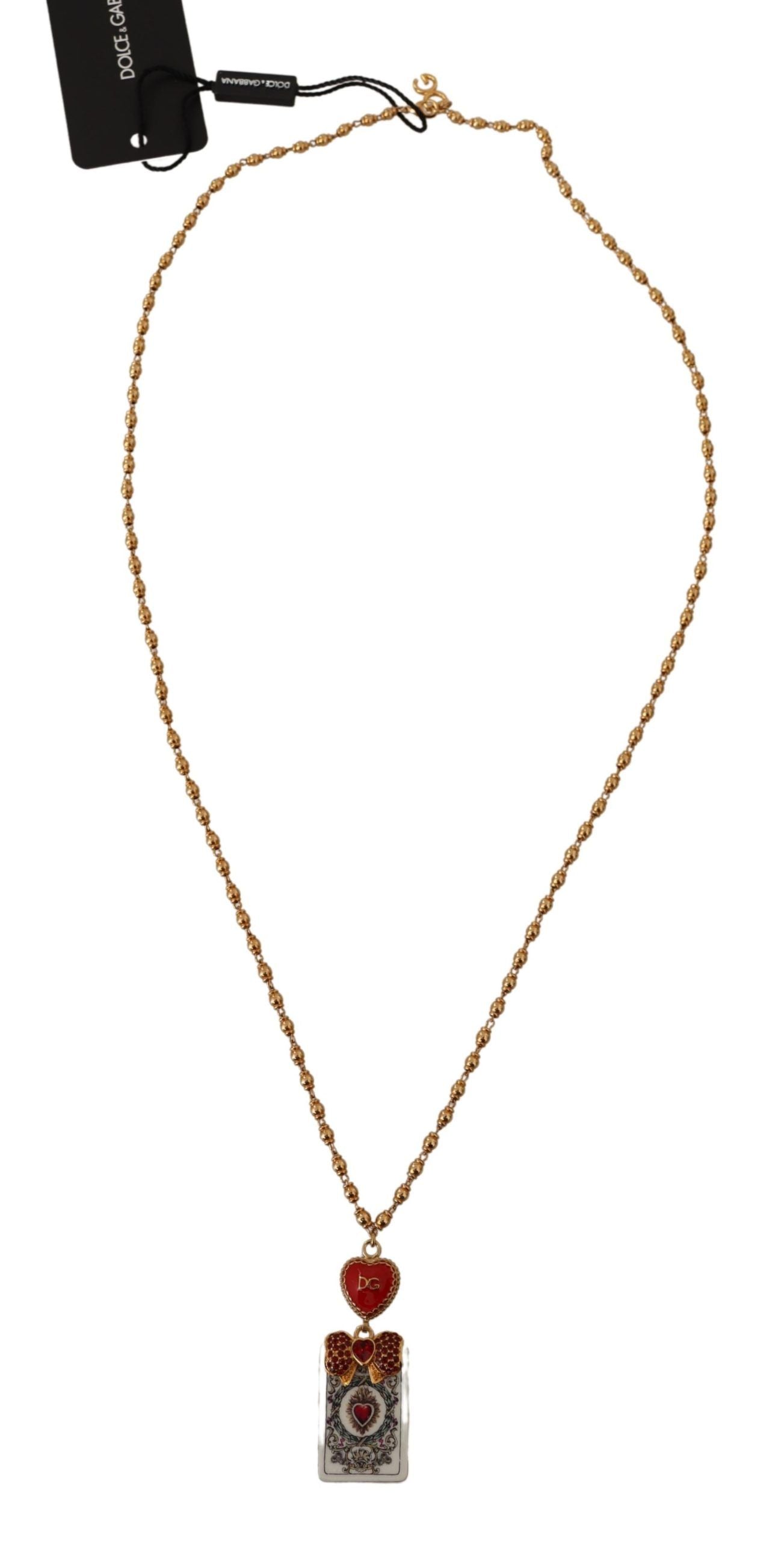 Exude elegance with this dazzling Gold Tone Necklace featuring a DG Heart Card Deck Crystal Pendant, an exquisite creation by Dolce & Gabbana. This stunning piece is perfect for adding a touch of glamour to any outfit. With its lobster clasp closure, you can adjust the necklace to drape beautifully at just the right length. Step out in style with this charming addition to your jewelry collection, crafted with precision and care in Italy.