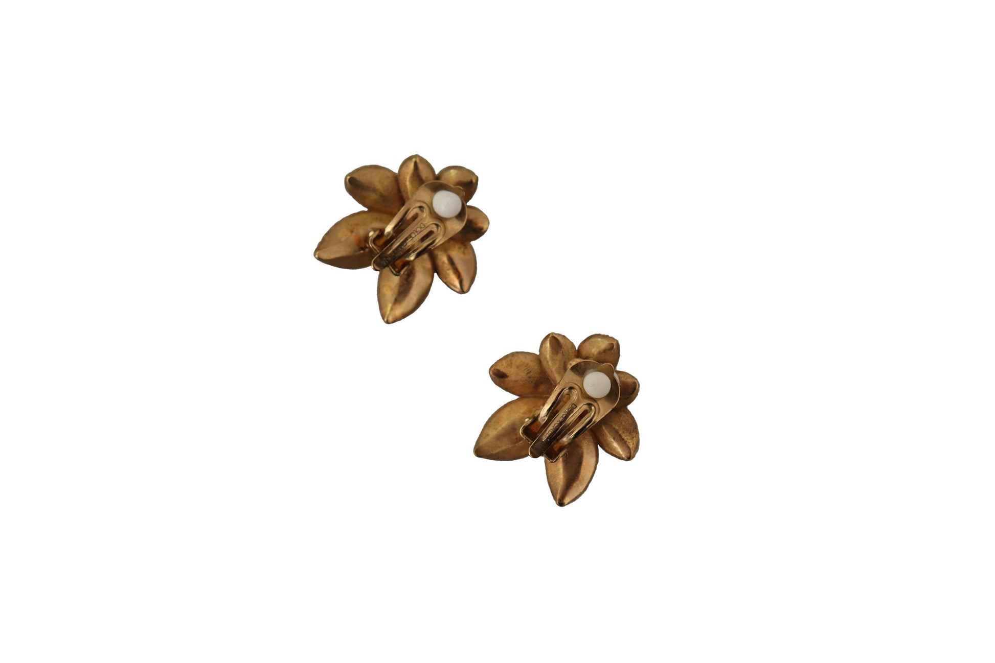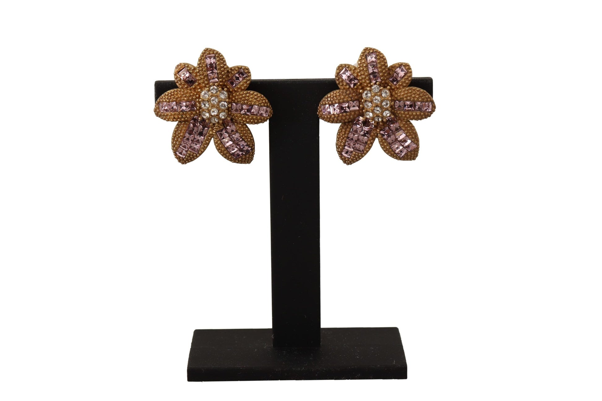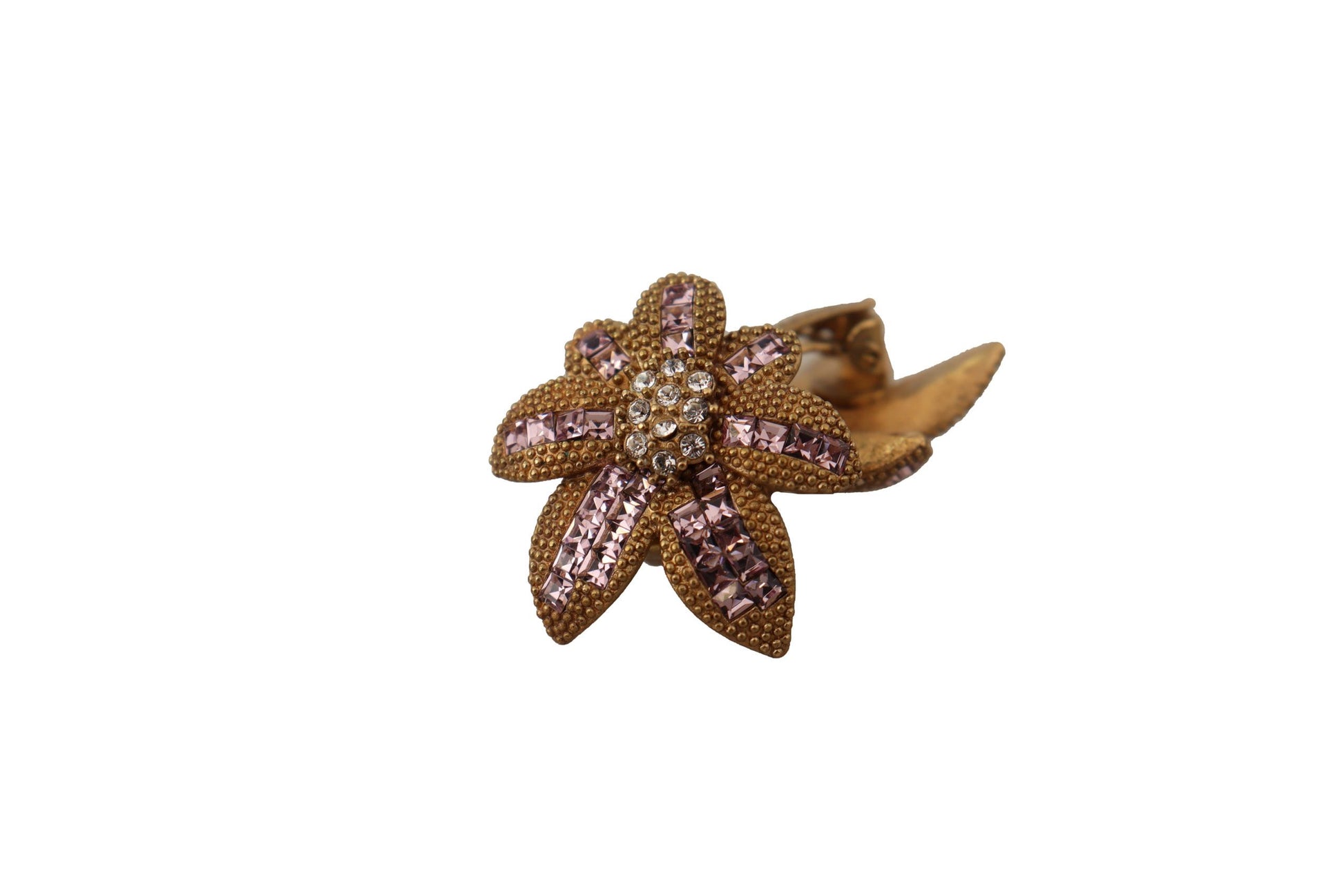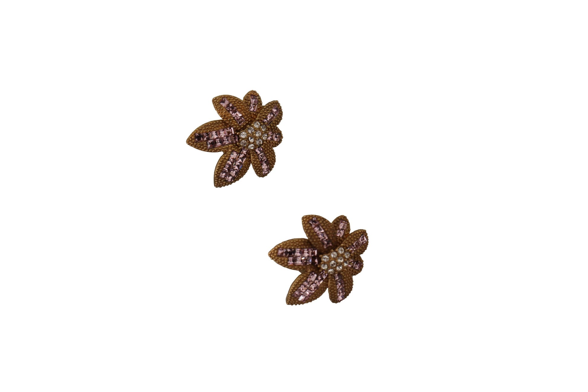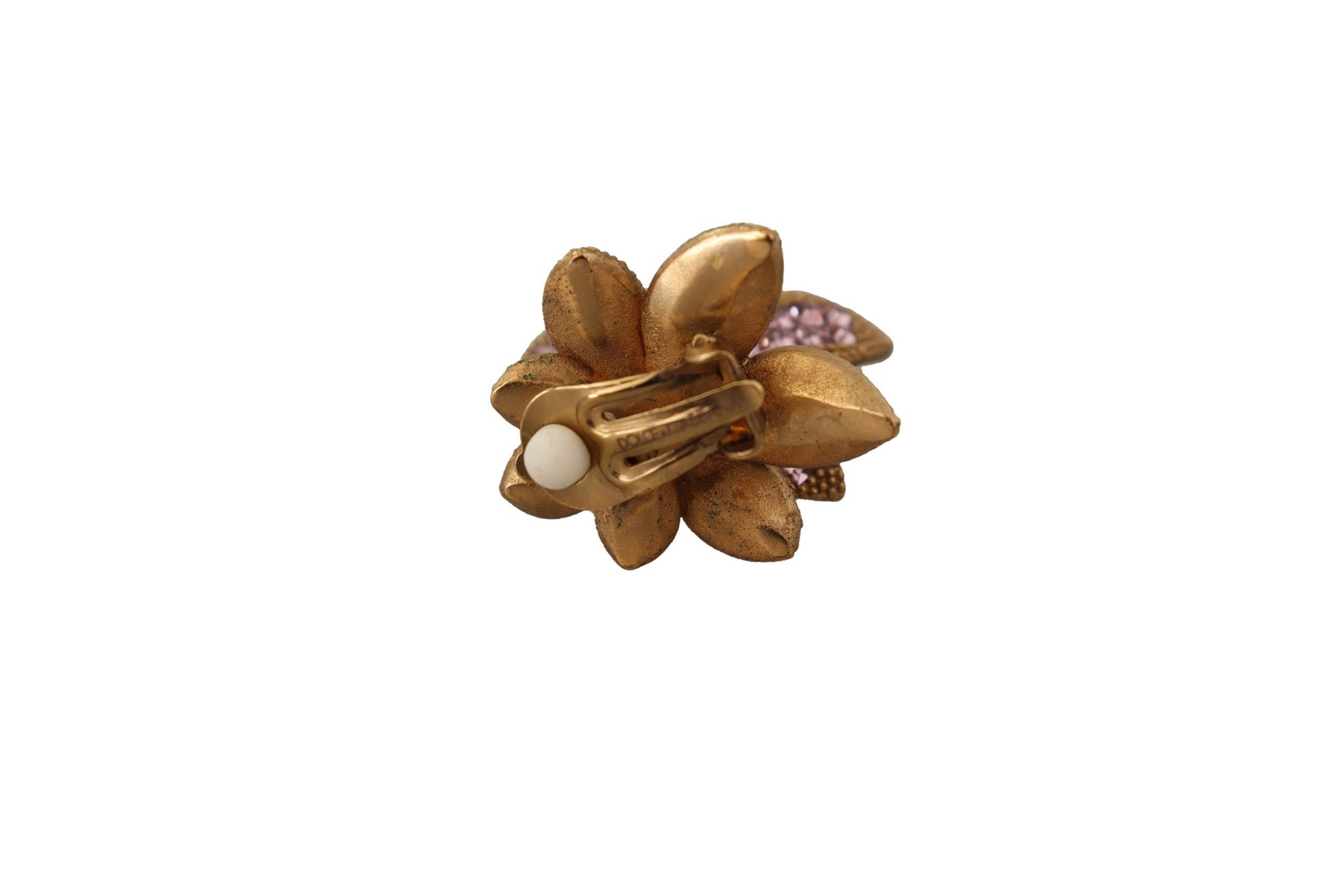 Flaunt your elegant taste with these stunning 100% Authentic Dolce & Gabbana floral clip-on earrings. Exquisitely crafted with a blend of gleaming brass and sparkling glass crystals, these pieces glint with every move, evoking a luxurious allure. The delicate clear and pink crystals add a subtle hint of color, perfect for elevating any outfit. Proudly made in Italy, these are not just accessories but a statement of sophisticated style.