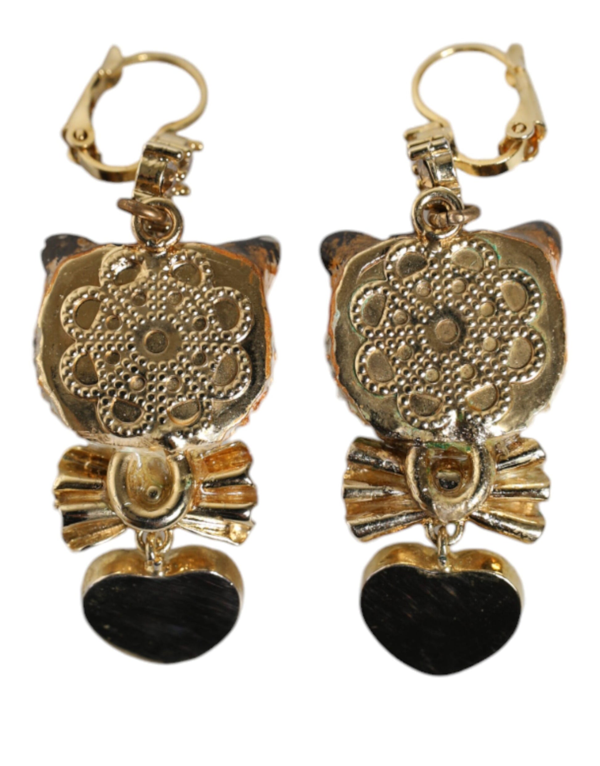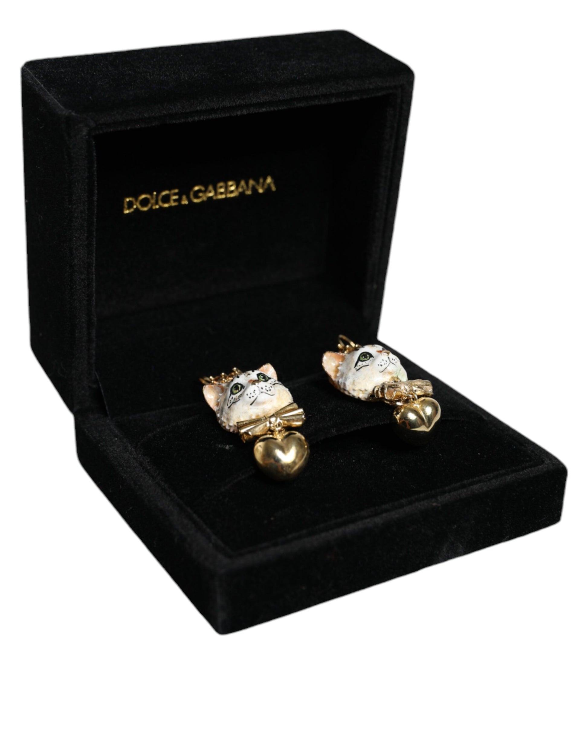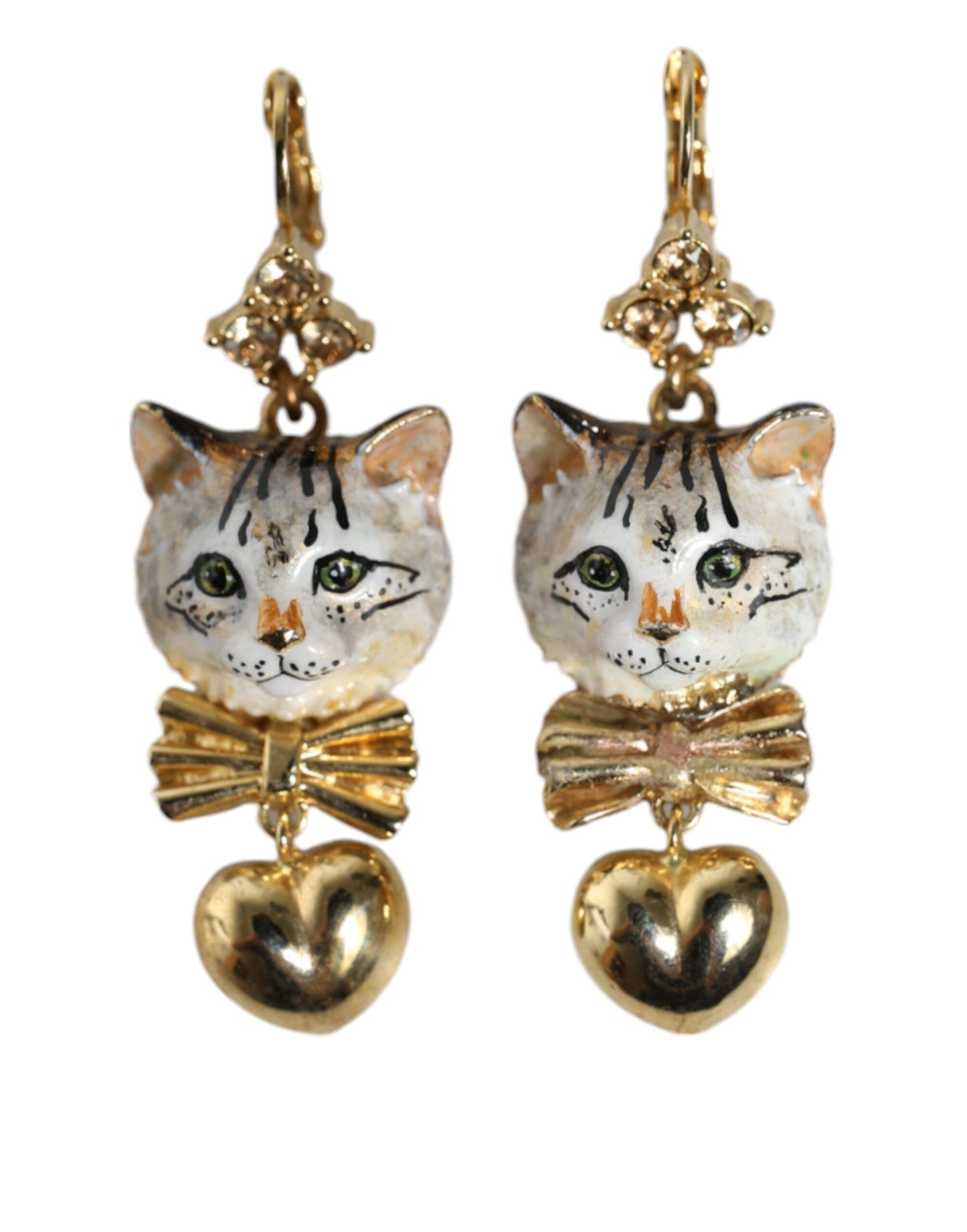 Gorgeous new with tags, 100% authentic. Dolce & Gabbana earrings with hand-painted cat, gold metal details, heart pendants and crystals.