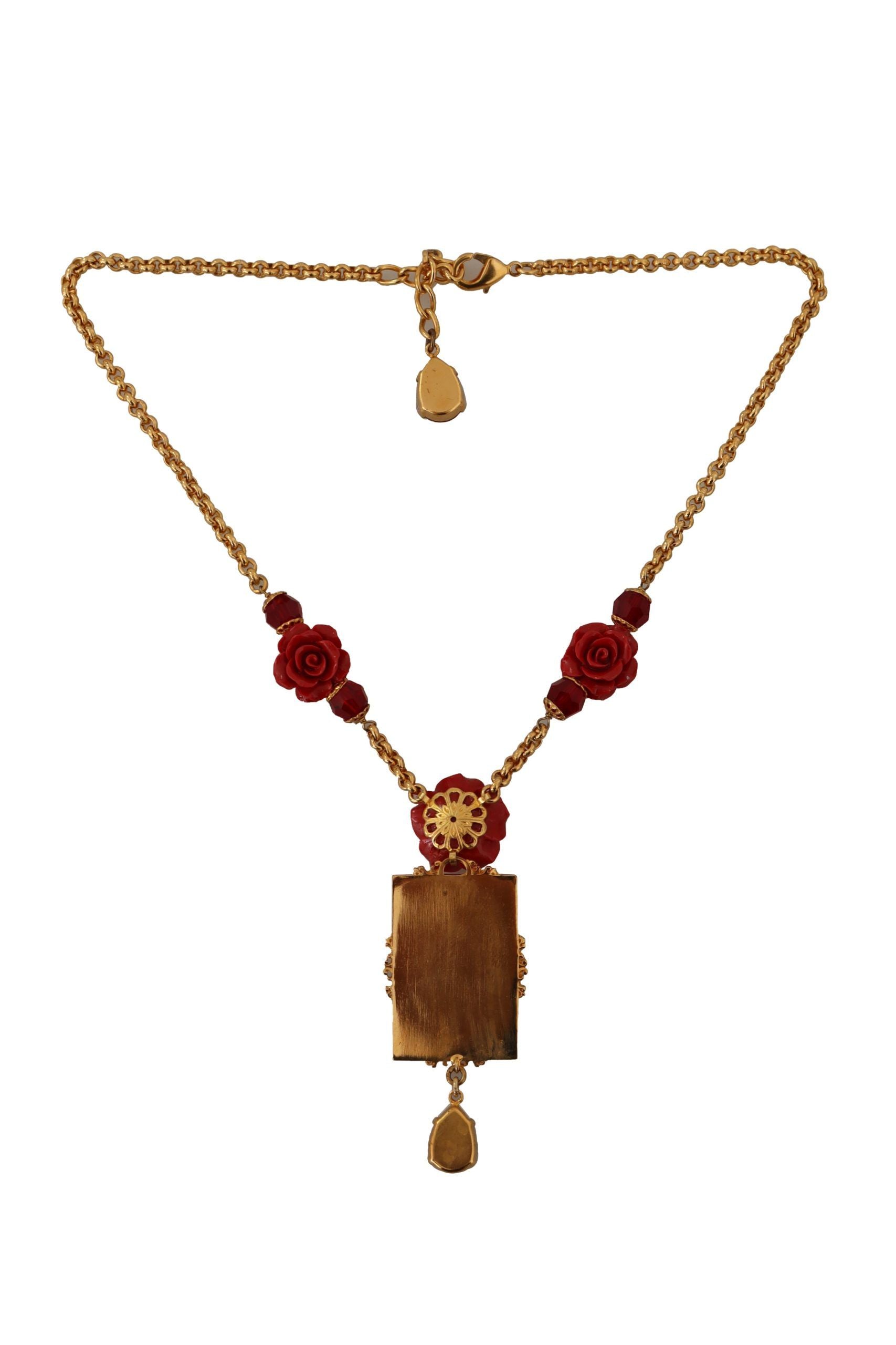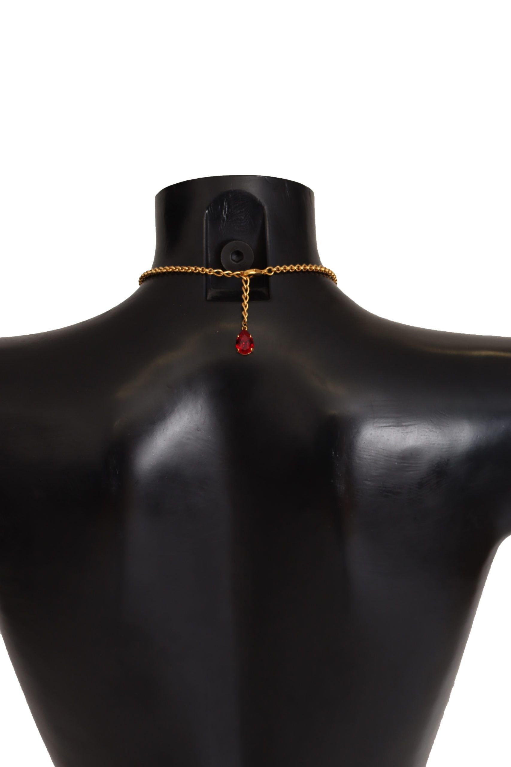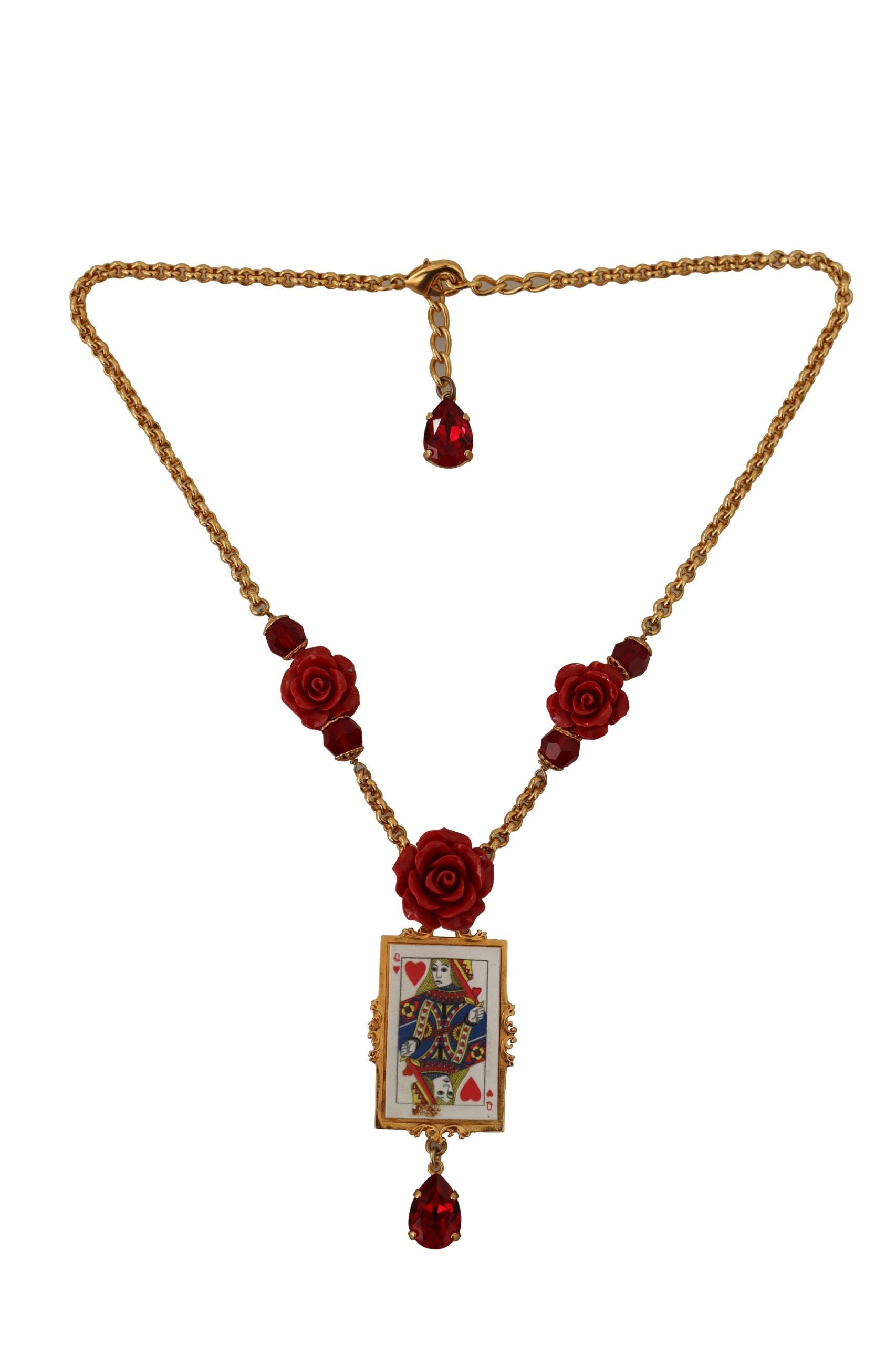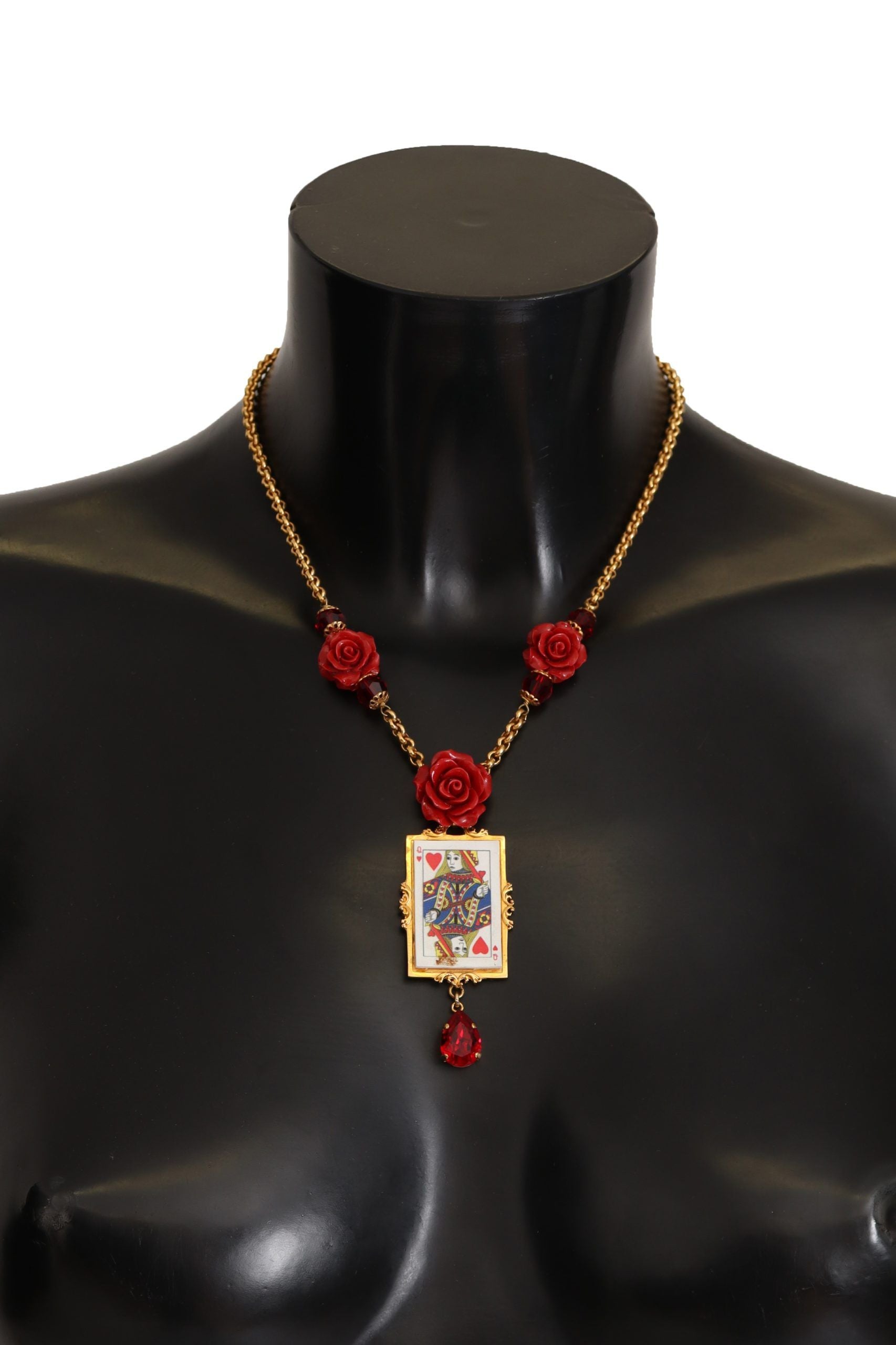 Elevate your ensemble with the opulent charm of this Dolce & Gabbana necklace, a sumptuous piece sure to crown your look with regality. Drawing inspiration from the splendor of royal card decks, this necklace sparkles with craftsmanship. A mesmerizing array of red crystals complement the gold-tone brass and resin elements, creating a magnificent adornment that sits gracefully along your neckline.