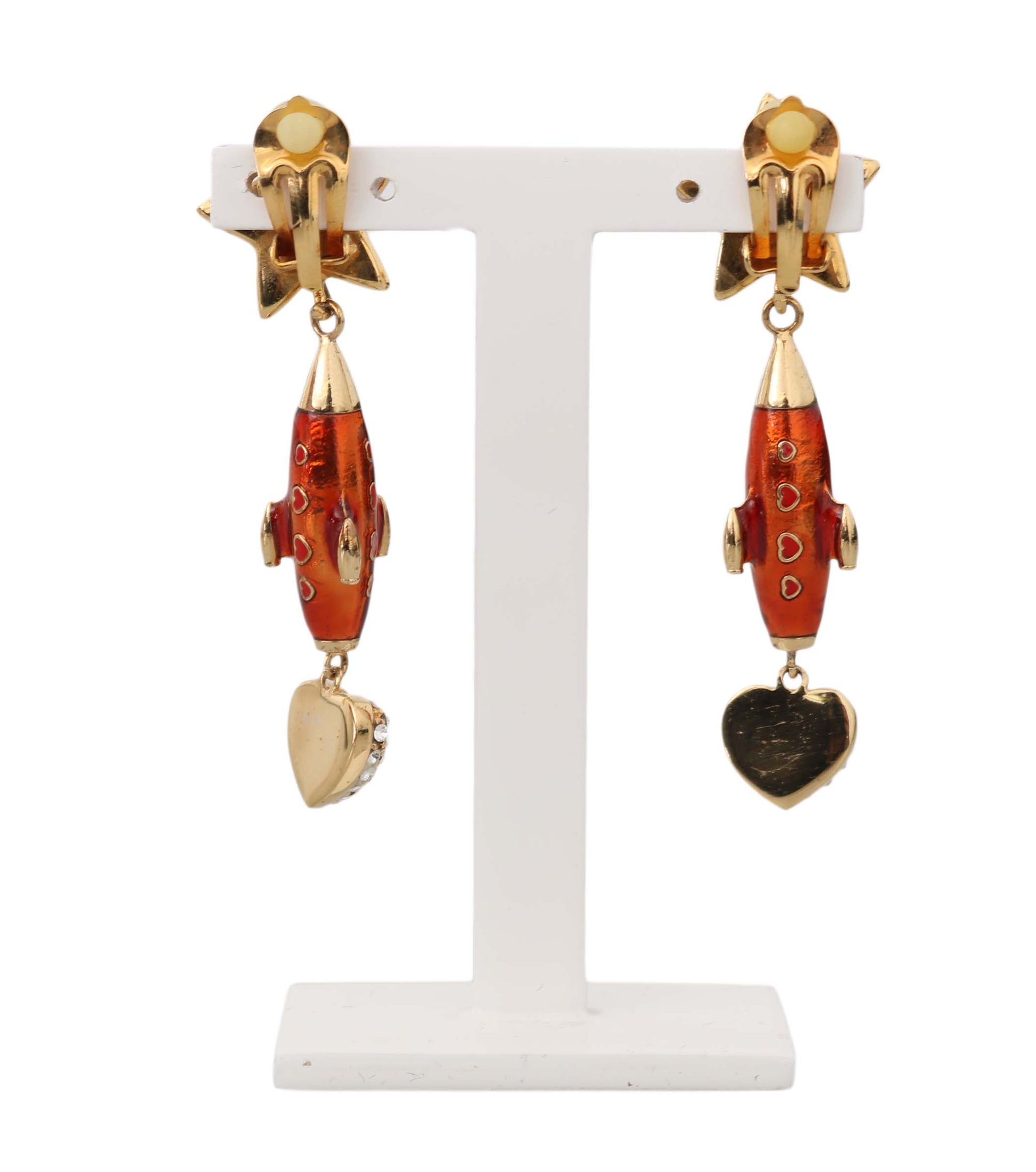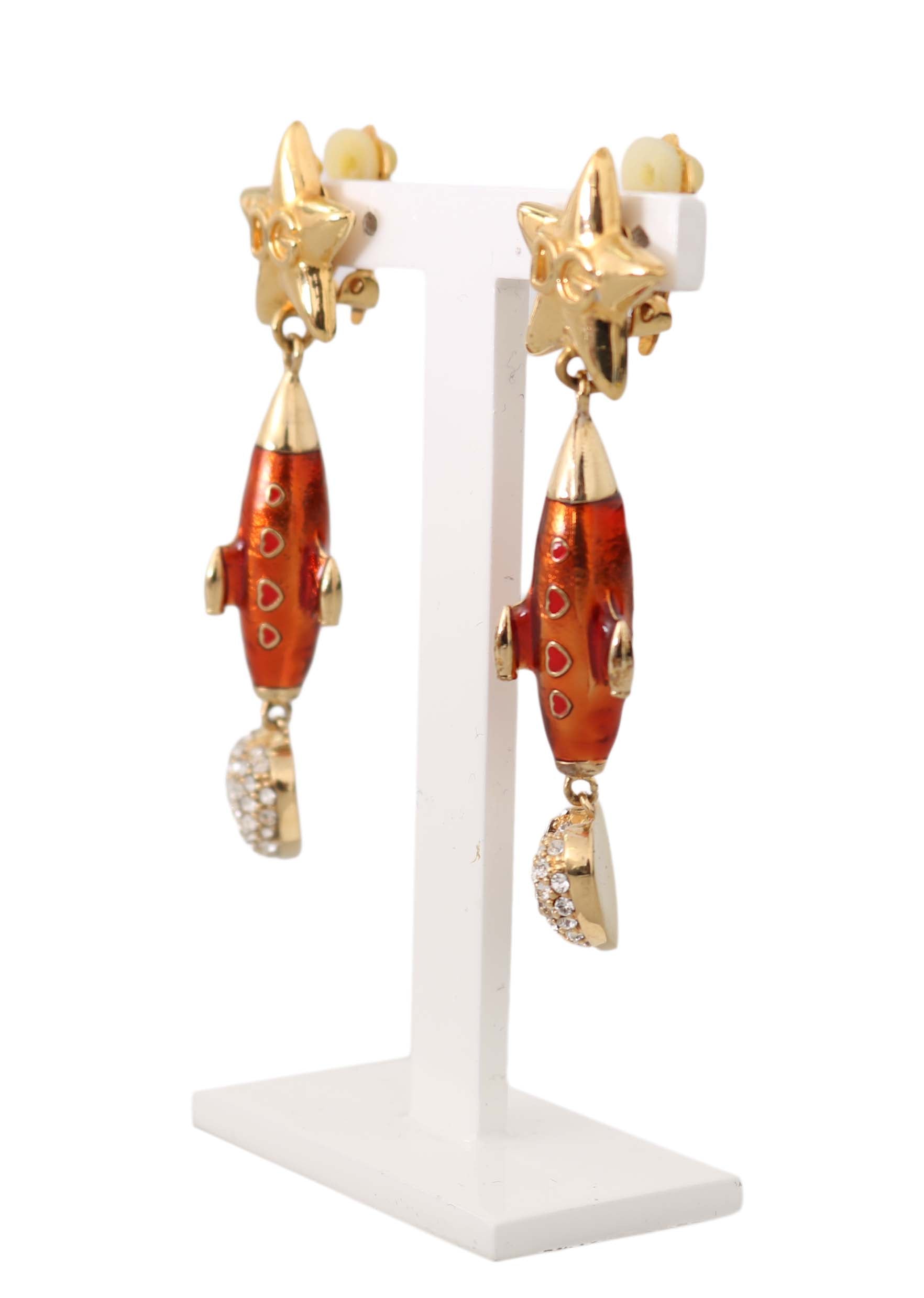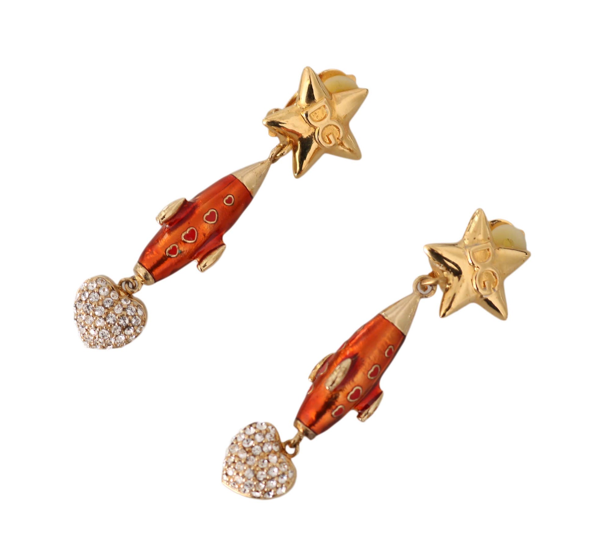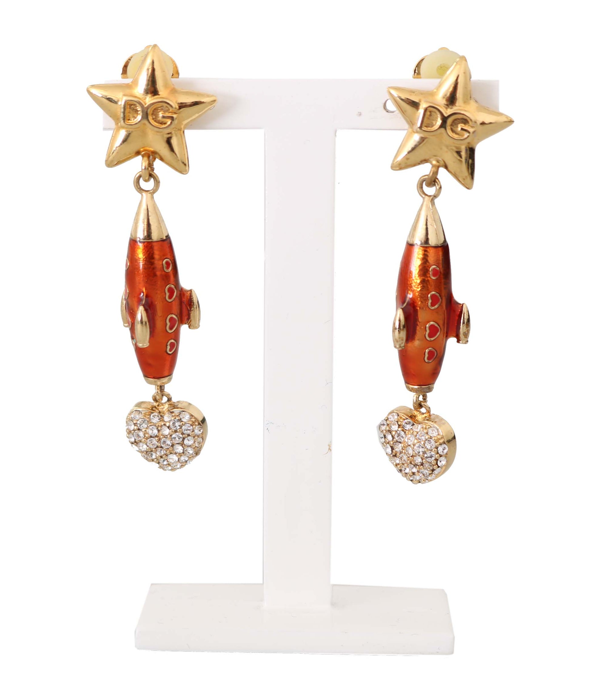 Adorn your look with a touch of otherworldly glamour with these stunning Dolce & Gabbana Rocket earrings. These gold-toned clip-ons feature a dazzling arrangement of clear crystals, accented with delicate enamel details, designed to elevate any ensemble. As a statement piece or a complement to your evening wear, these earrings are an embodiment of sophistication and luxury, crafted with precision in Italy.
