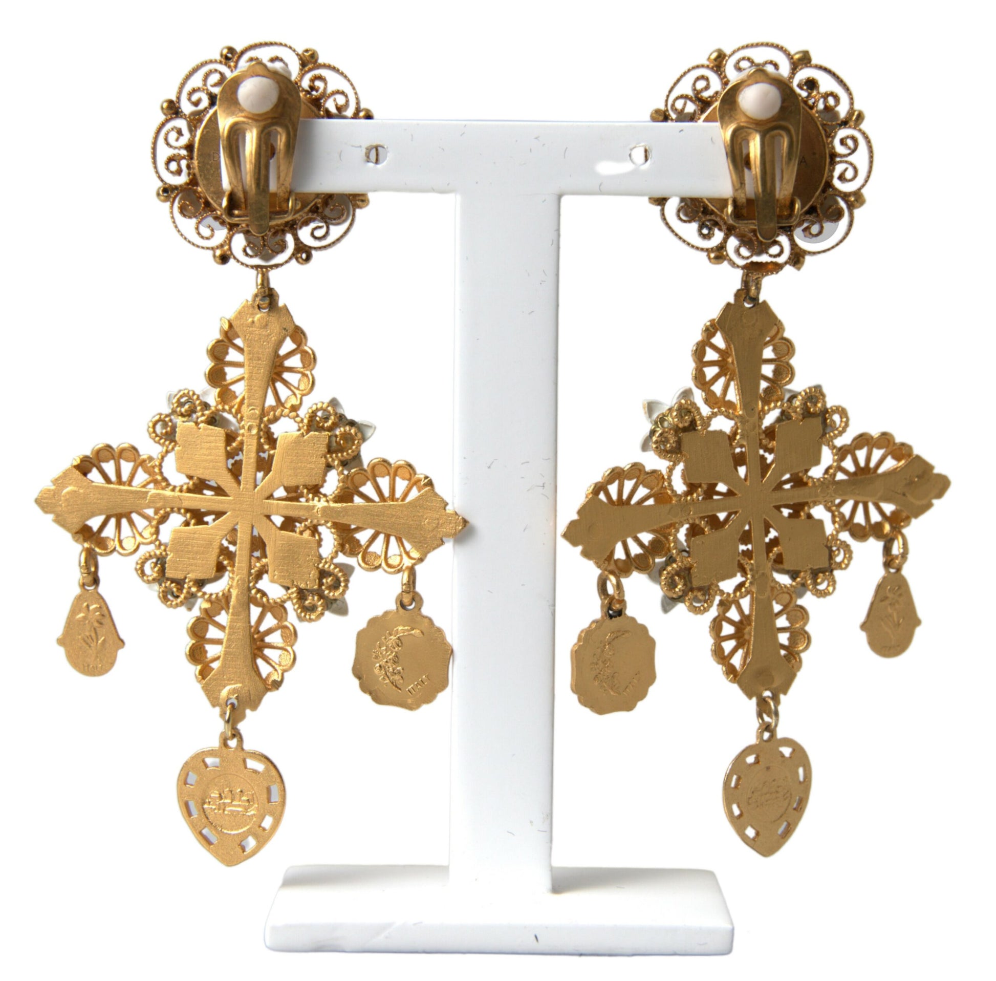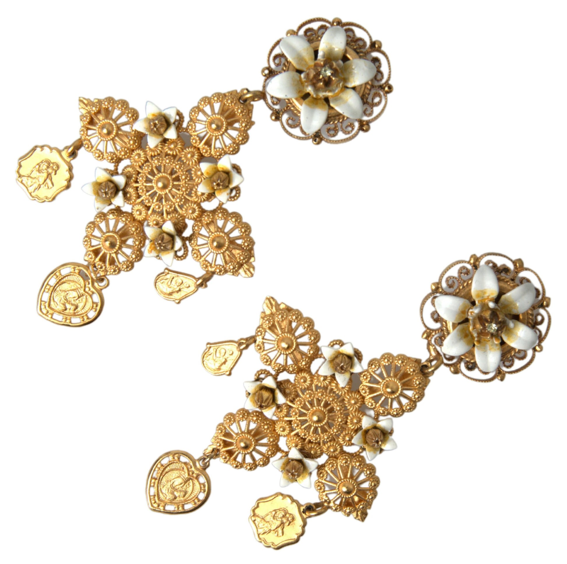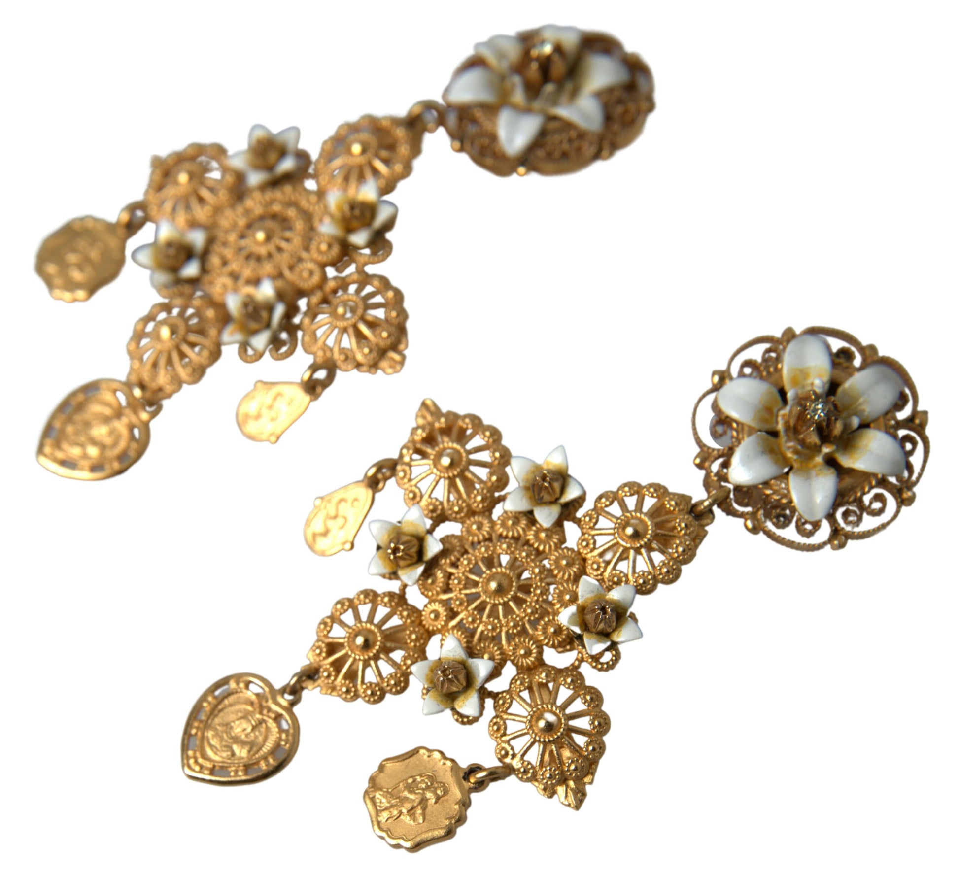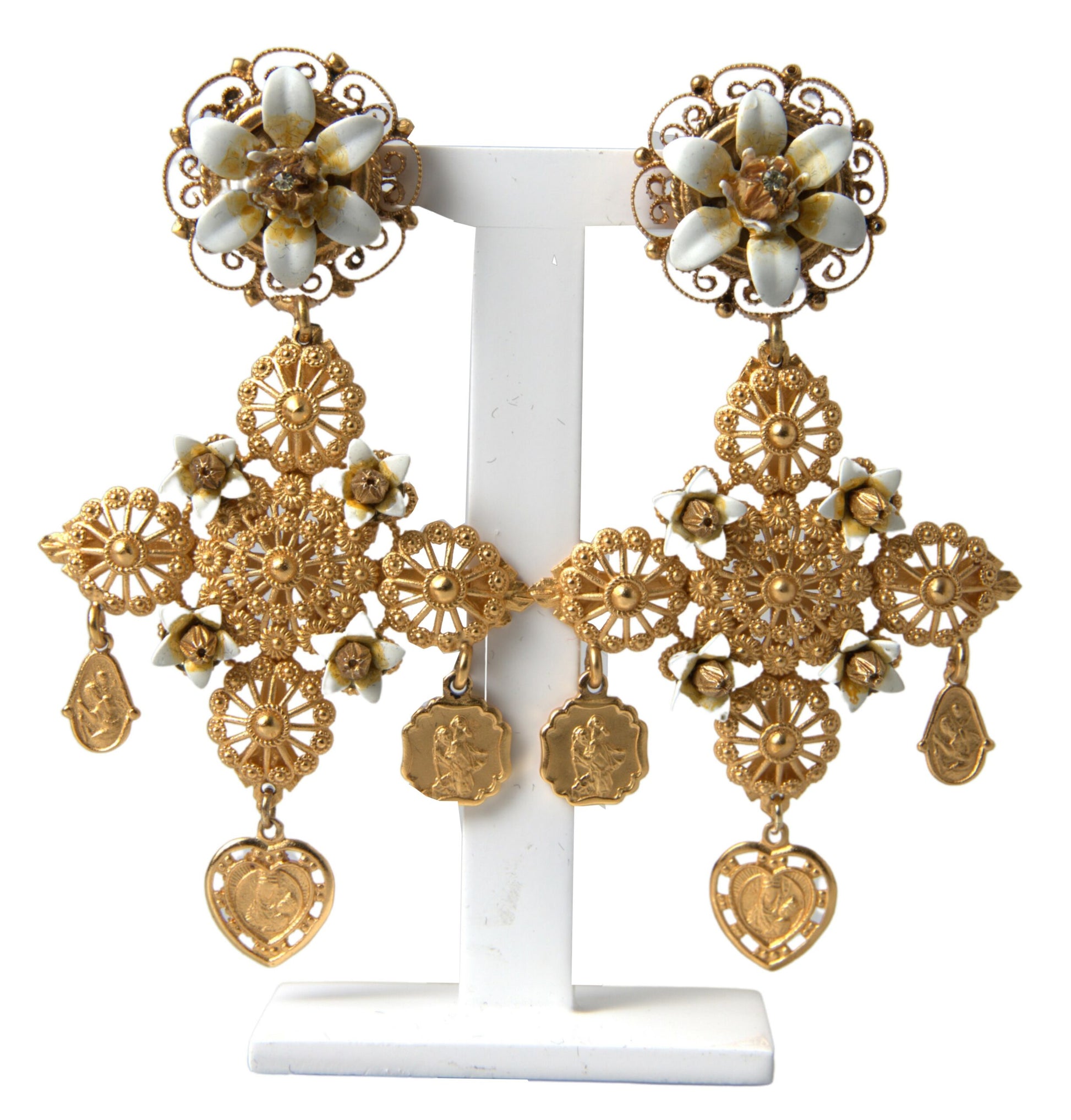 Exude sophistication with these exquisite Dolce & Gabbana clip-on earrings, featuring a striking Cross Madonna and flower design. Crafted from high-quality brass and accented with pristine clear crystals, these dangling earrings are a testament to Italian craftsmanship. The intricate gold-tone filigree and charming white resin flowers make these earrings a captivating accessory for any ensemble.