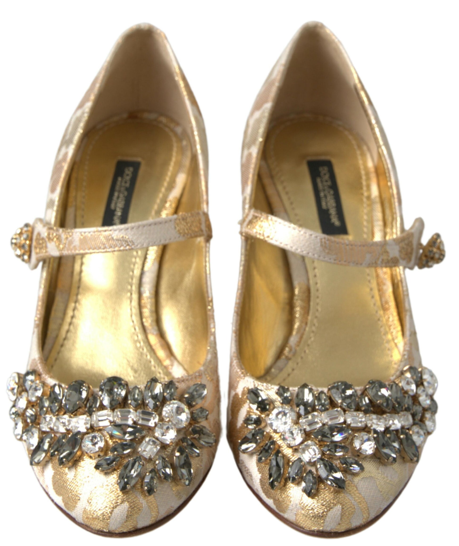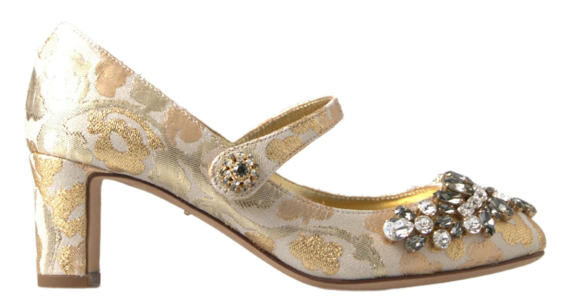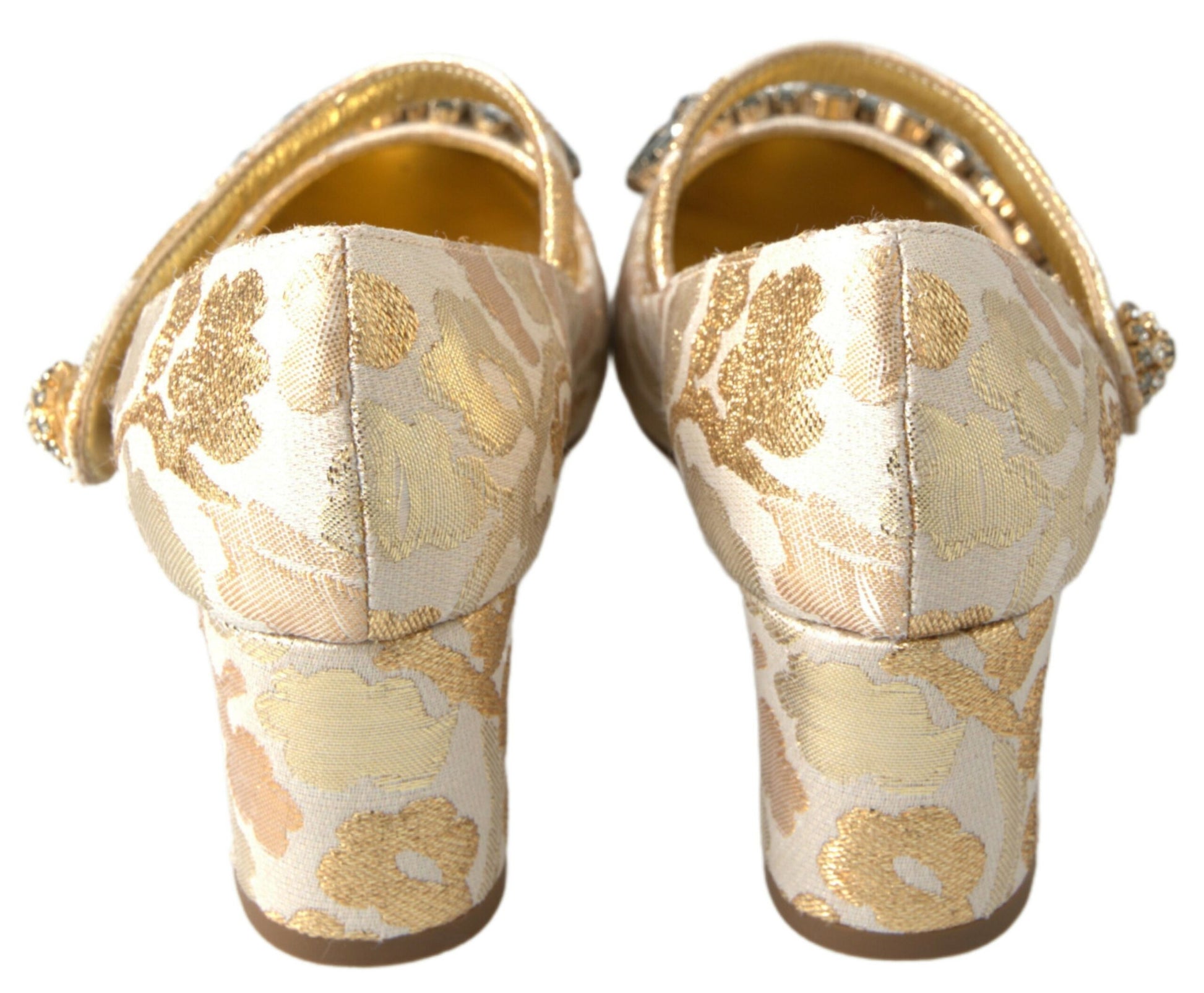 Step into a world of sophistication with these stunning heels sandals from the renowned Dolce & Gabbana. Adorned with crystal embellishments and a gleaming gold brocade design, these block-heeled beauties exude luxury and undeniable Italian craftsmanship. Not only a feast for the eyes, they also promise quality and comfort for any upscale occasion.