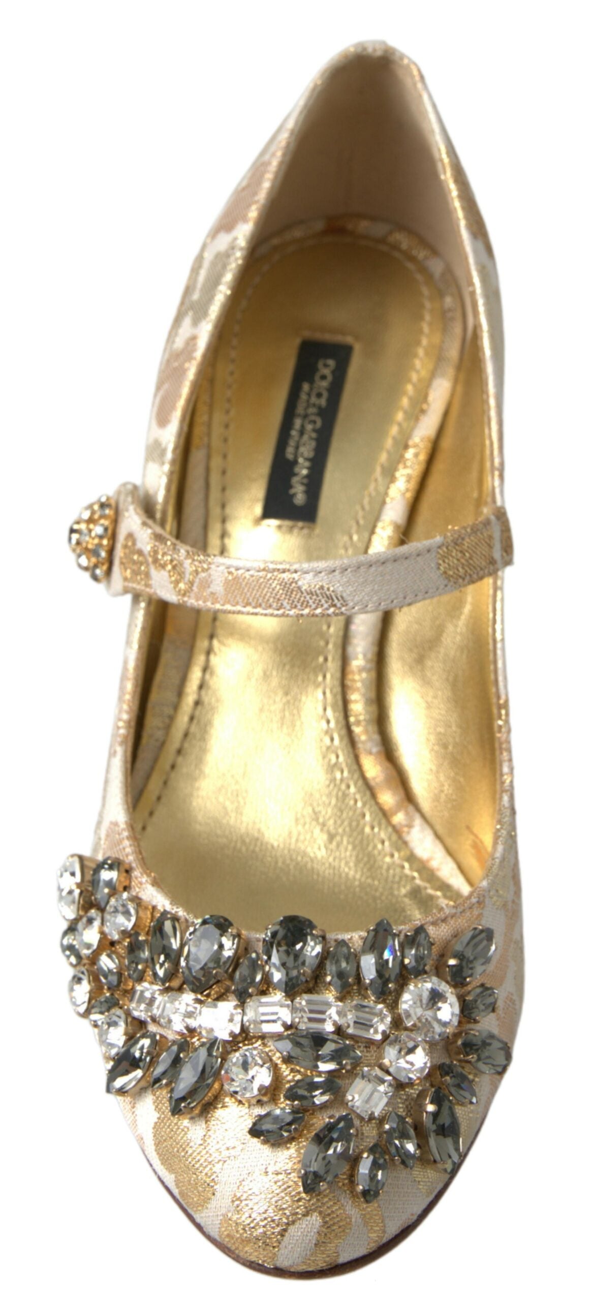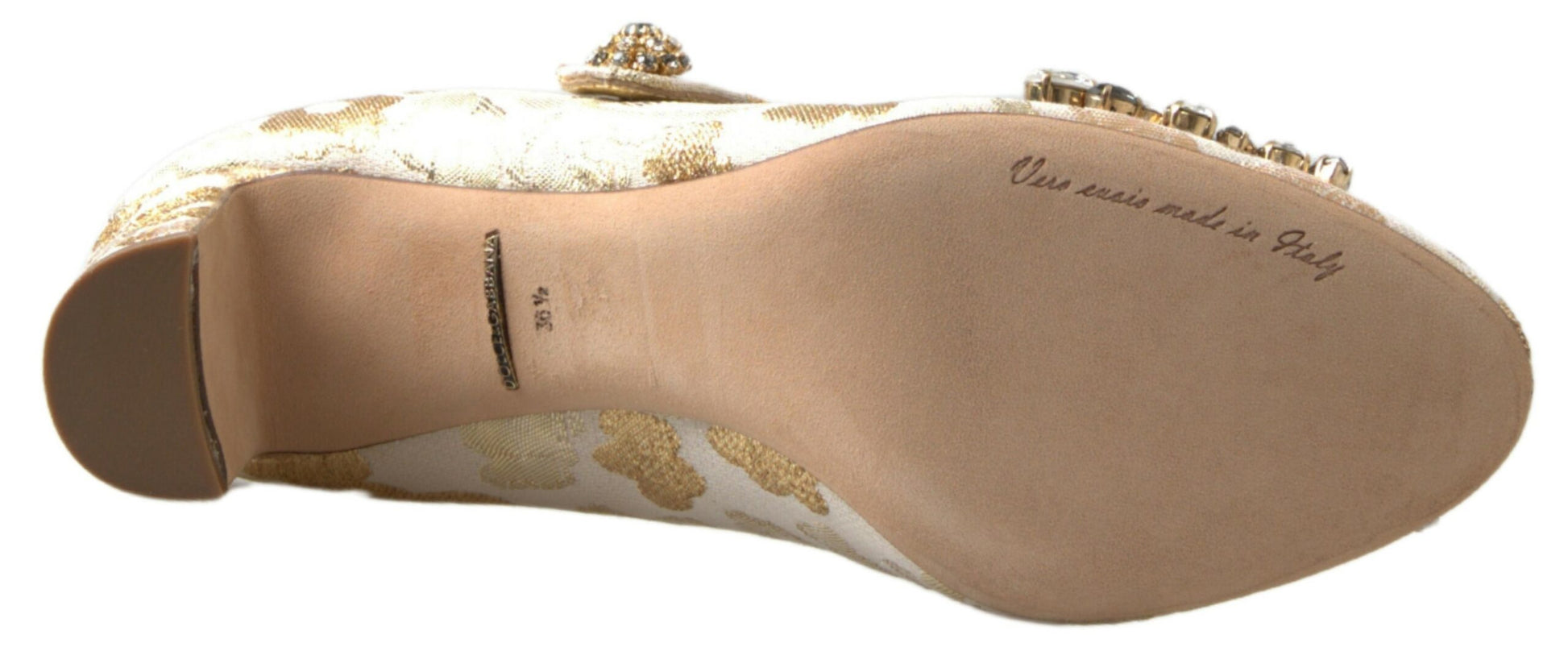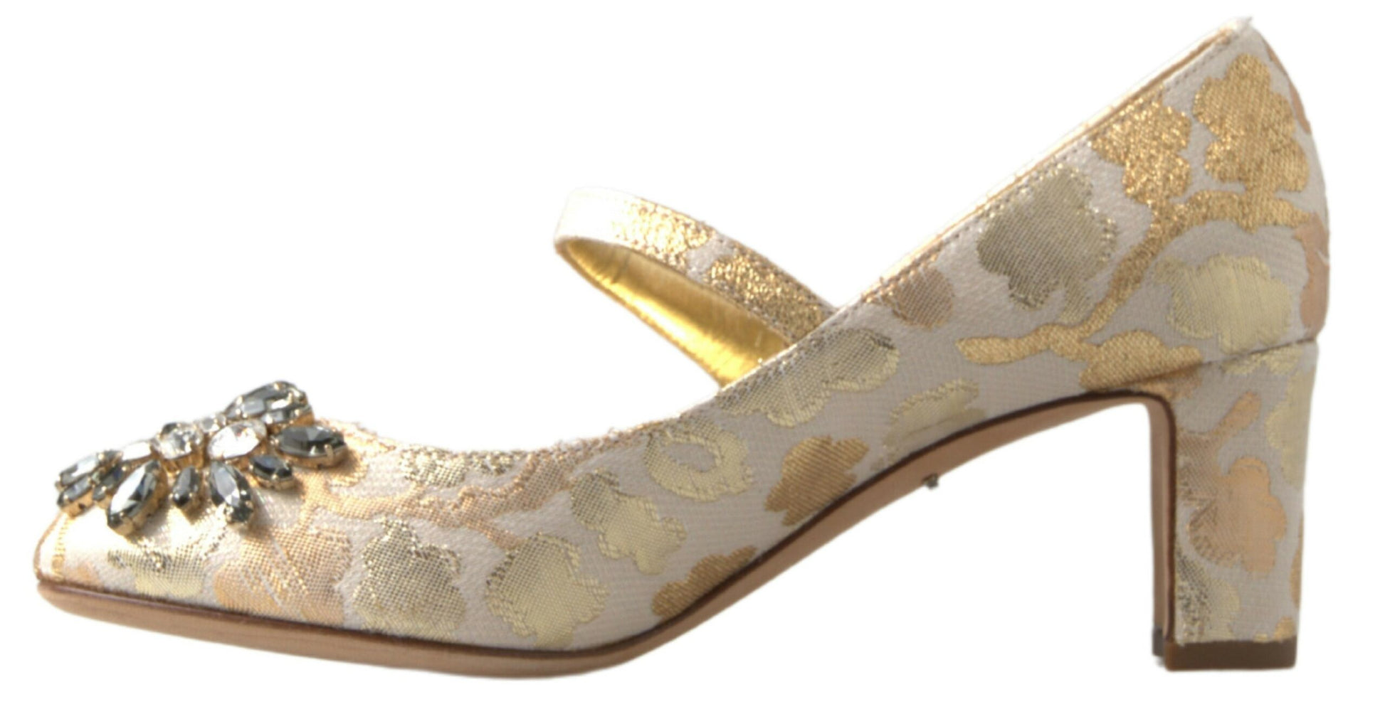 Step into a world of sophistication with these stunning heels sandals from the renowned Dolce & Gabbana. Adorned with crystal embellishments and a gleaming gold brocade design, these block-heeled beauties exude luxury and undeniable Italian craftsmanship. Not only a feast for the eyes, they also promise quality and comfort for any upscale occasion.