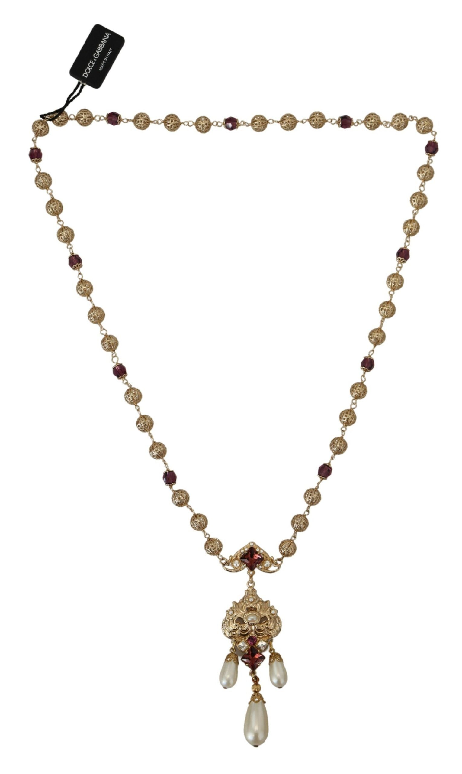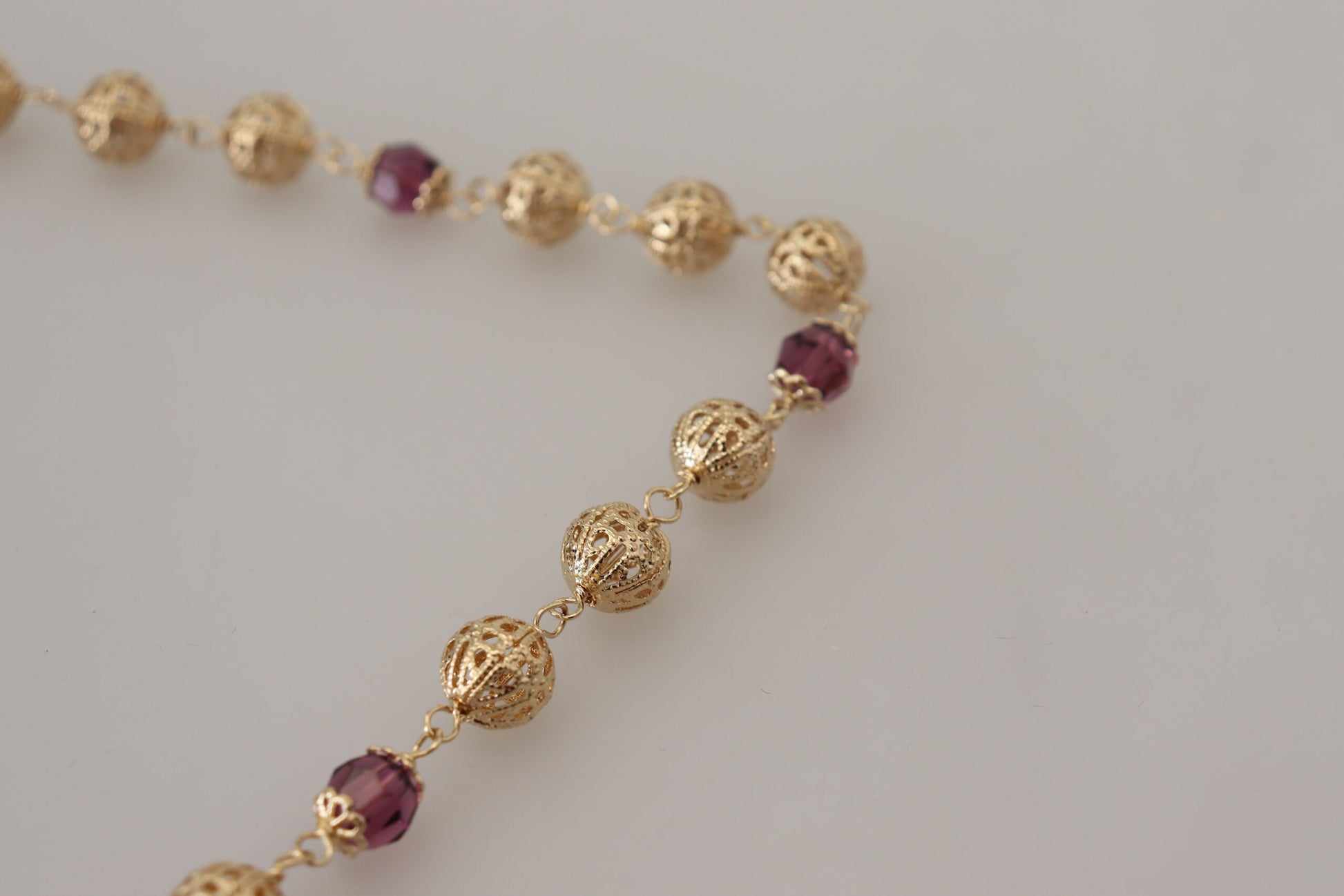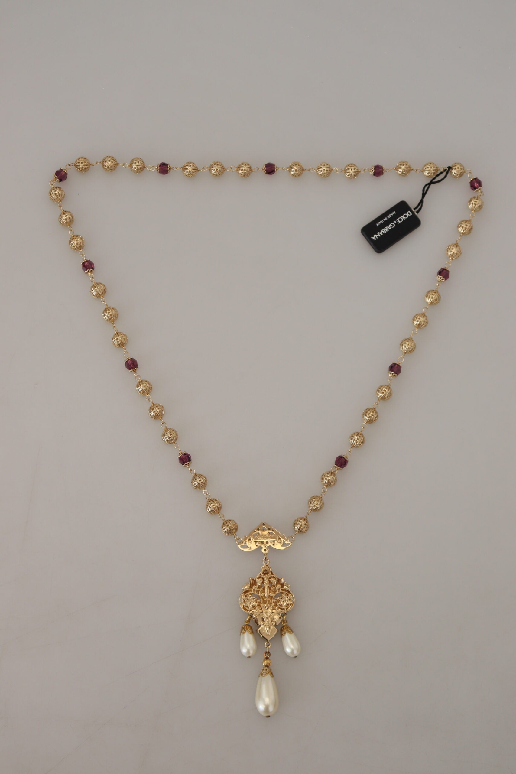 Immerse yourself in the luxury and sophistication of this Dolce & Gabbana statement necklace. Showcasing a stunning gold-tone brass chain adorned with a captivating Sicily pendant, this piece is a treasure of craftsmanship and style. Its intricate design features a harmonious blend of brass, glass, and pearl, with a rich palette of gold, purple, and white colors that will add a touch of opulence to any outfit. Finely crafted in Italy, each detail of this necklace resonates with the brand’s iconic logo details, ensuring authenticity and prestige. With a generous length of 75cm, it’s designed to make a bold statement for those who dare to stand out.