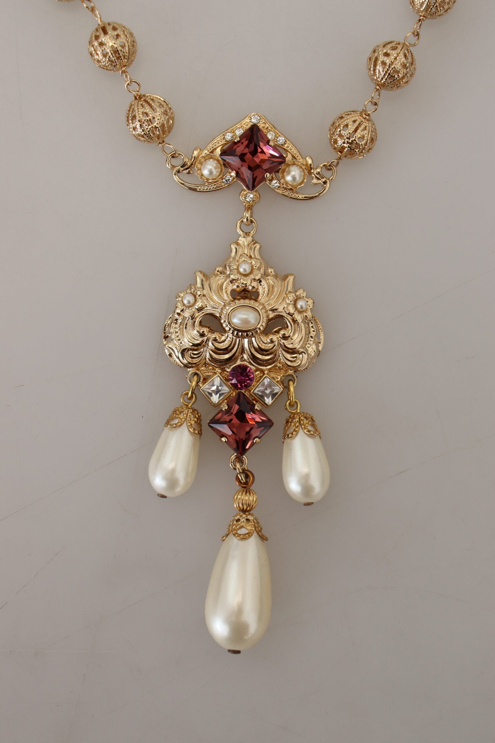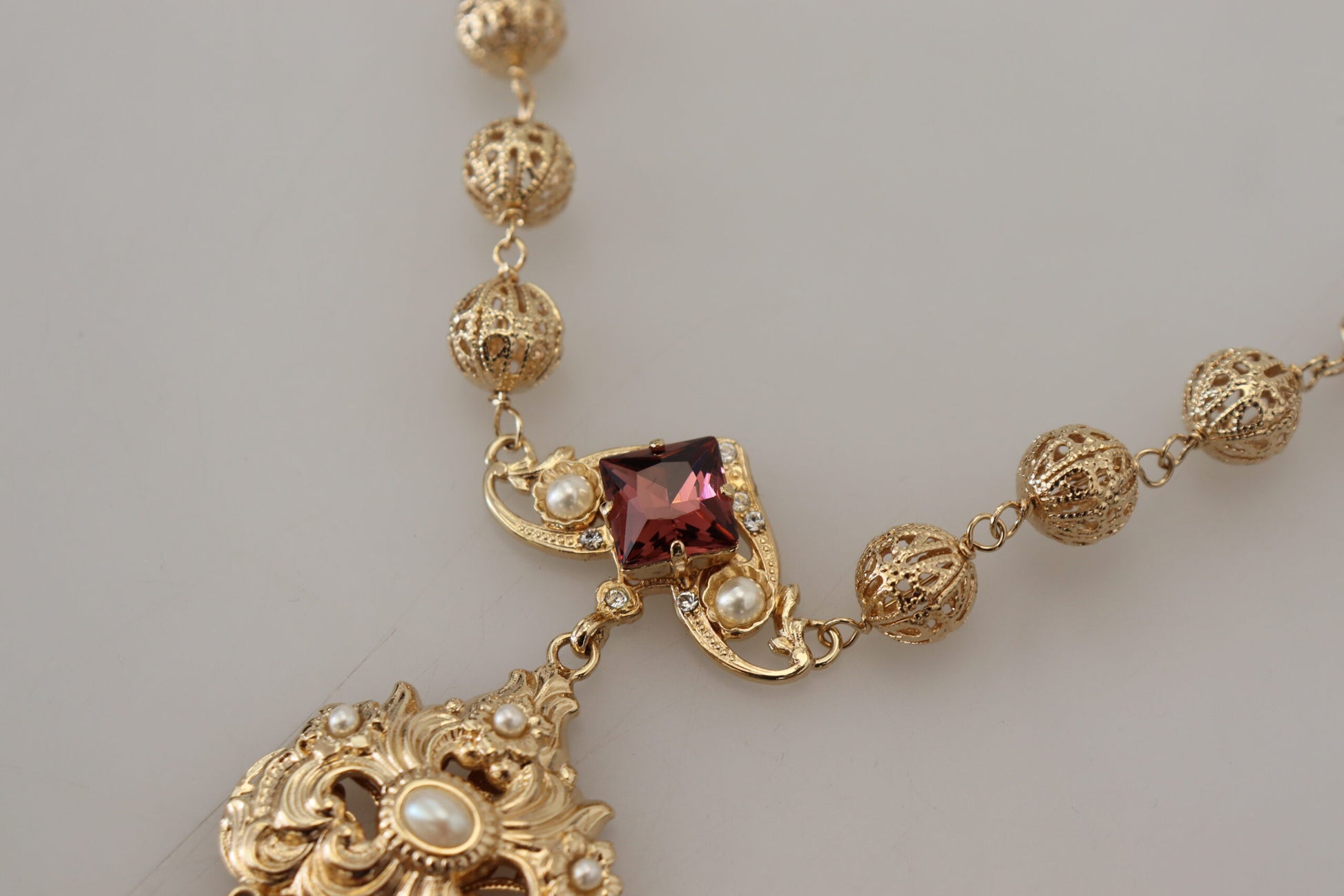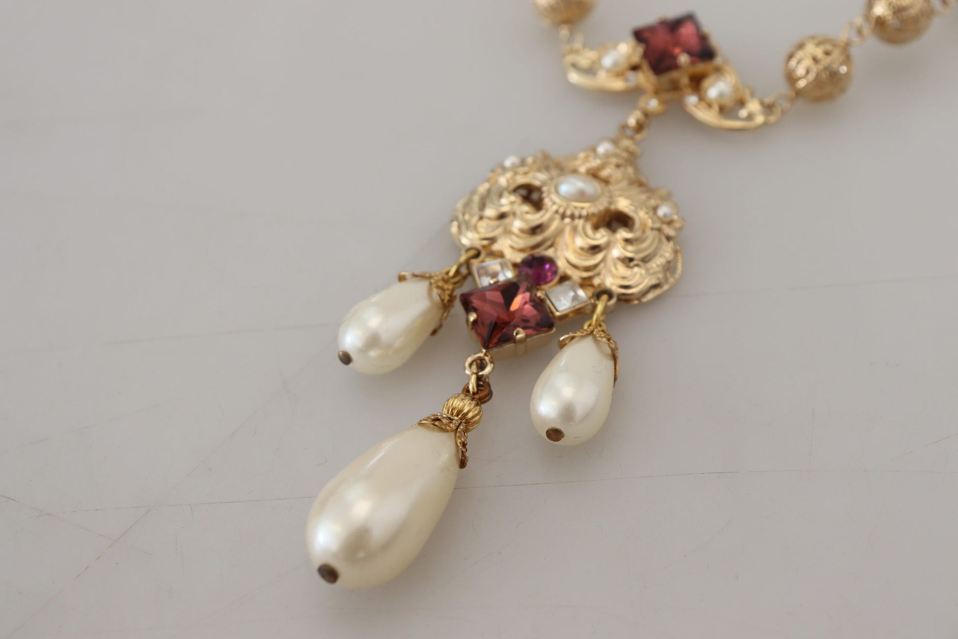 Immerse yourself in the luxury and sophistication of this Dolce & Gabbana statement necklace. Showcasing a stunning gold-tone brass chain adorned with a captivating Sicily pendant, this piece is a treasure of craftsmanship and style. Its intricate design features a harmonious blend of brass, glass, and pearl, with a rich palette of gold, purple, and white colors that will add a touch of opulence to any outfit. Finely crafted in Italy, each detail of this necklace resonates with the brand’s iconic logo details, ensuring authenticity and prestige. With a generous length of 75cm, it’s designed to make a bold statement for those who dare to stand out.