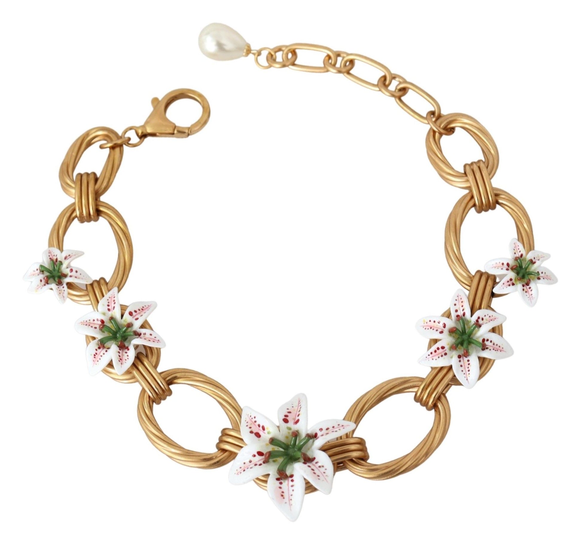 Accessorize your elegance with the Dolce & Gabbana Sicily Necklace, a gorgeous statement piece that’s sure to turn heads. Its intricate Lilium floral motif and luxurious blend of brass, resin, and glass make this necklace not only a fashion statement but a work of art dangling at your neckline. The shimmering gold-tone finished with a classic lobster clasp ensures secure wear while exuding sophistication. This Italian-crafted jewel is the perfect addition to grace any ensemble.