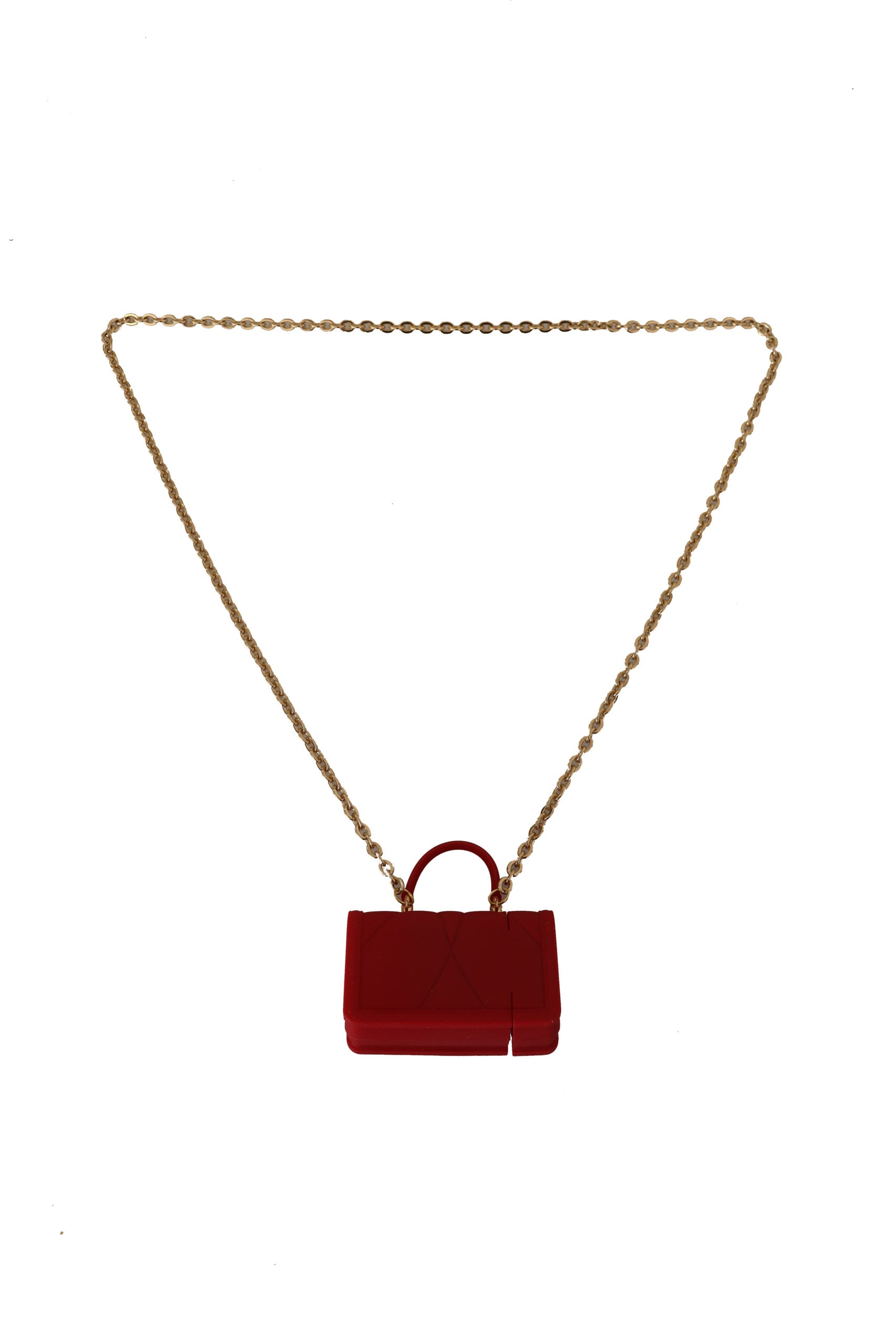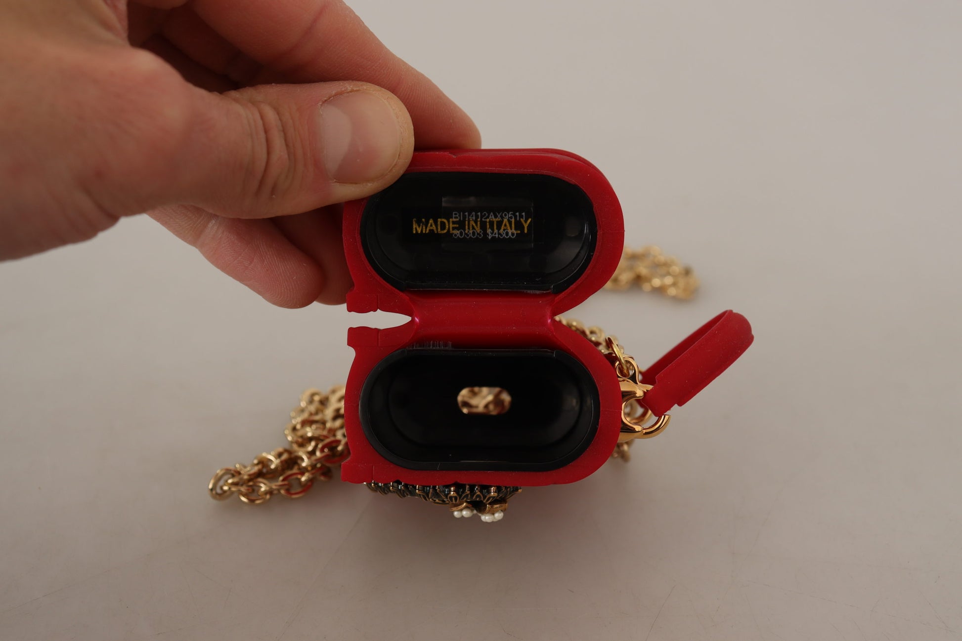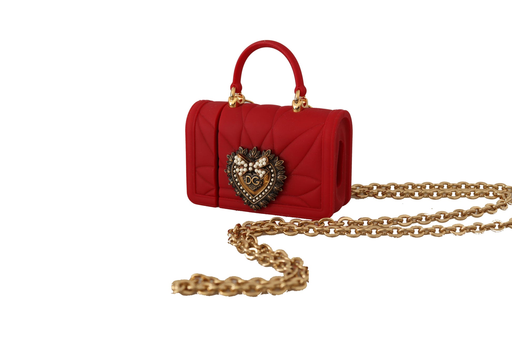 Indulge in the luxury of Dolce & Gabbana with this exquisite gold tone brass chain featuring a striking red devotion micro bag pendant, which doubles as a chic Airpod case. A fusion of fashion and function, this Made in Italy piece adds a radiant touch to your ensemble while keeping your Airpods secure in style. The bright gold hue and detailed logo convey an air of sophistication that is unmistakably Dolce & Gabbana.