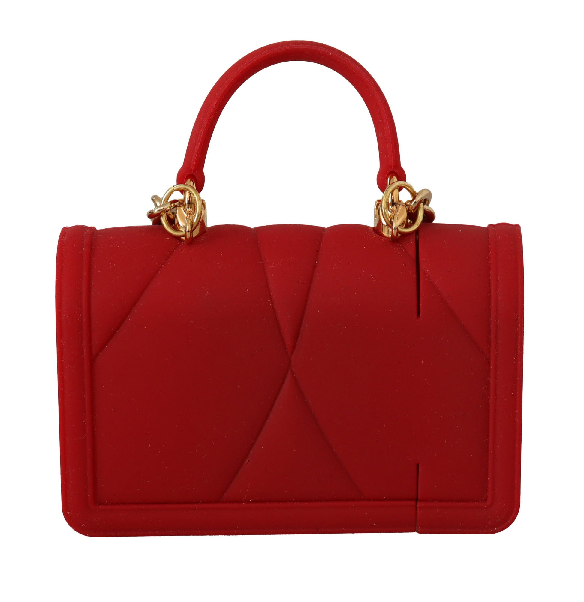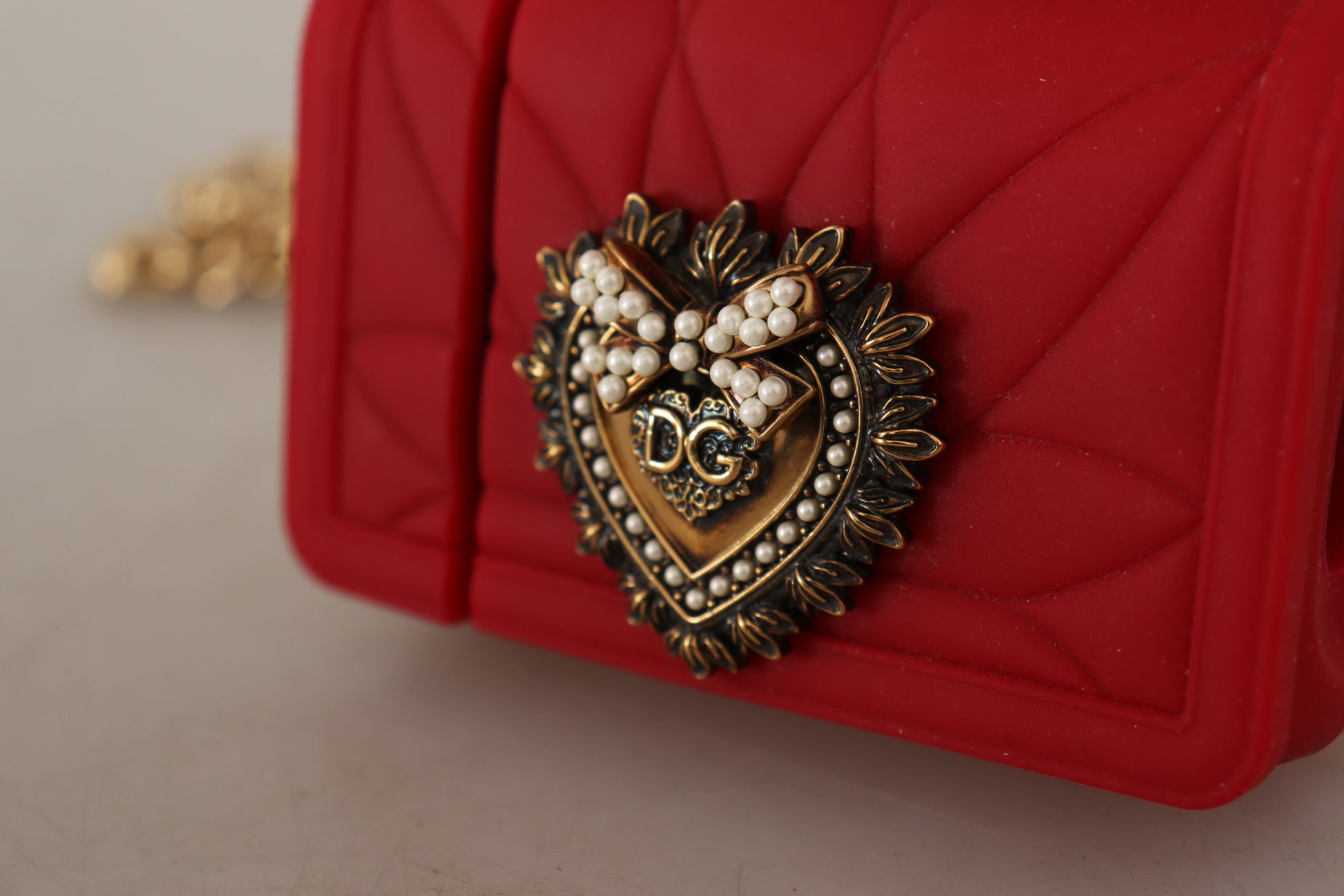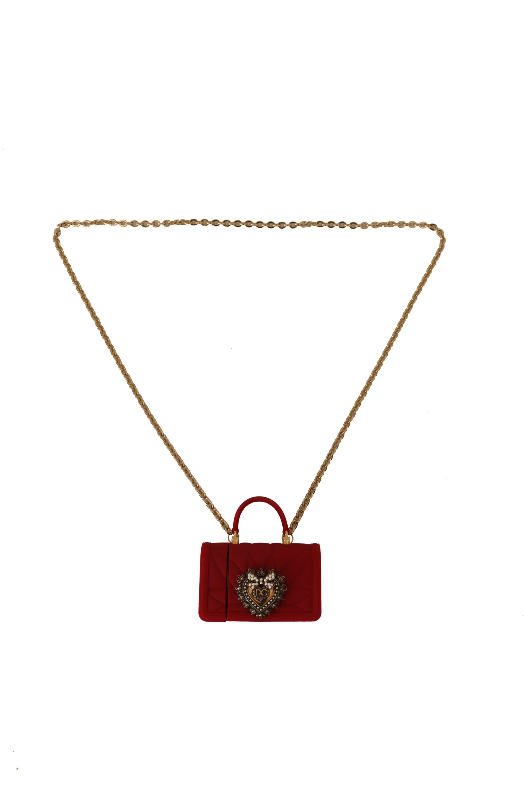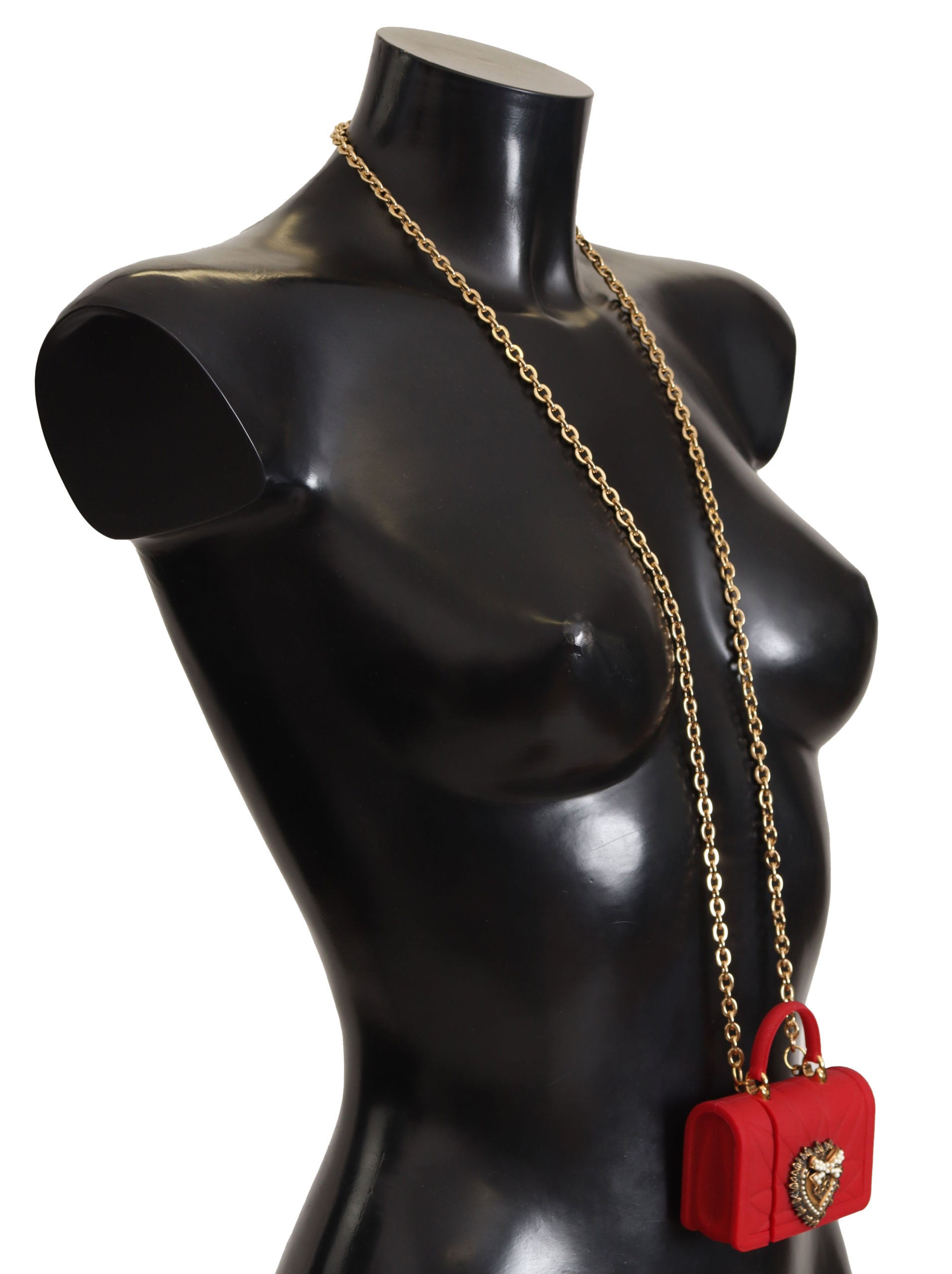 Indulge in the luxury of Dolce & Gabbana with this exquisite gold tone brass chain featuring a striking red devotion micro bag pendant, which doubles as a chic Airpod case. A fusion of fashion and function, this Made in Italy piece adds a radiant touch to your ensemble while keeping your Airpods secure in style. The bright gold hue and detailed logo convey an air of sophistication that is unmistakably Dolce & Gabbana.