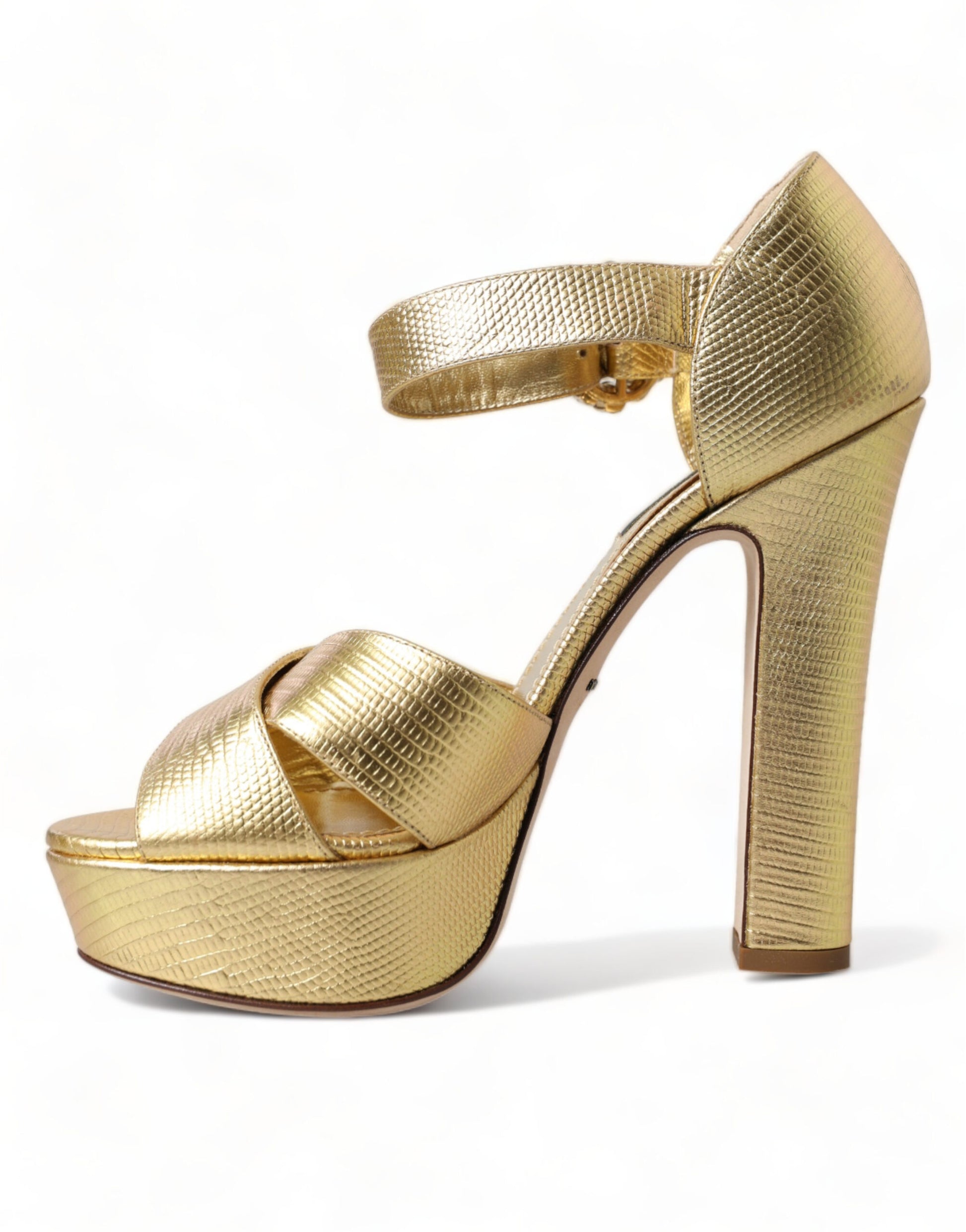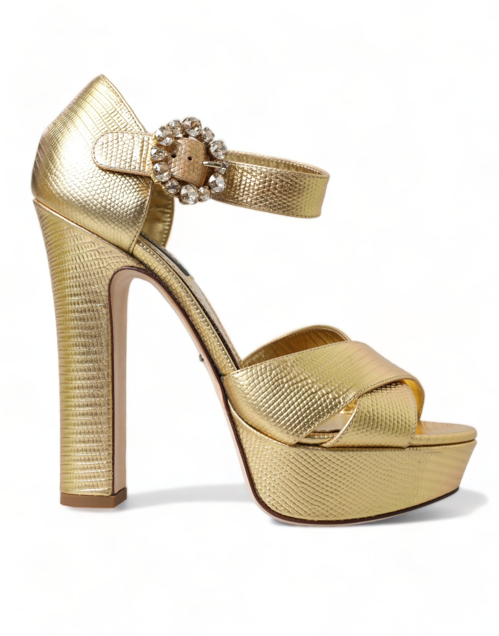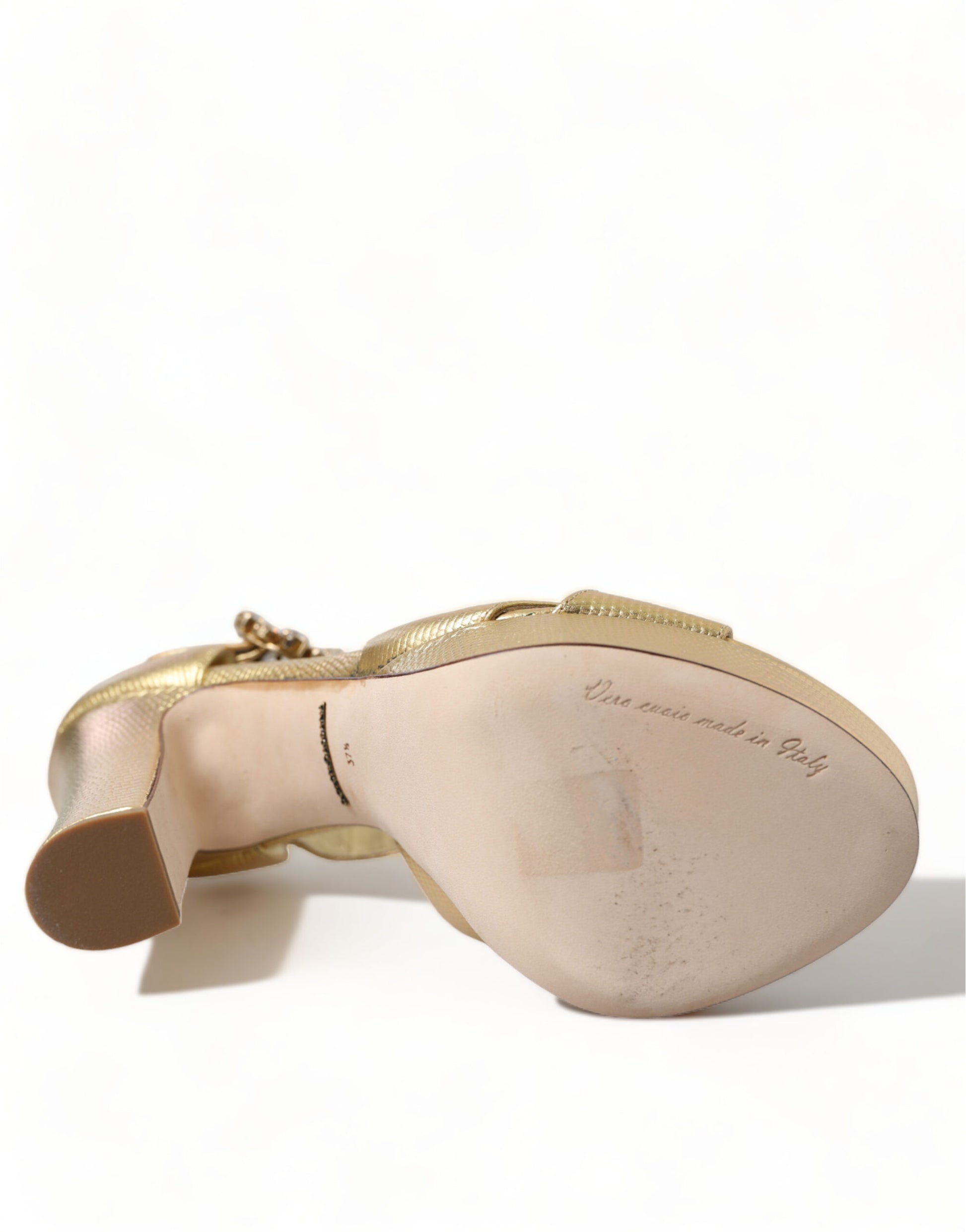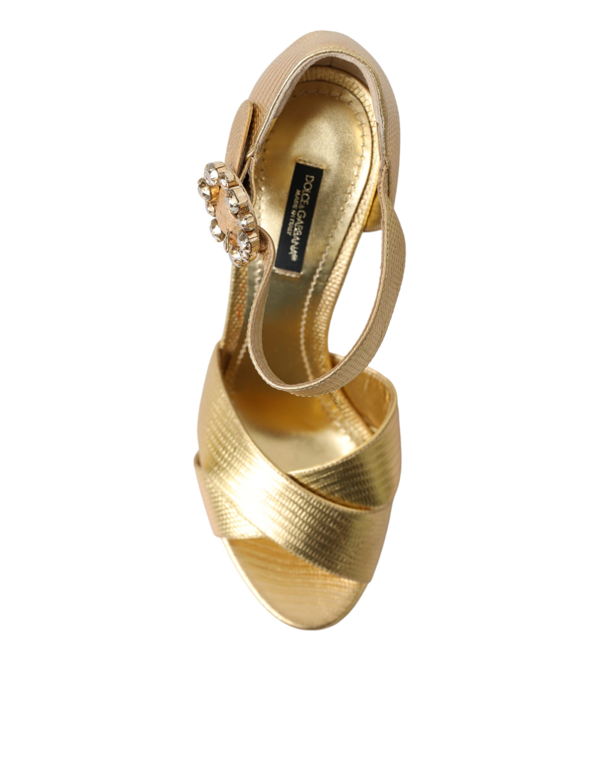 Step into luxury with these eye-catching Gold Leather Sandals, epitomizing the exquisite craftsmanship of Dolce & Gabbana. Each pair is a testament to elegance with stunning crystal embellishments and a refined ankle strap design, perfect for adding a glamorous finish to any ensemble. Crafted in Italy, these sandals boast a leather sole for a touch of classic sophistication.