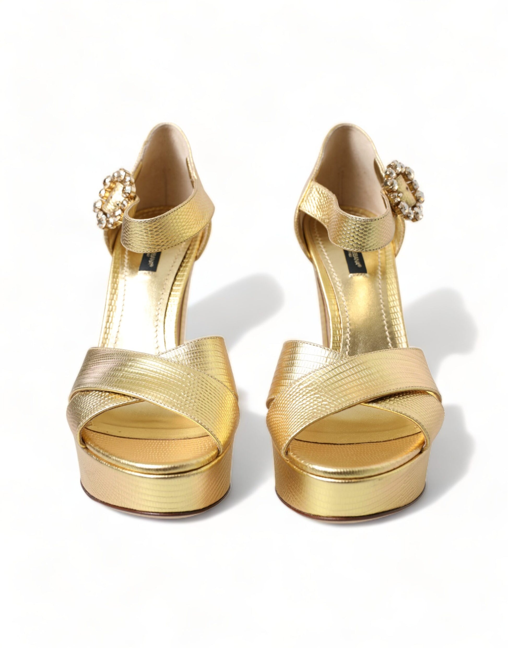 Step into luxury with these exquisite, brand new gold platform sandals from Dolce & Gabbana. Adorned with sparkling crystal embellishments, these leather ankle strap sandals are designed to make a lasting impression at any high-end event or night out. Made in Italy with meticulous attention to detail, they are not just shoes but a statement of elegance.