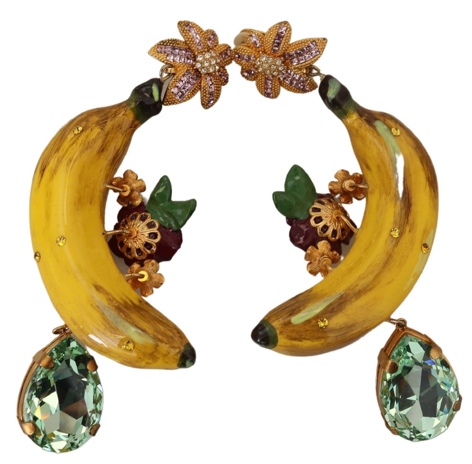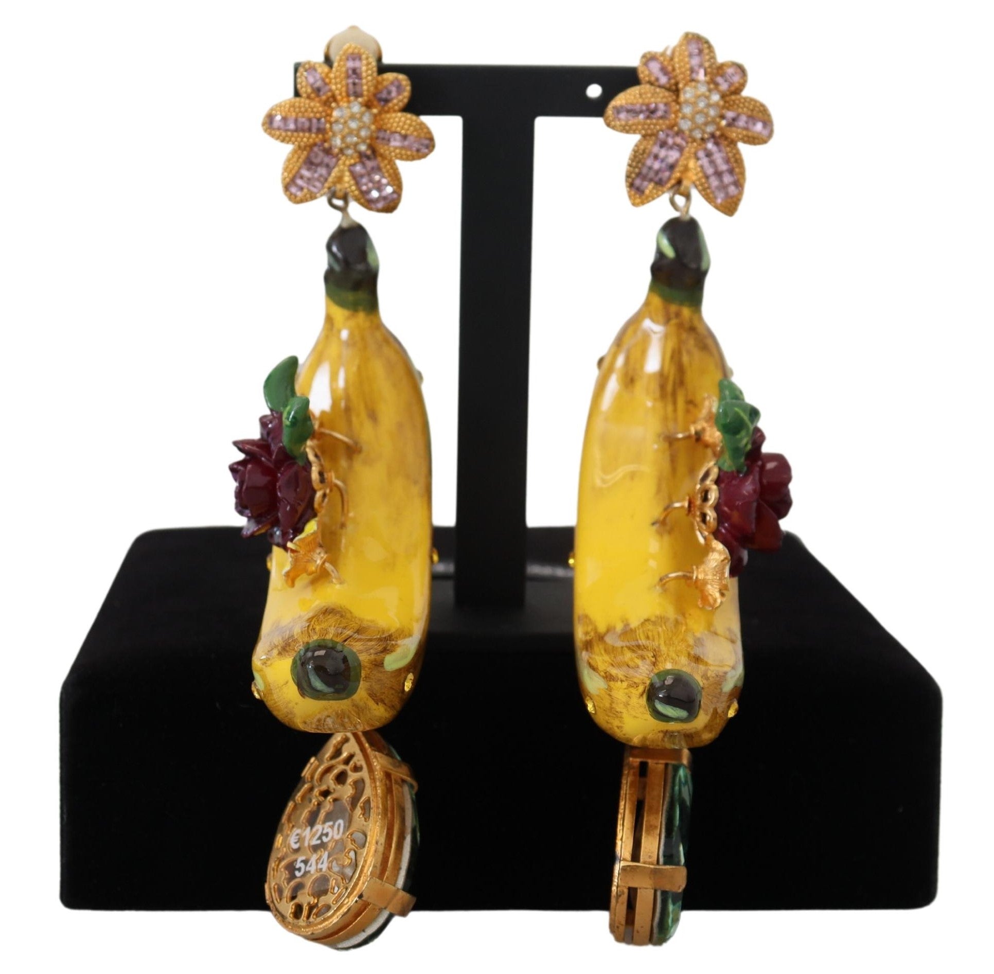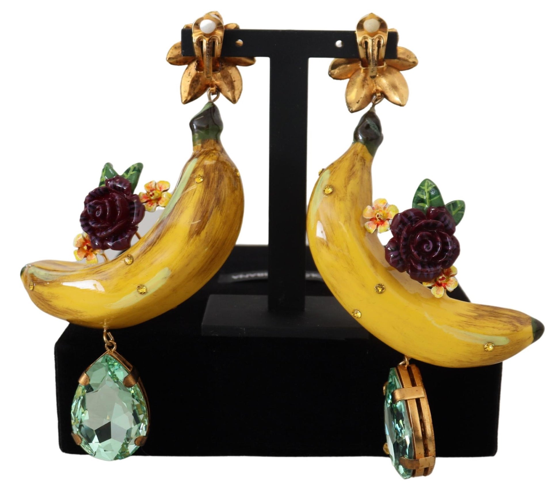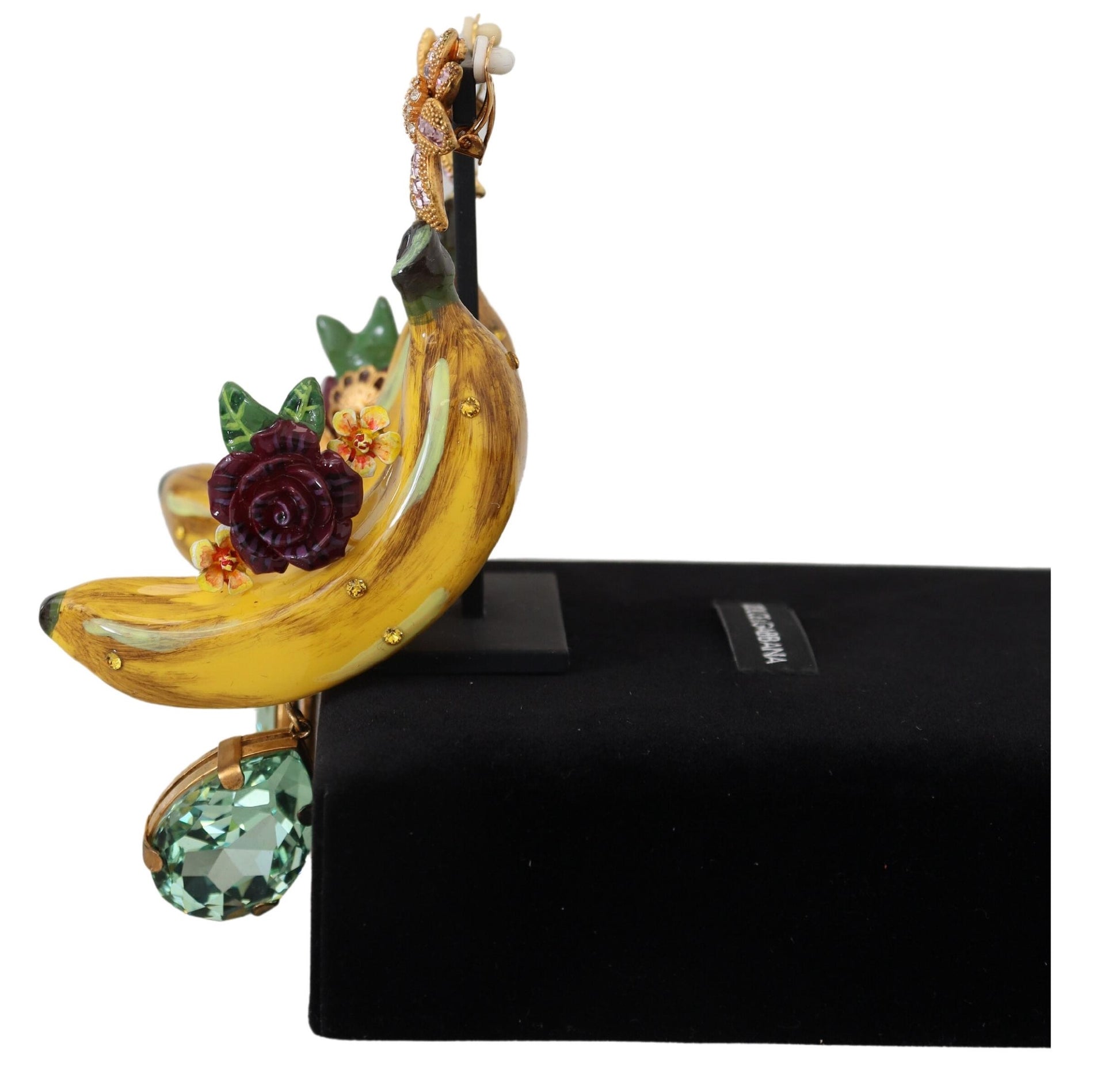 Infuse your ensemble with a touch of Mediterranean opulence with these gorgeous, brand new, 100% Authentic clip-on earrings from Dolce & Gabbana. Evoking the vibrant essence of Sicily, these earrings boast dazzling multicolor crystals, elegantly complemented by gold-toned brass, and glass. Designed for the woman who loves to make a bold statement, these dangling Sicilian Banana earrings are not only arresting in aesthetics but also steeped in Italian craftsmanship.