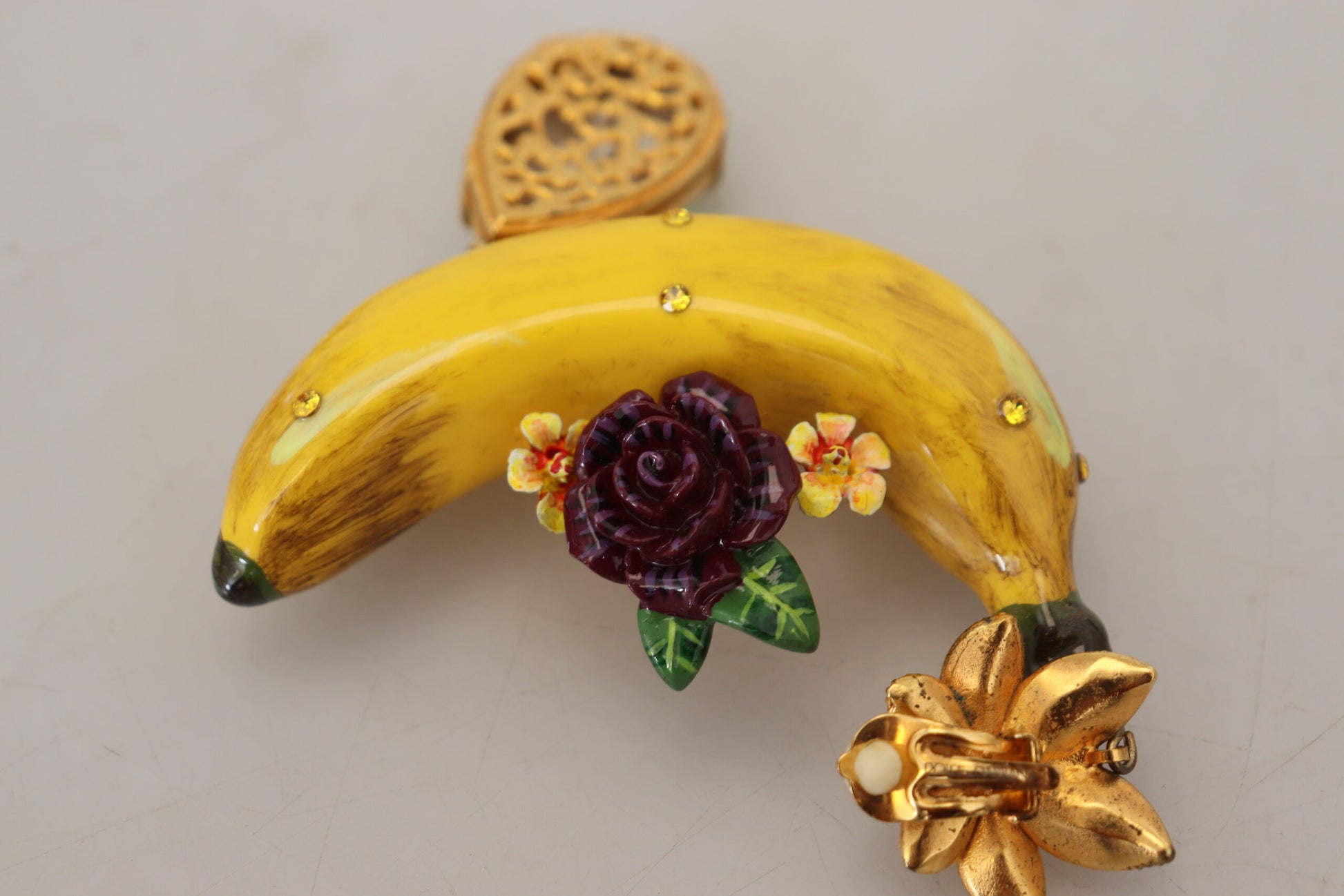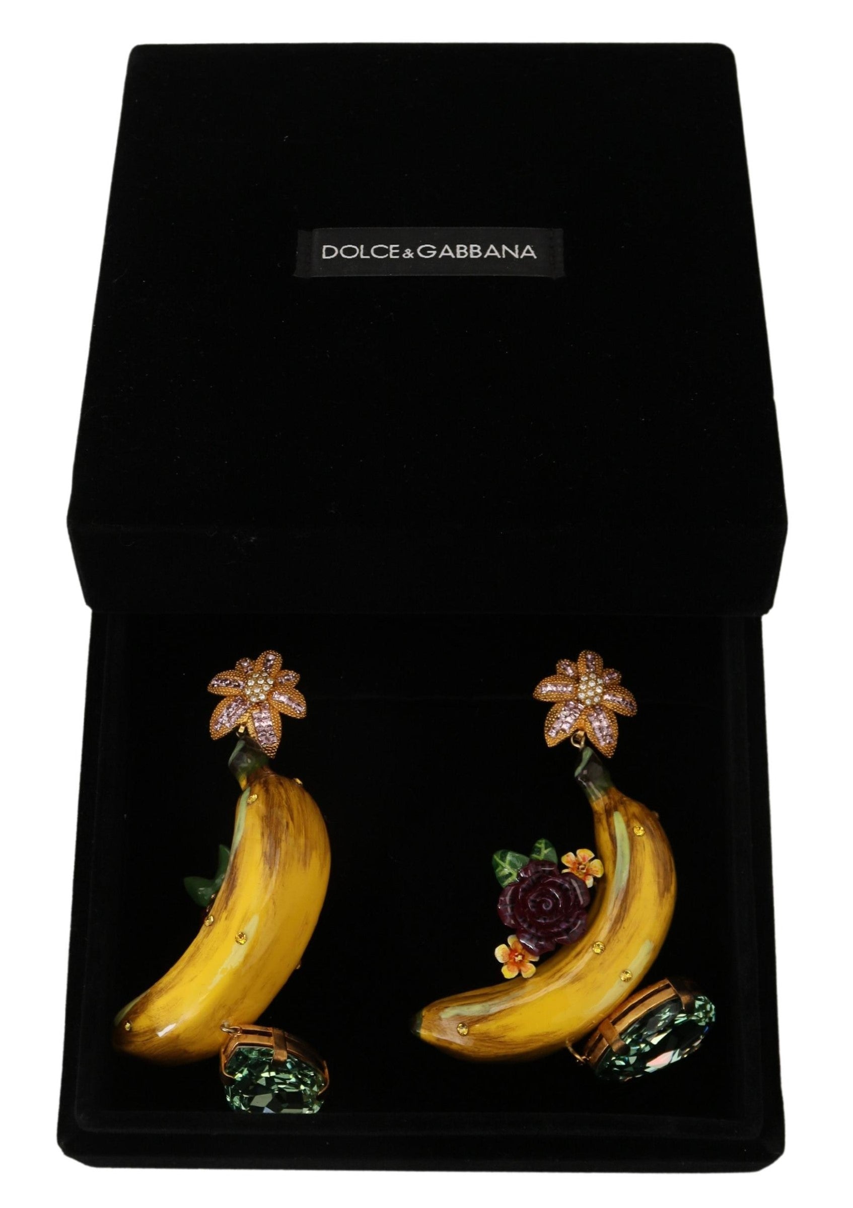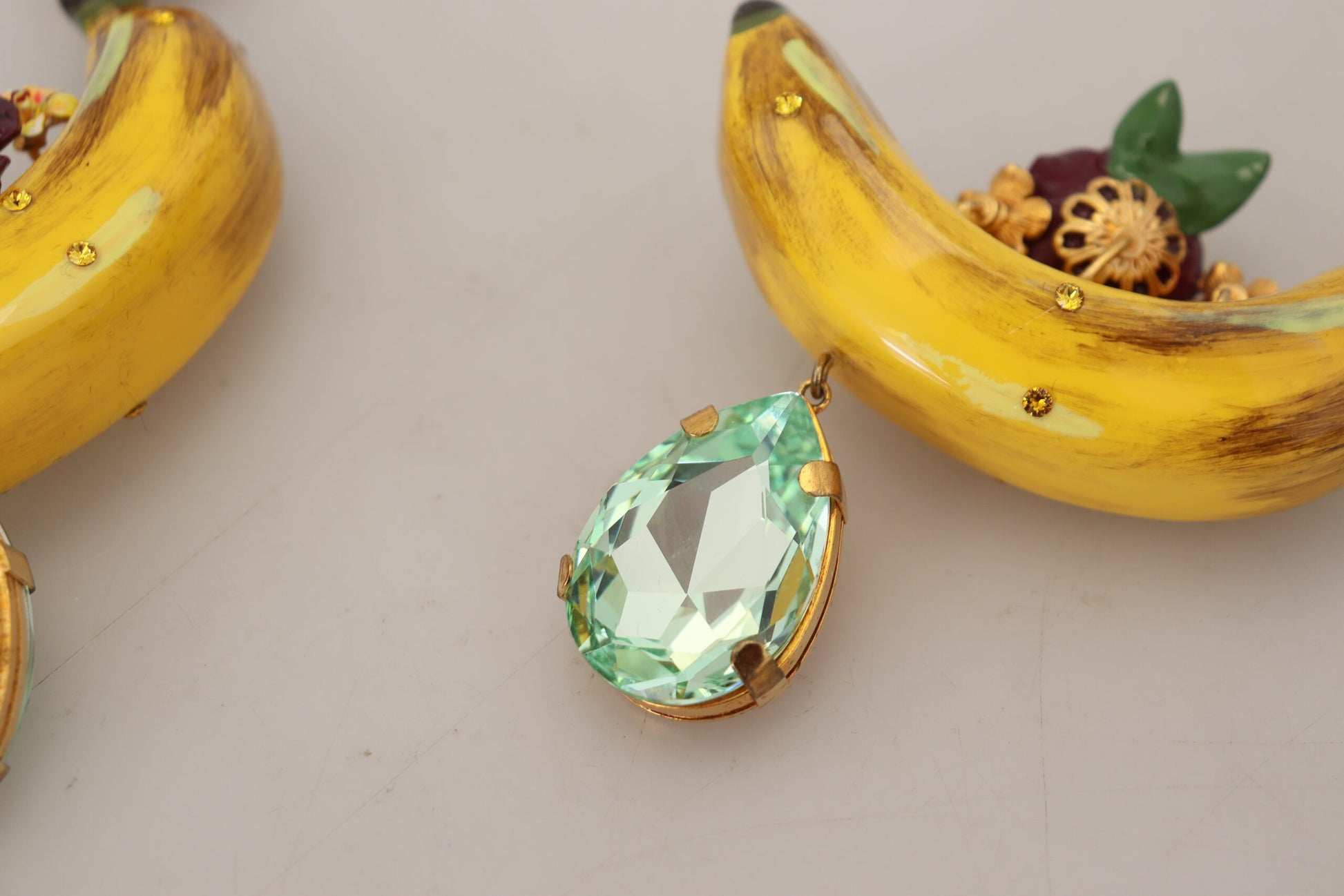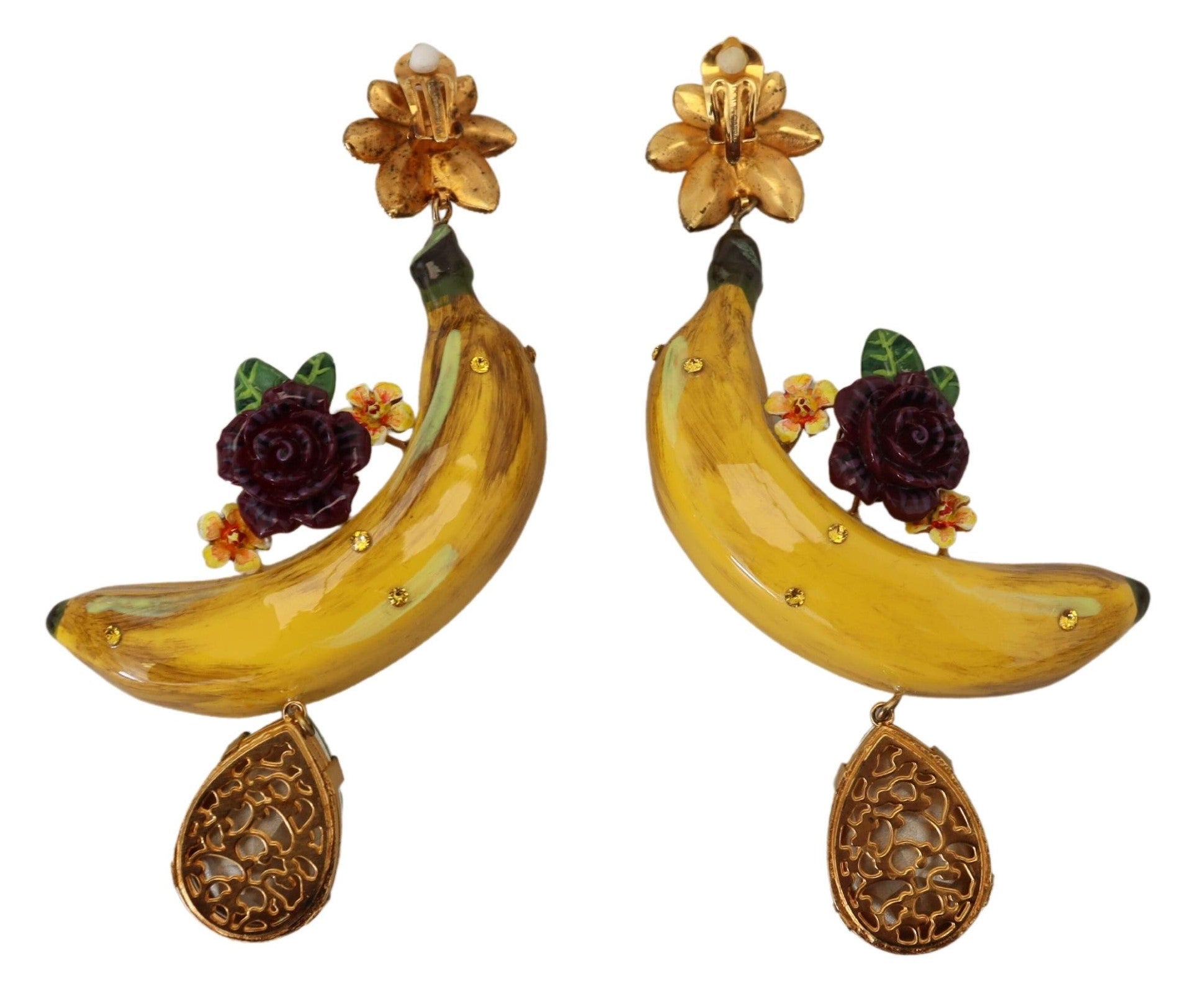 Infuse your ensemble with a touch of Mediterranean opulence with these gorgeous, brand new, 100% Authentic clip-on earrings from Dolce & Gabbana. Evoking the vibrant essence of Sicily, these earrings boast dazzling multicolor crystals, elegantly complemented by gold-toned brass, and glass. Designed for the woman who loves to make a bold statement, these dangling Sicilian Banana earrings are not only arresting in aesthetics but also steeped in Italian craftsmanship.