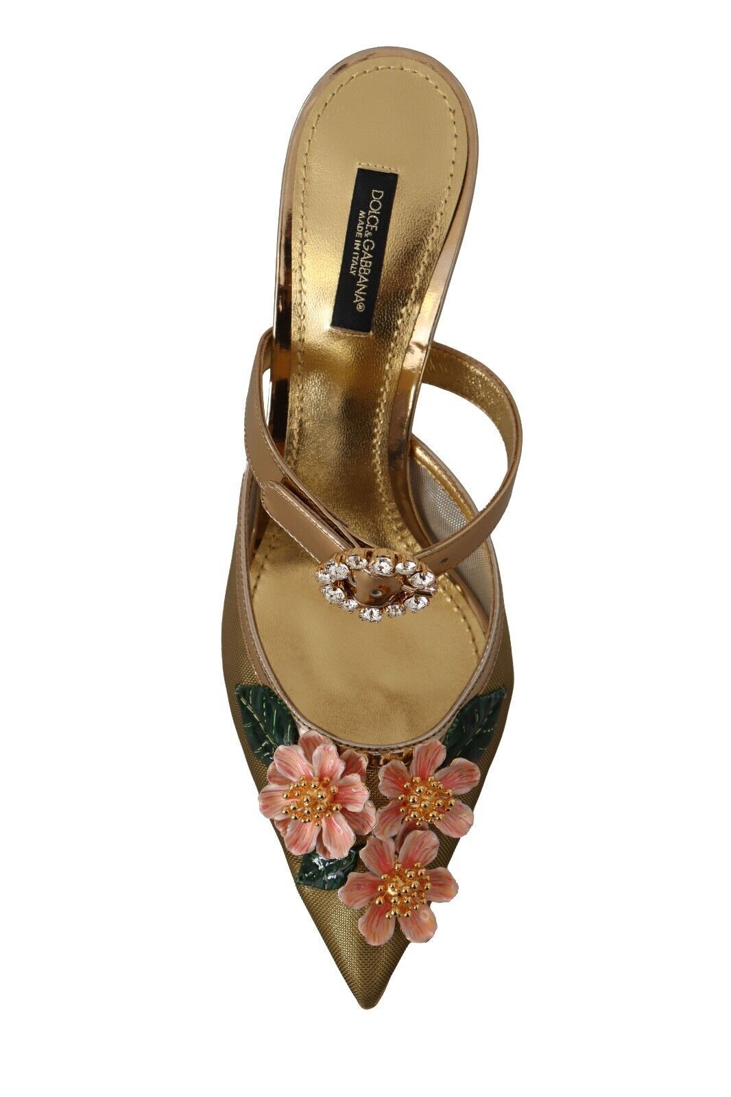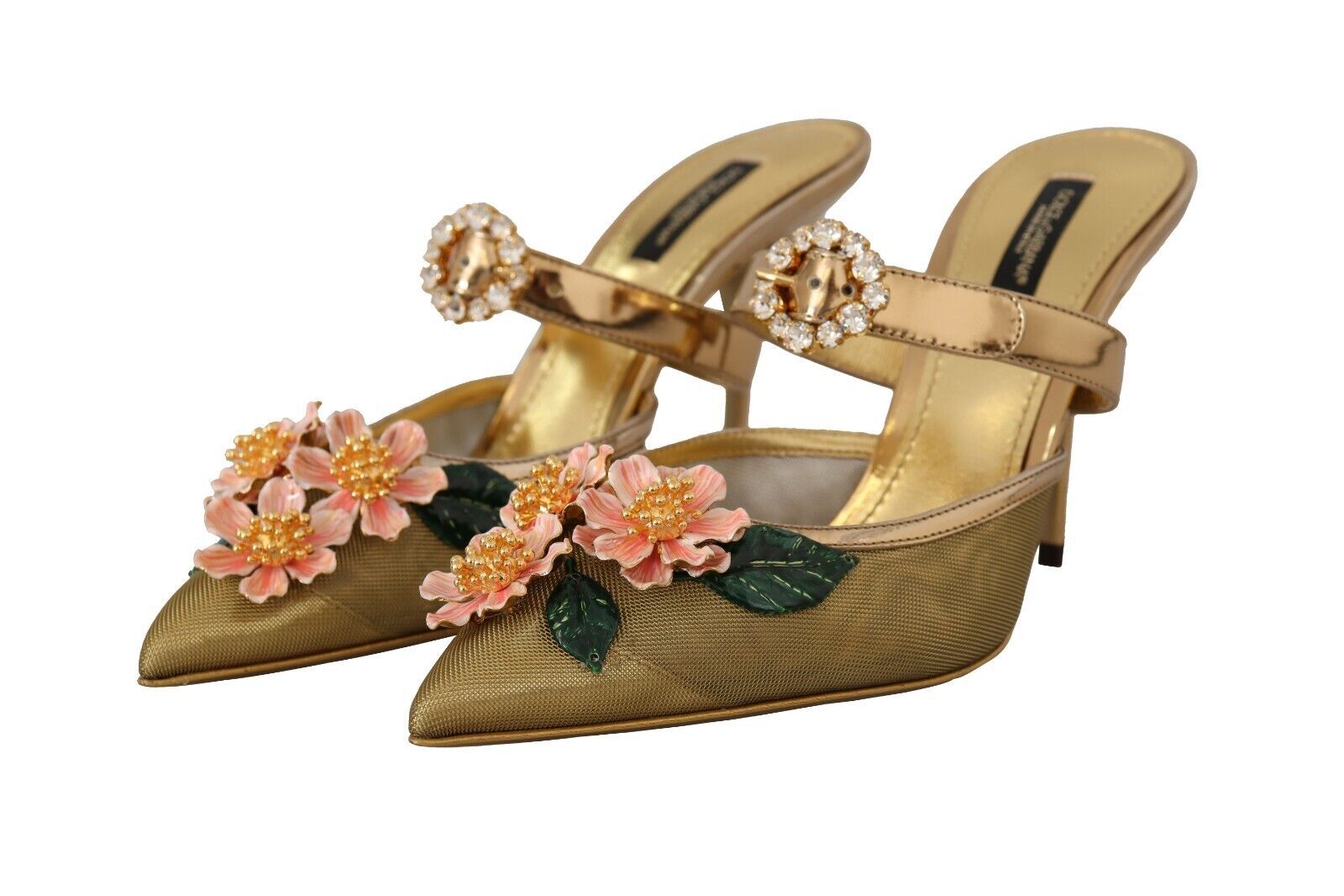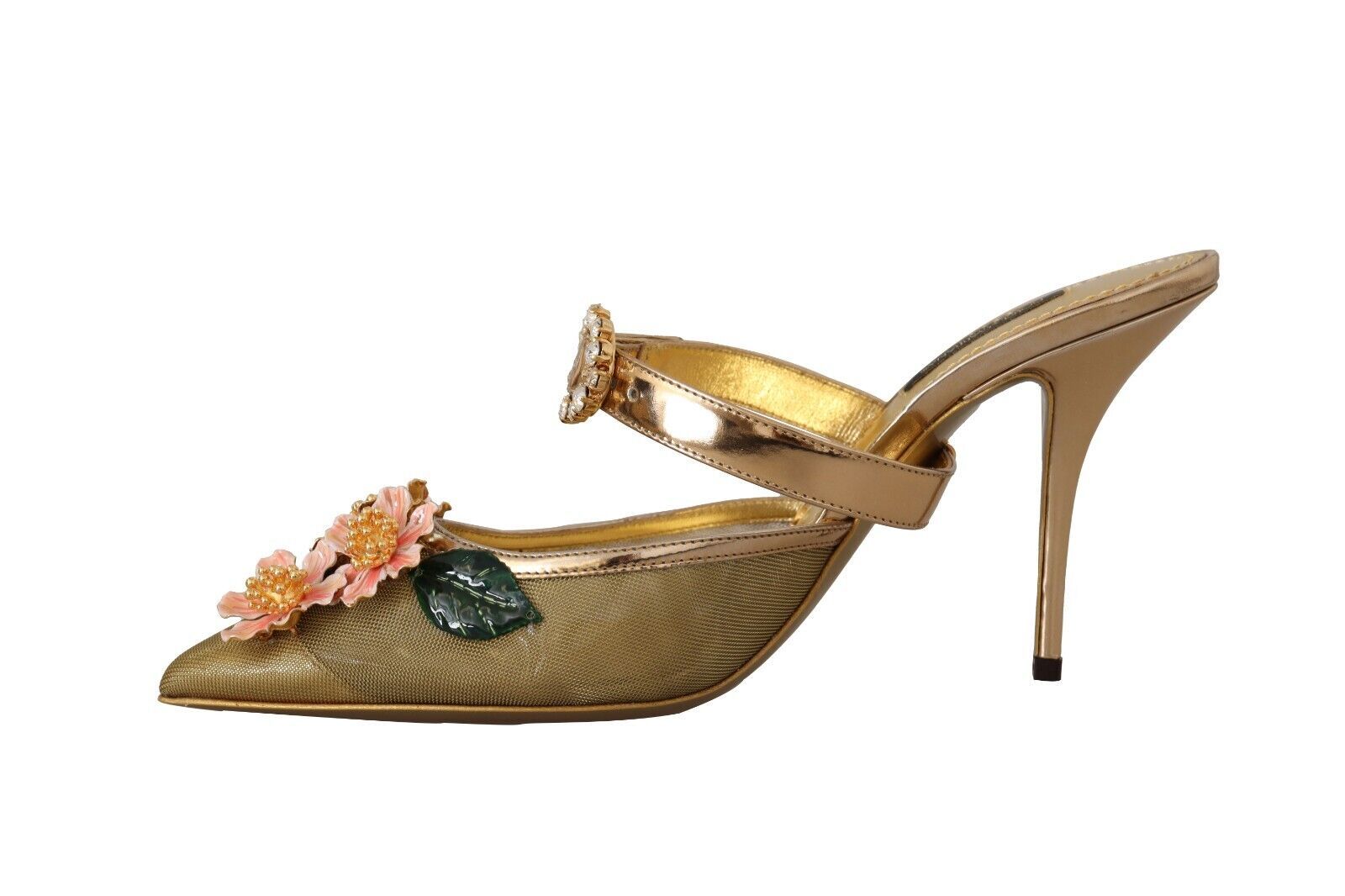 Step into luxury with these exquisitely crafted Floral Embellished Gold Leather Heels from Dolce & Gabbana. Made with the finest materials, these sandals are adorned with vibrant floral appliques and dazzling crystals, making them a standout accessory for any ensemble. Designed with a pointed toe and comfortable leather sole, these heels ensure both style and comfort. Perfect for upscale events or adding a touch of glamour to your everyday look, they reflect the highest quality and craftsmanship synonymous with Dolce & Gabbana, proudly made in Italy.