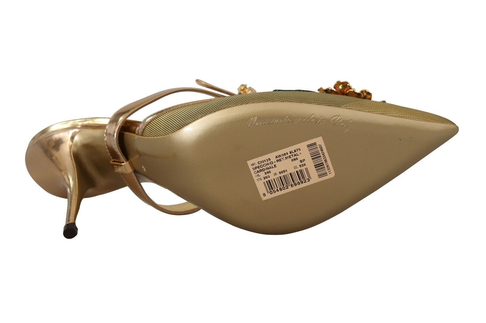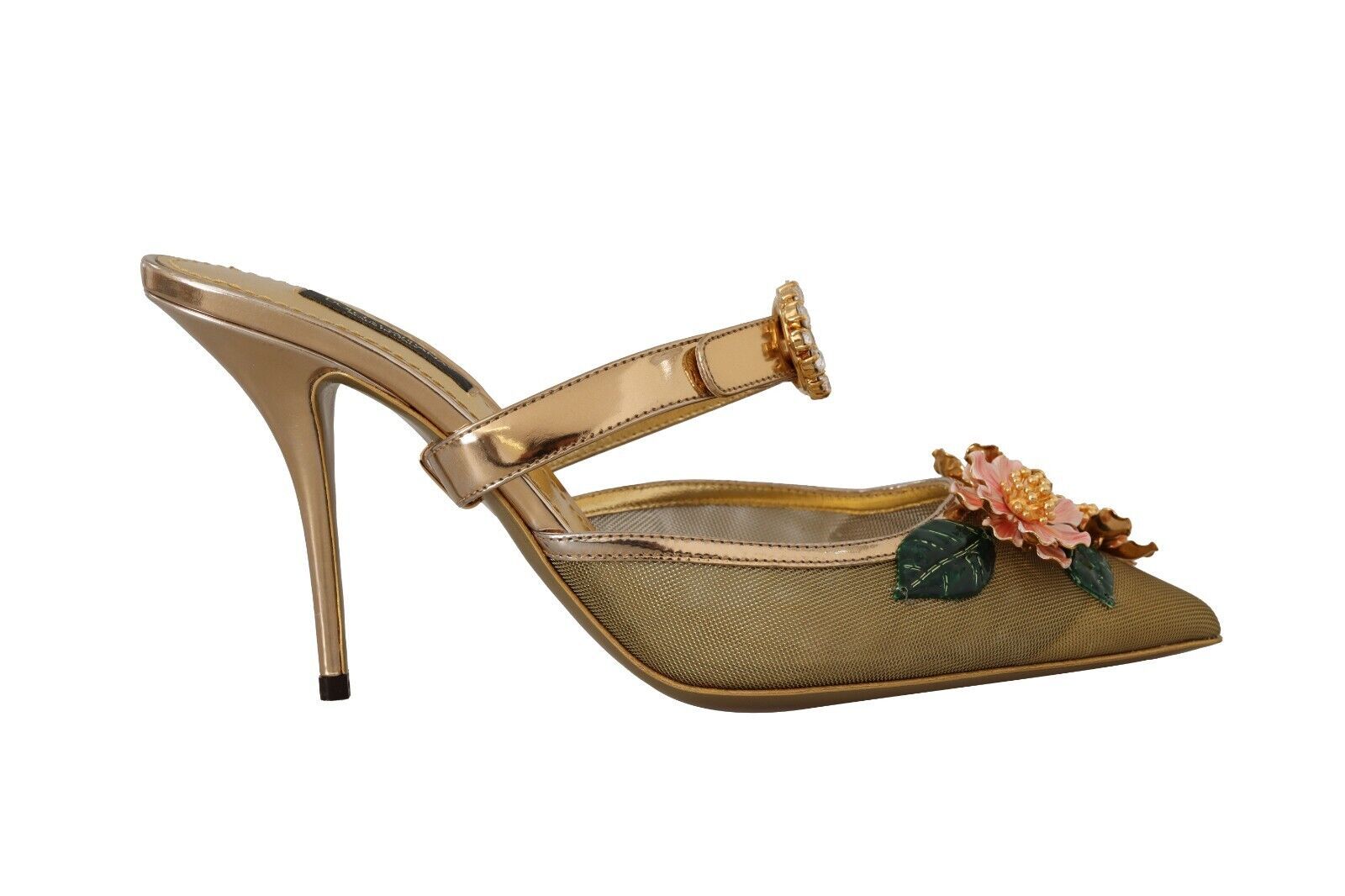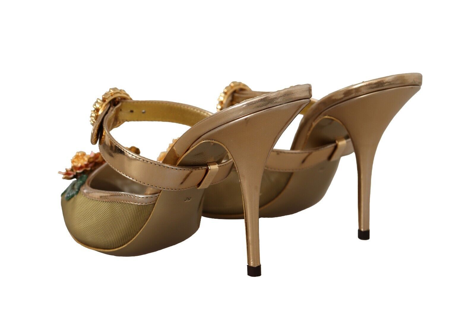 Step into luxury with these exquisitely crafted Floral Embellished Gold Leather Heels from Dolce & Gabbana. Made with the finest materials, these sandals are adorned with vibrant floral appliques and dazzling crystals, making them a standout accessory for any ensemble. Designed with a pointed toe and comfortable leather sole, these heels ensure both style and comfort. Perfect for upscale events or adding a touch of glamour to your everyday look, they reflect the highest quality and craftsmanship synonymous with Dolce & Gabbana, proudly made in Italy.