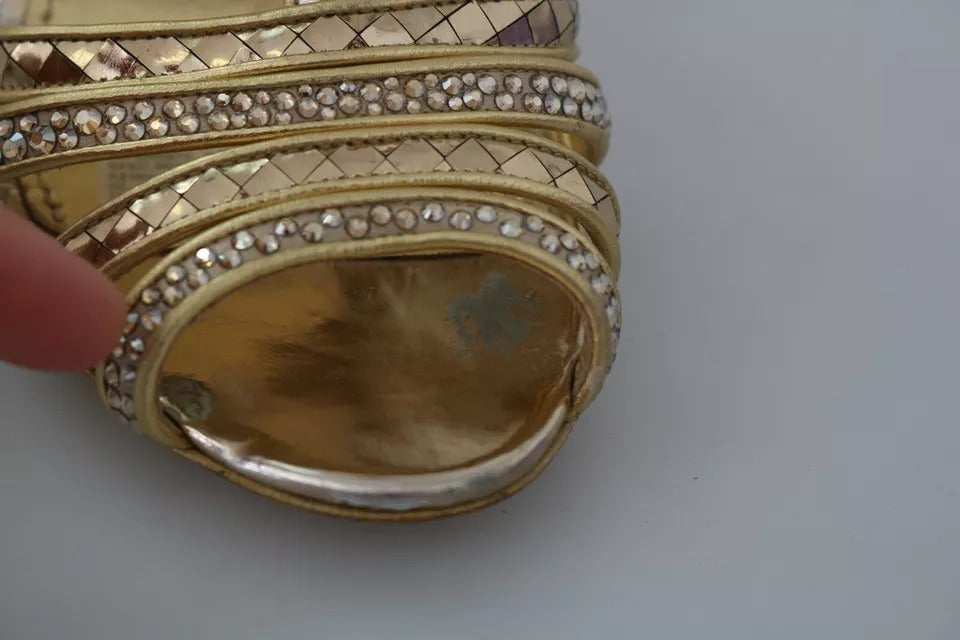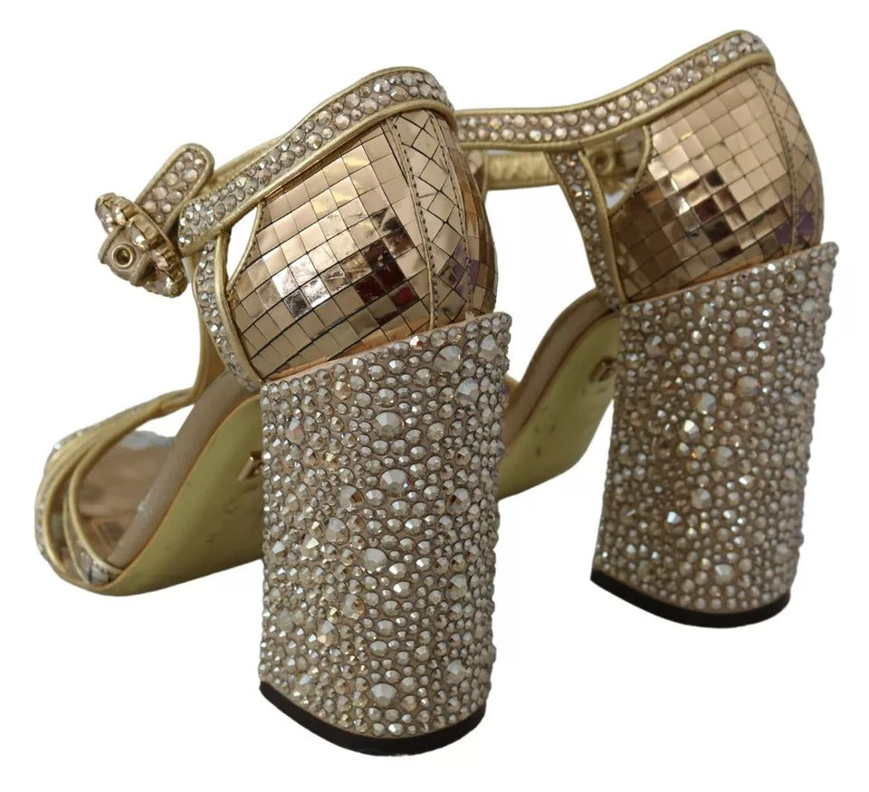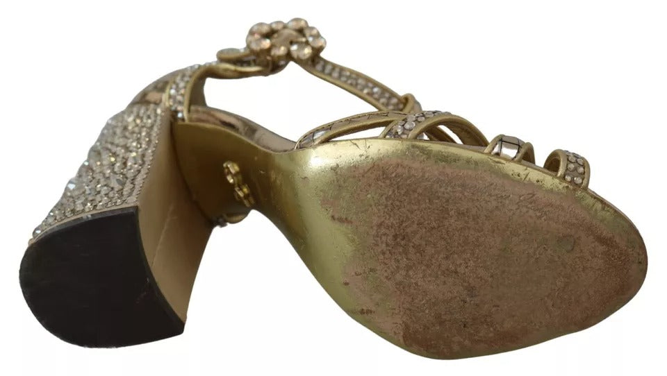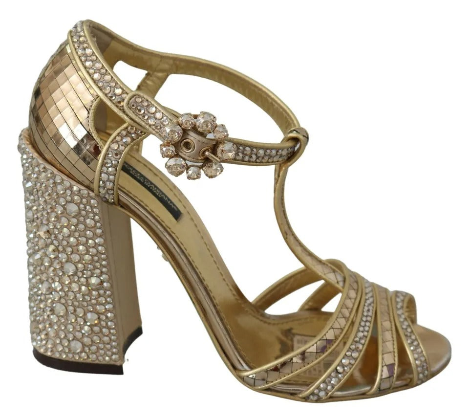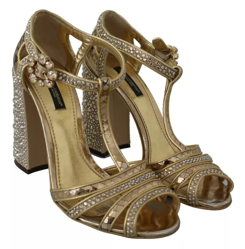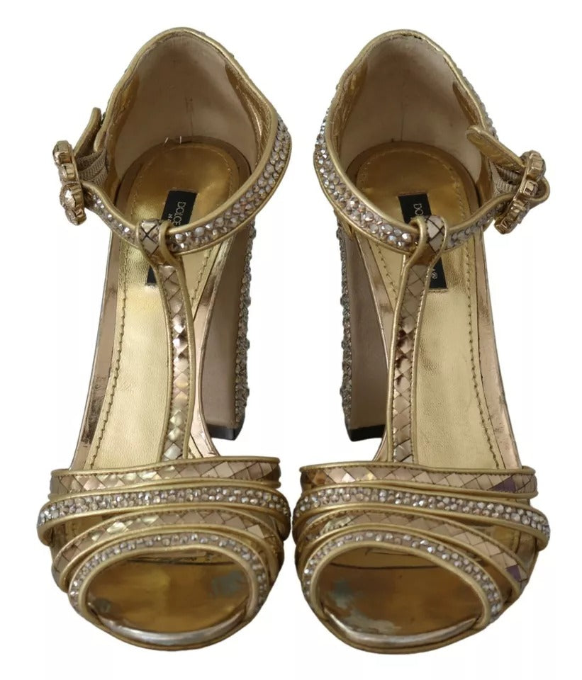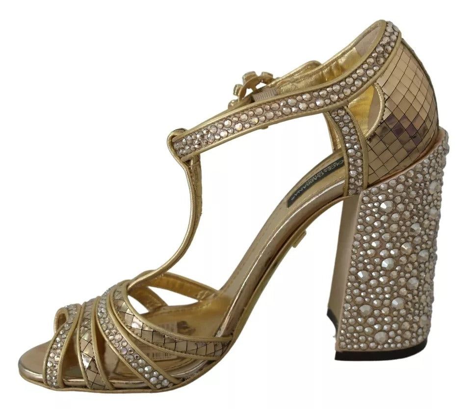 Gorgeous pre-owned with tags, 100% Authentic Dolce & Gabbana gold leather t-strap heels shoes with clear crystals.
