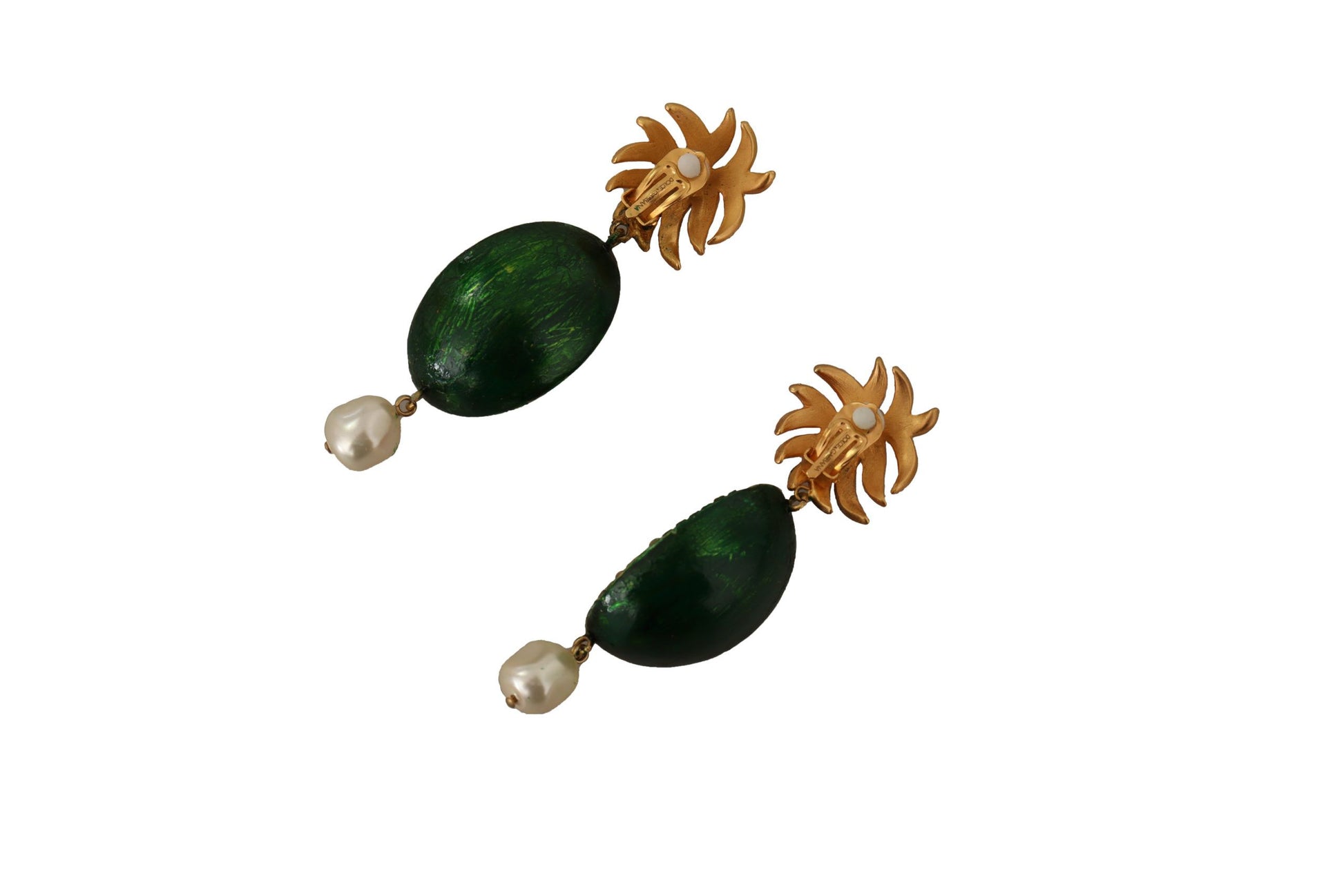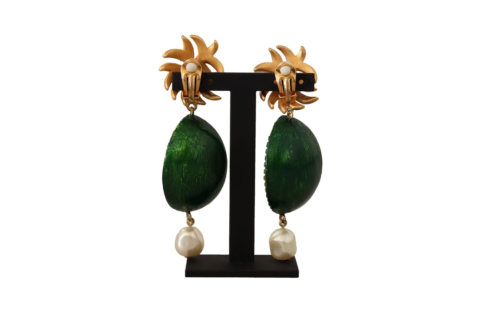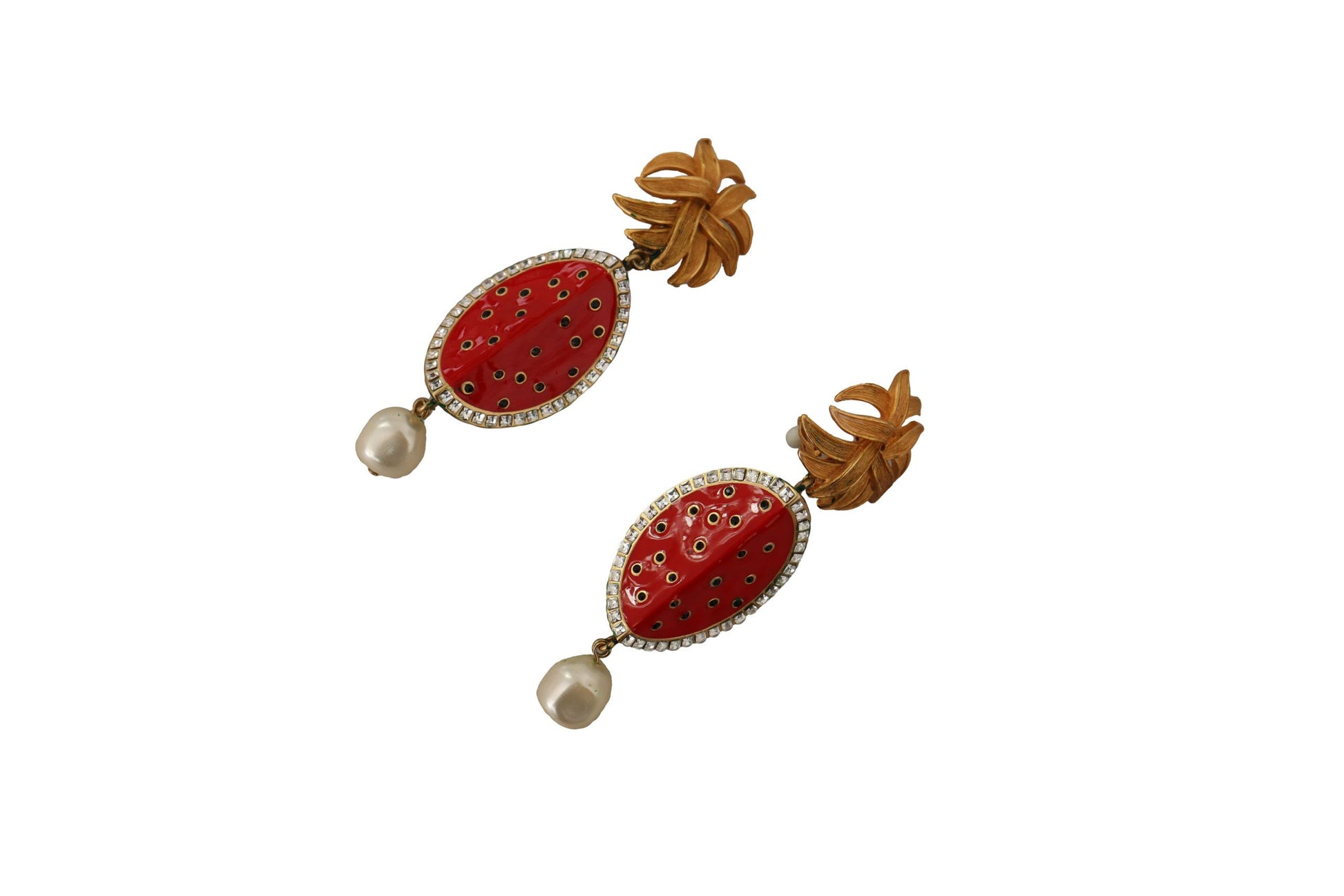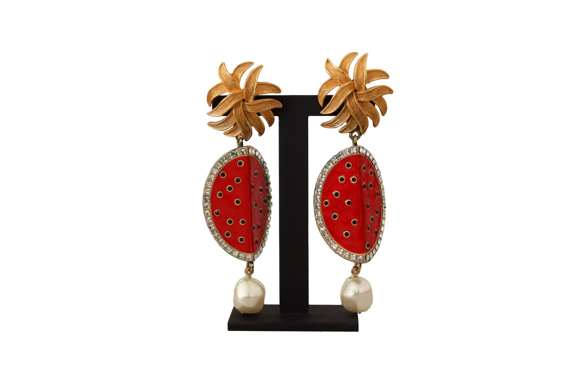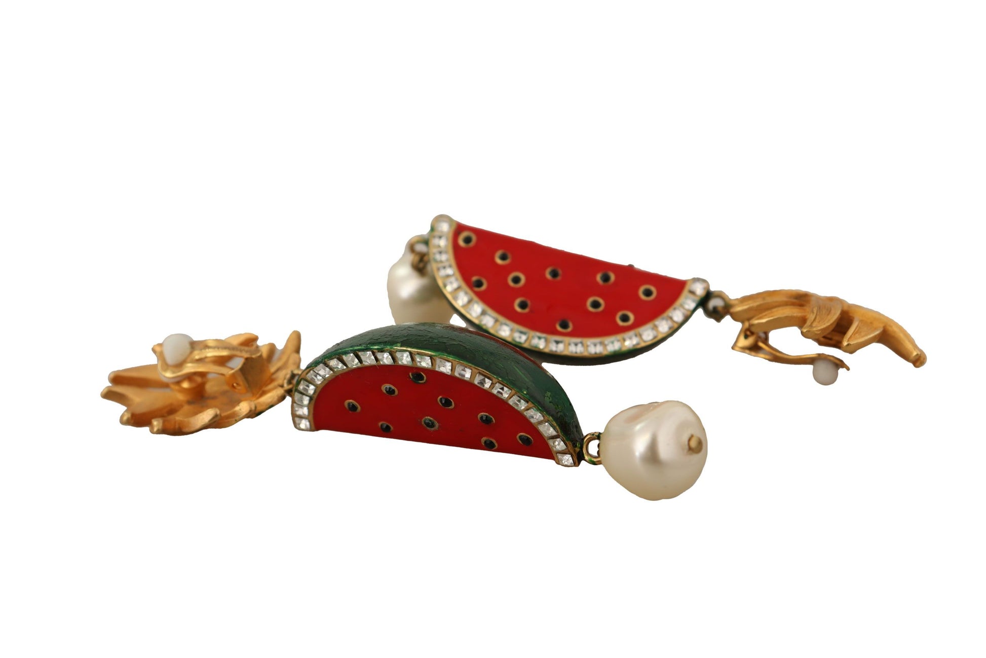 Indulge in the opulence of these stunning dangling clip-on earrings by Dolce & Gabbana. Exquisitely crafted, they feature a vibrant Sicilian melon motif that adds a burst of color to any ensemble. Embellished with clear crystals, these earrings shimmer with every movement. Their eclectic design embodies the brand’s renowned Italian craftsmanship and signature style, promising to make a statement wherever you go.