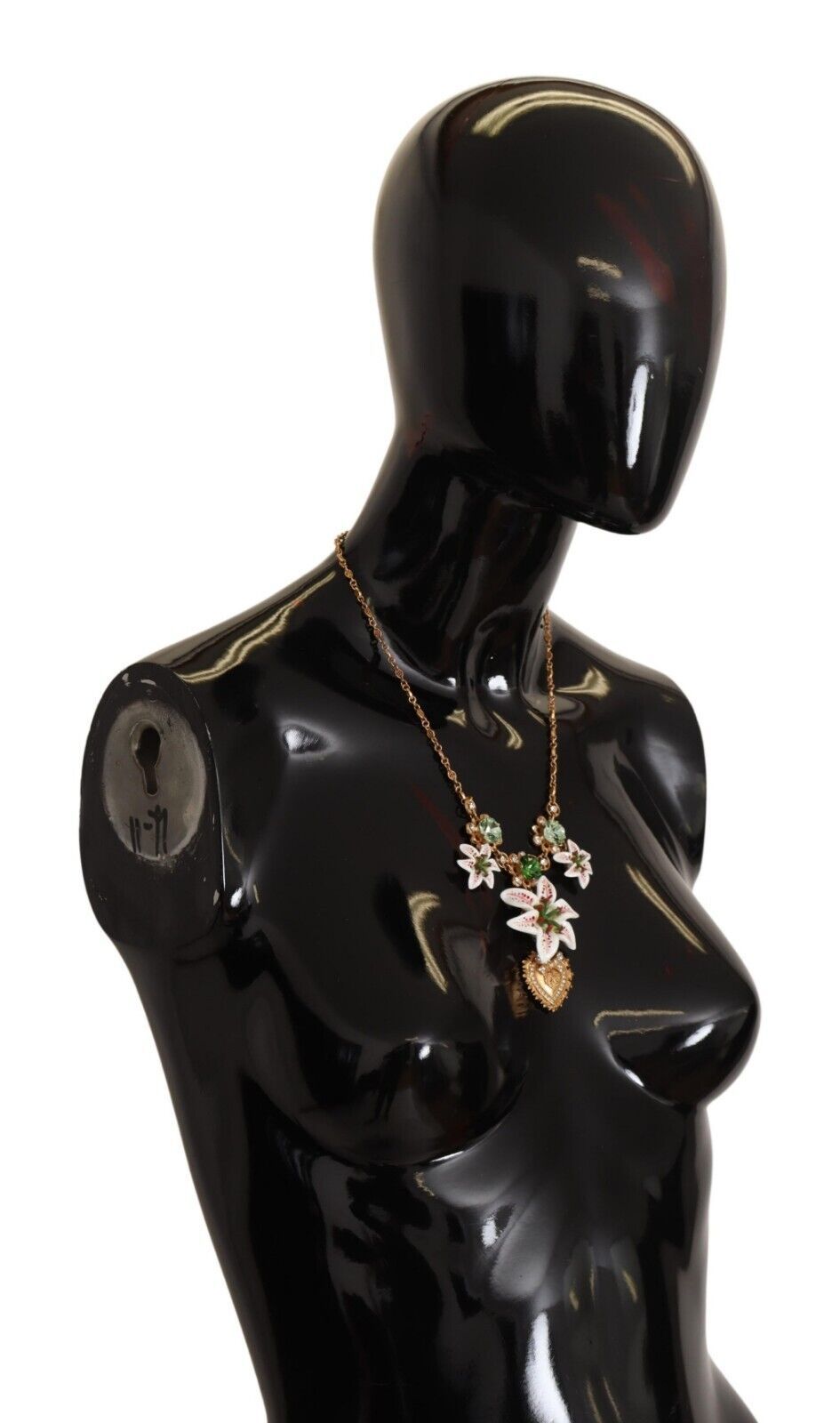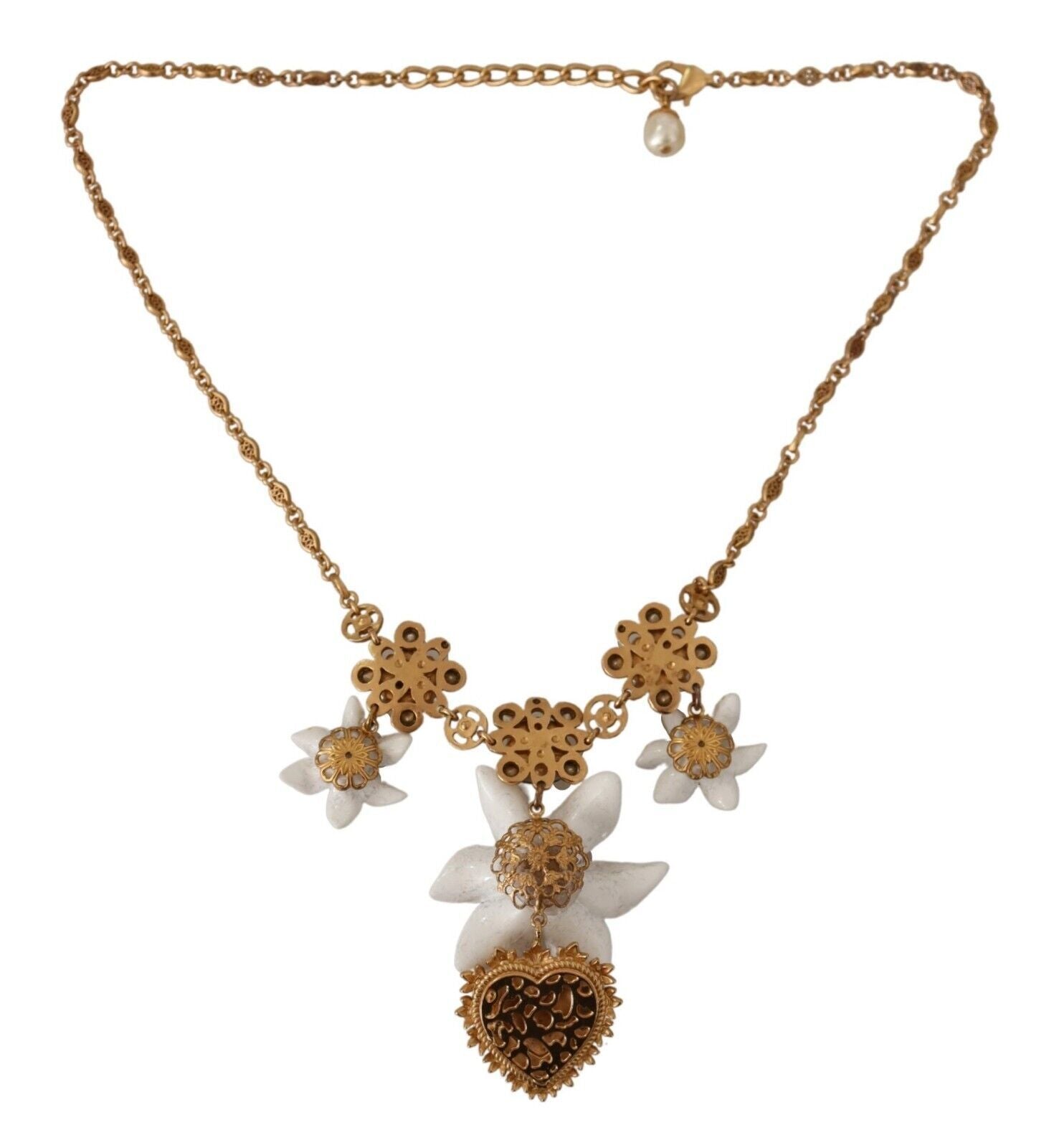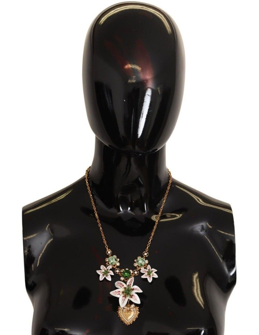 Adorn your neckline with the shimmering elegance of this Dolce & Gabbana gold plated charms crystal necklace. Gorgeous and brand new with tags, this exquisite piece is sure to lend an air of luxury to any outfit. Expertly crafted from high-quality materials, with a blend of brass, glass, and crystal, its lustrous gold tone is complemented by green and clear crystals. Its lobster clasp closure ensures a secure fit, while the logo details affirm its authenticity.