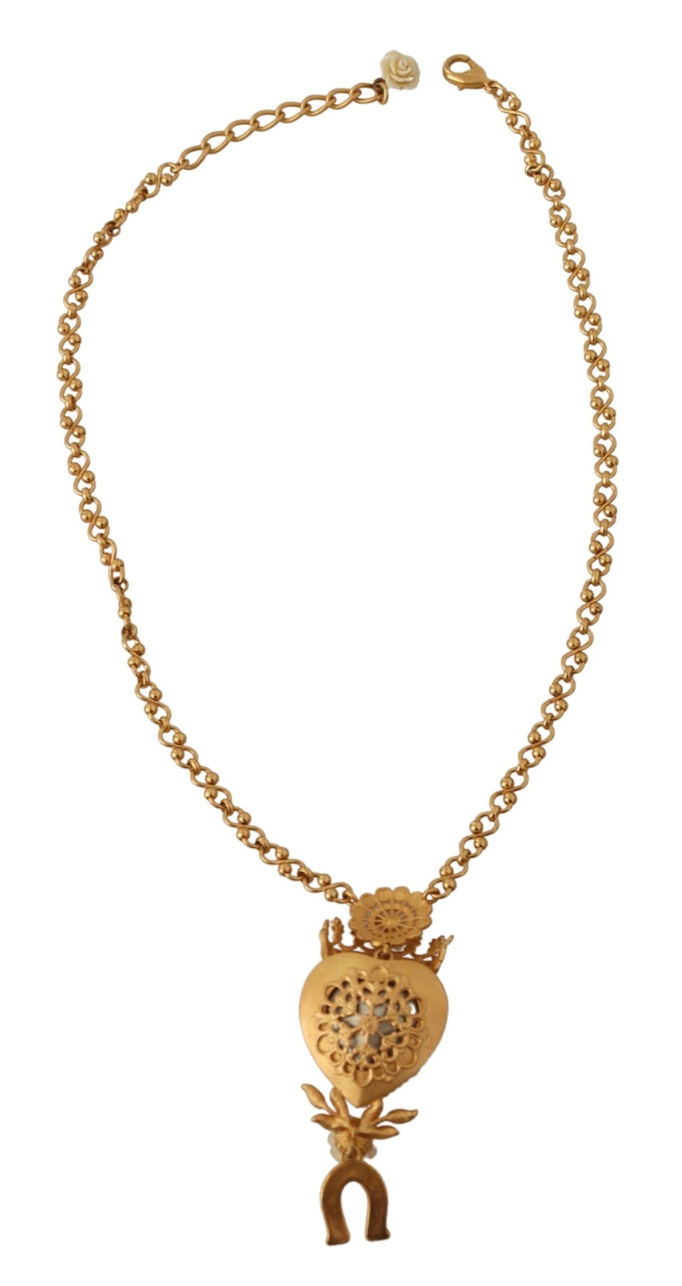 Indulge in the opulence of this exquisite Dolce & Gabbana necklace, a perfect blend of elegance and charm. A standout piece featuring a Heart Crown Floral Horseshoe Crystal Pendant that promises to elevate any ensemble. Its gold tone complements the multicolor crystals, making it a versatile accessory for day or night.